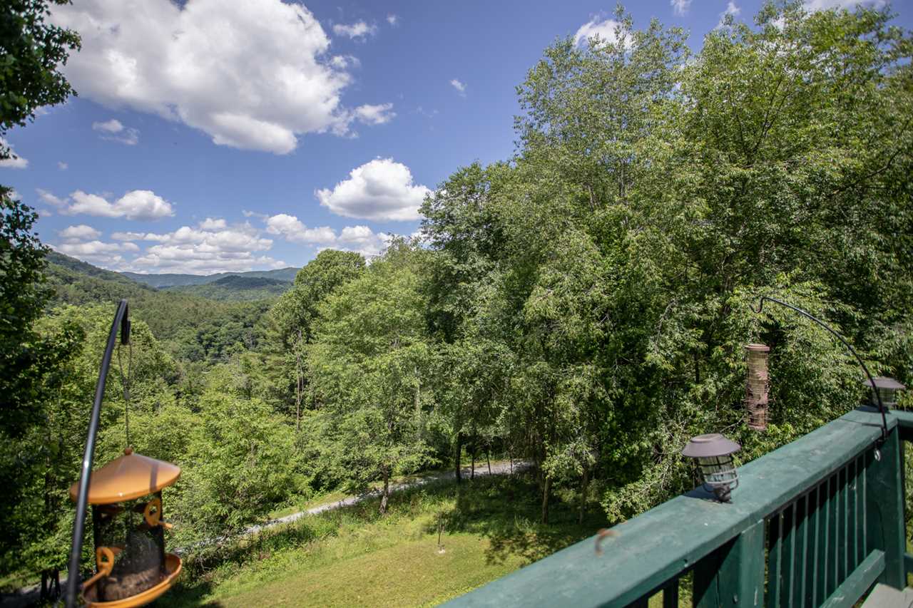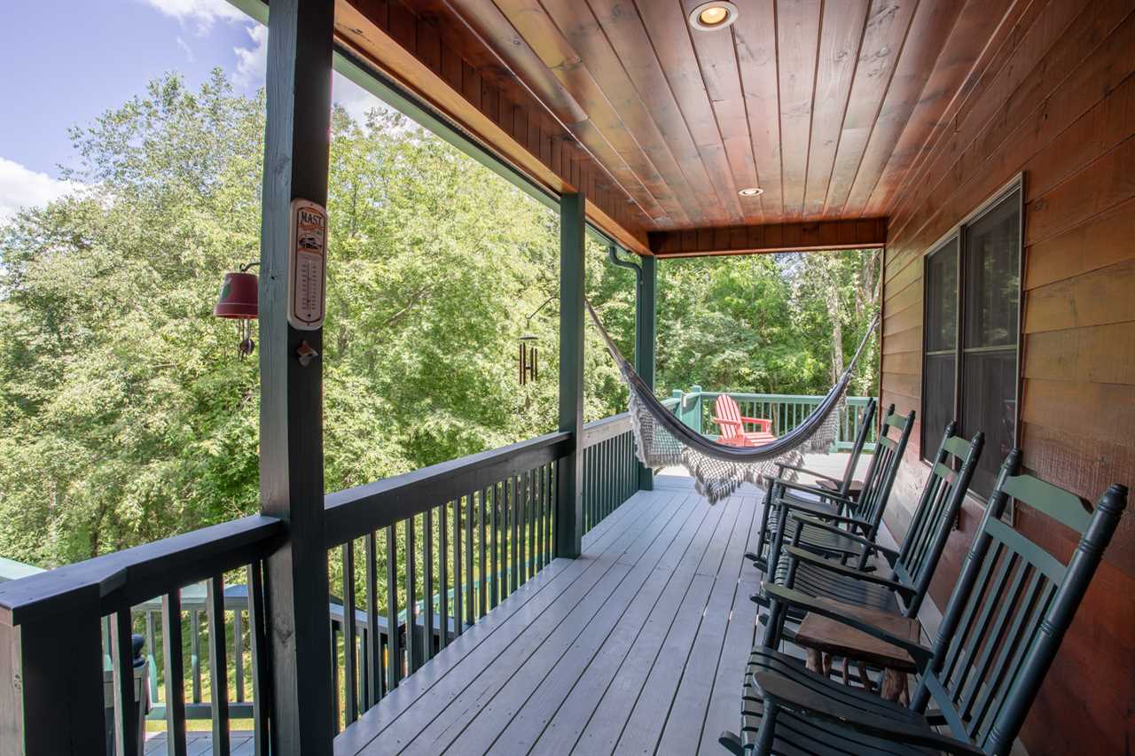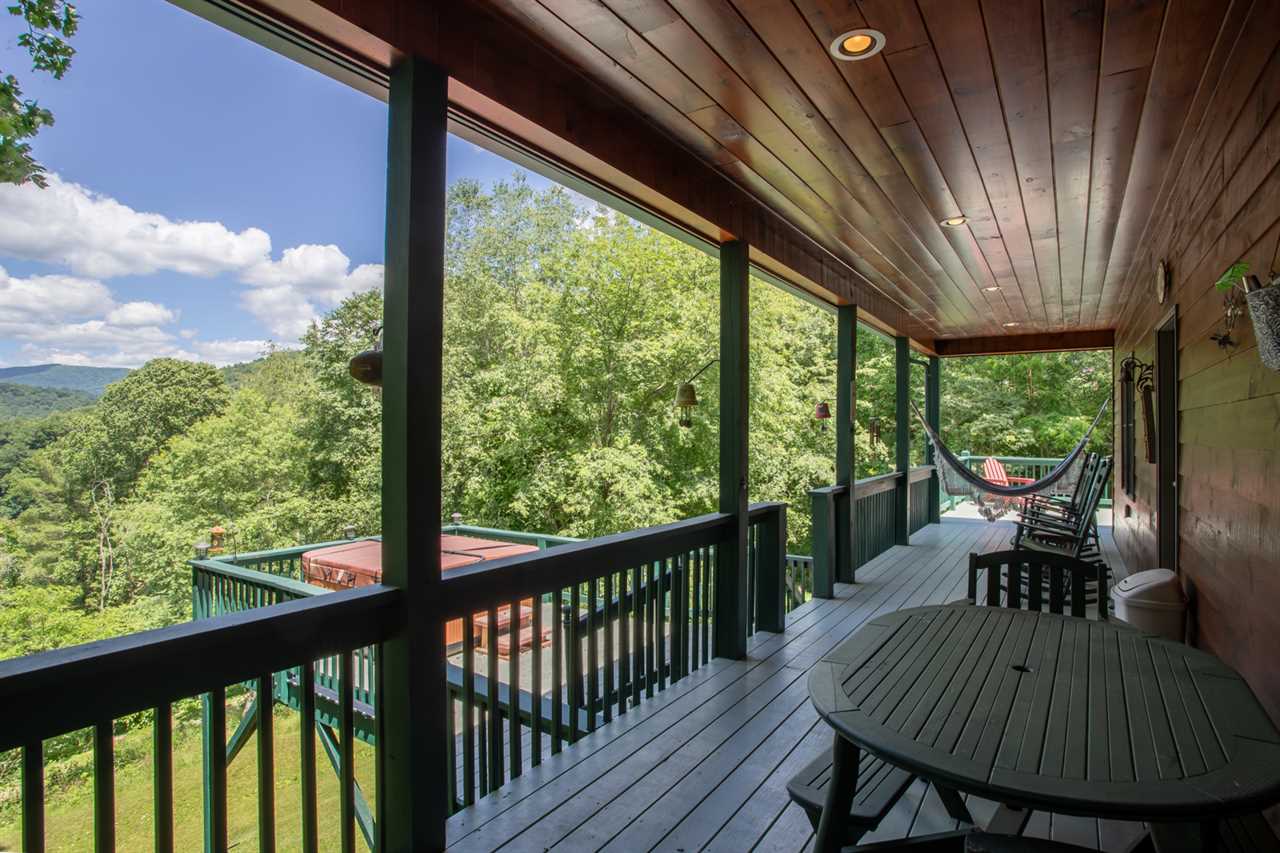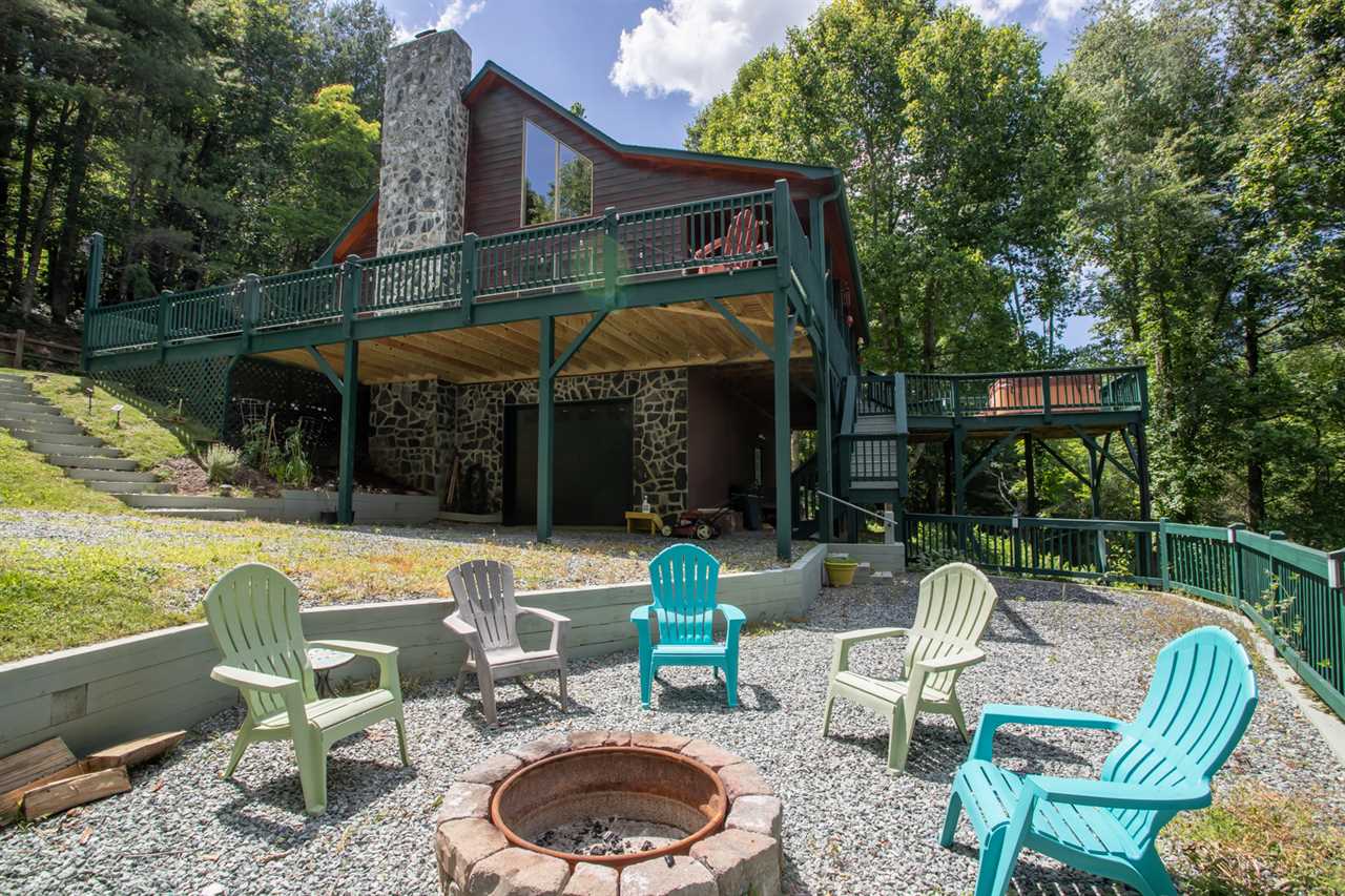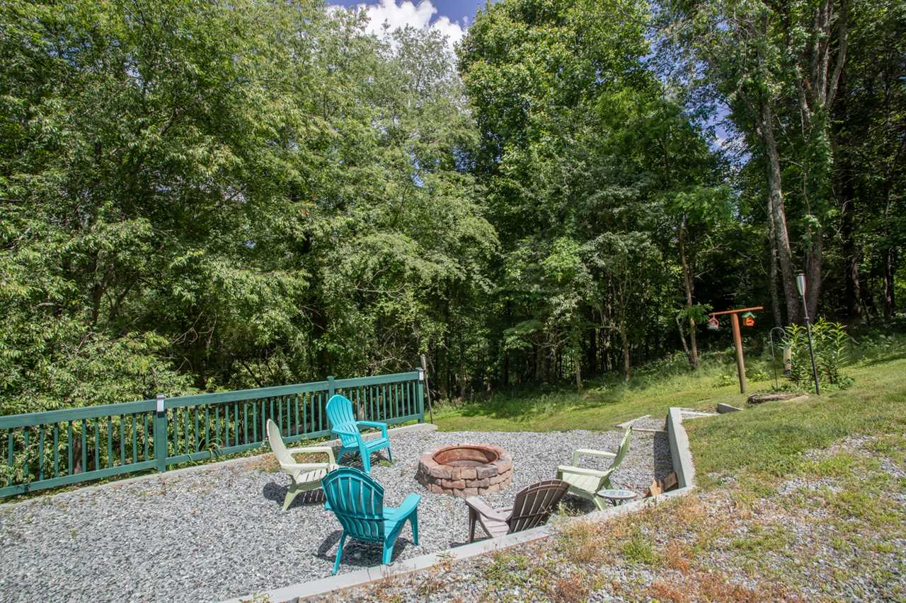 River Valley View is a charming, upscale 3BR/3BA cabin in Valle Crucis, situated in a scenic setting surrounded by old-growth hardwoods on three sides and offering mountain views toward the Watauga River, which is an easy walk away! There is a hot tub, a fire pit, and a huge deck, partly covered and partly open, which wraps around the side and to the front. Outdoor dining, a gas grill, plenty of seating, and a comfy hammock complete the expansive deck space. There is a private, upper-level master suite with a king-sized bed. The main level living room features wood floors, vaulted ceilings, a stone fireplace, and an HD Smart TV. It is open to the dining area and the kitchen, which boasts stainless steel appliances and custom granite countertops. The lower level features a game room with a foosball table. A third bathroom serves the lower level.