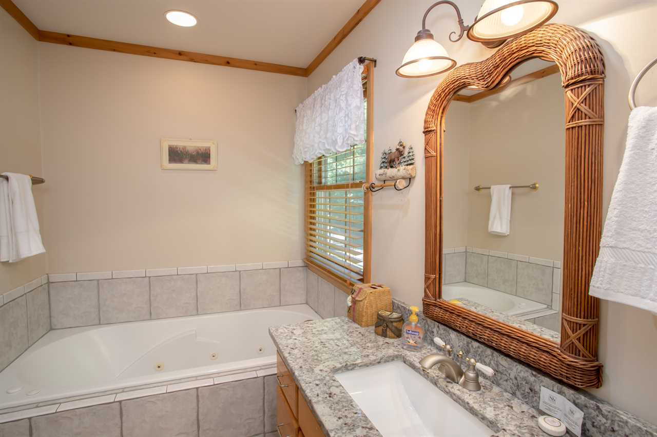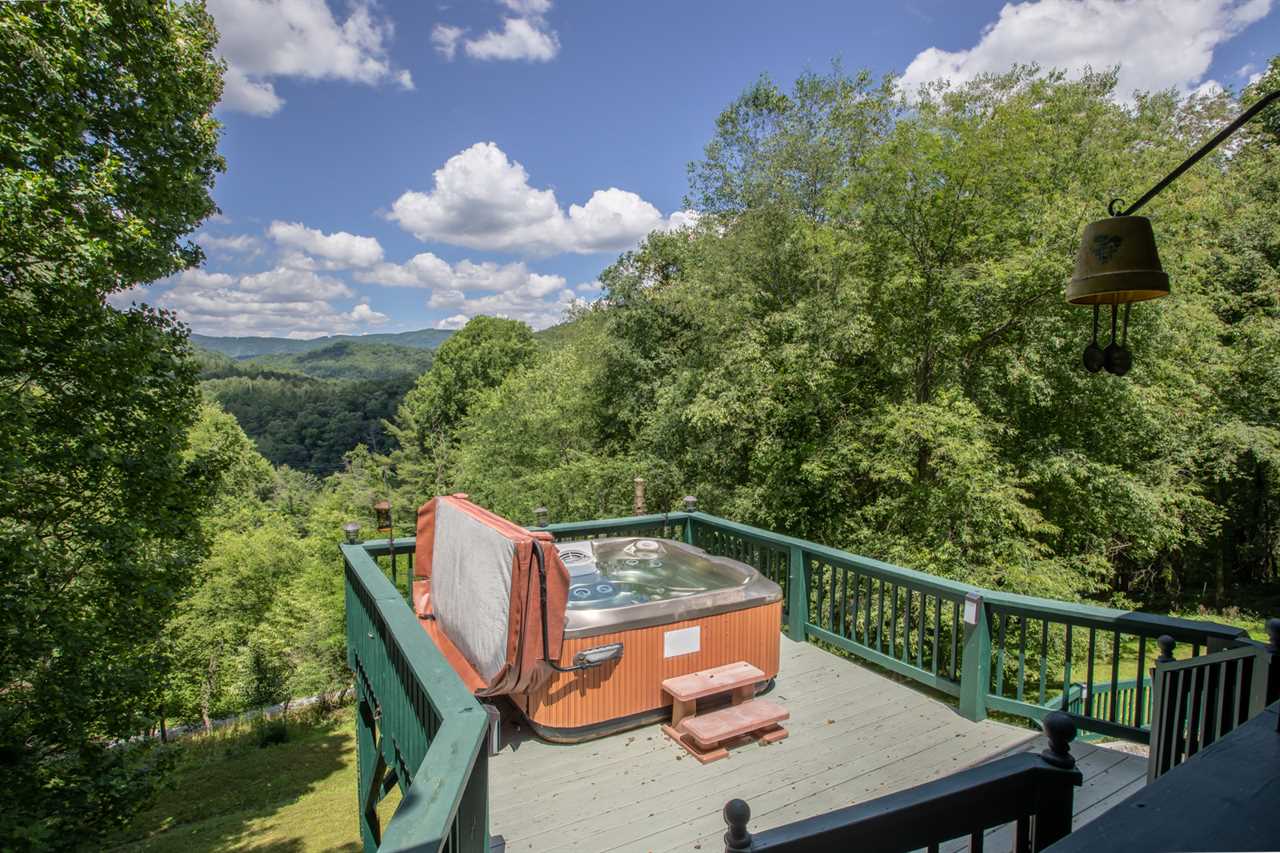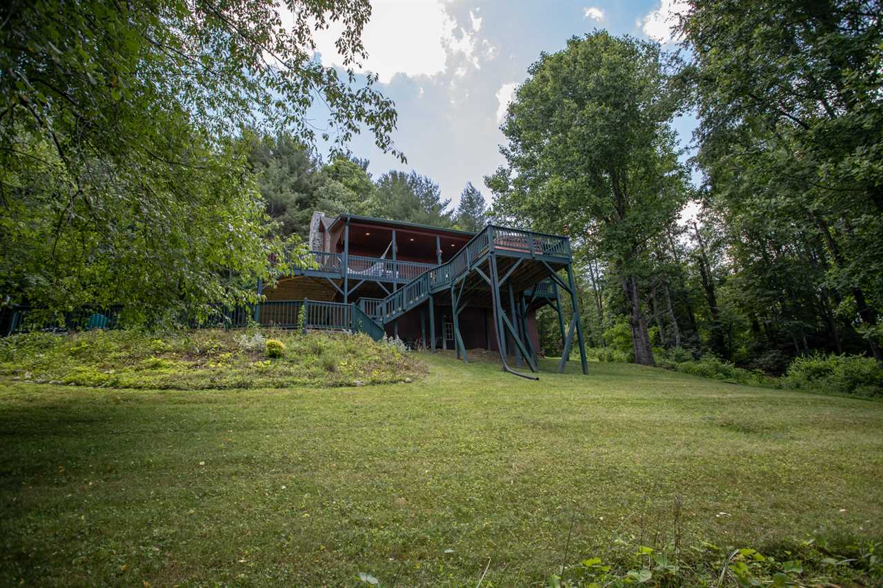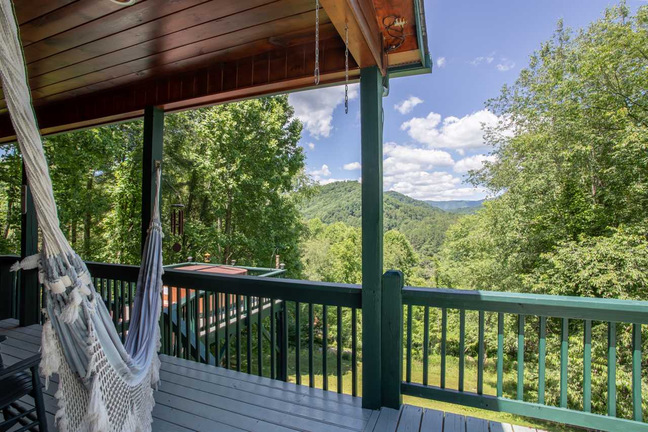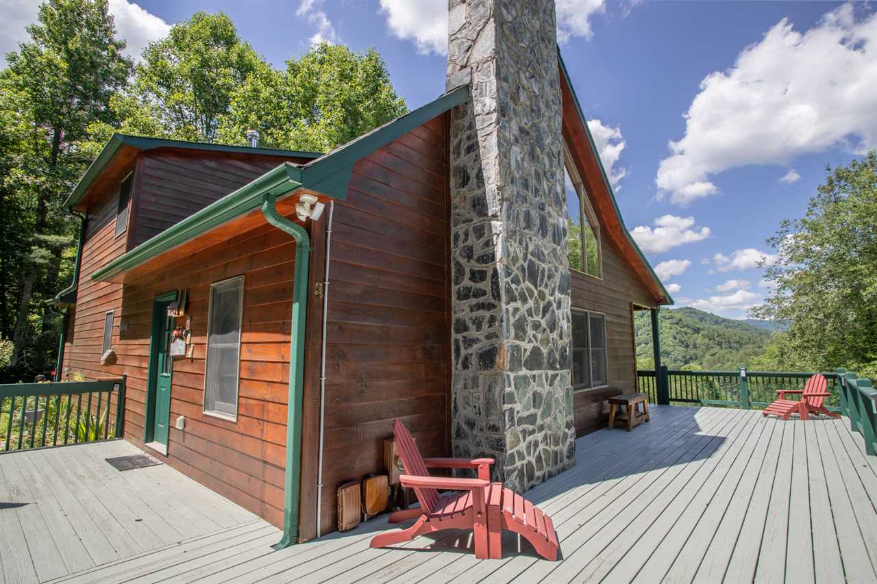 River Valley View is a charming, upscale 3BR/3BA cabin in Valle Crucis, situated in a scenic setting surrounded by old-growth hardwoods on three sides and offering mountain views toward the Watauga River, which is an easy walk away! There is a hot tub, a fire pit, and a huge deck, partly covered and partly open, which wraps around the side and to the front. Outdoor dining, a gas grill, plenty of seating, and a comfy hammock complete the expansive deck space. There is a private, upper-level master suite with a king-sized bed. The main level living room features wood floors, vaulted ceilings, a stone fireplace, and an HD Smart TV. It is open to the dining area and the kitchen, which boasts stainless steel appliances and custom granite countertops. The lower level features a game room with a foosball table. A third bathroom serves the lower level.