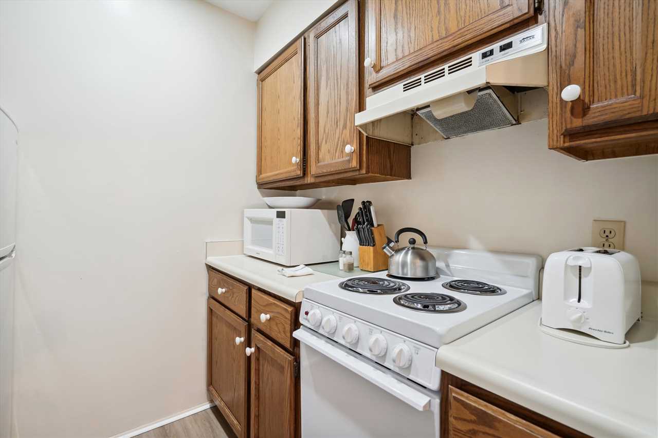 Full kitchen with refrigerator, stove, microwave, Keurig coffeemaker, and toaster
