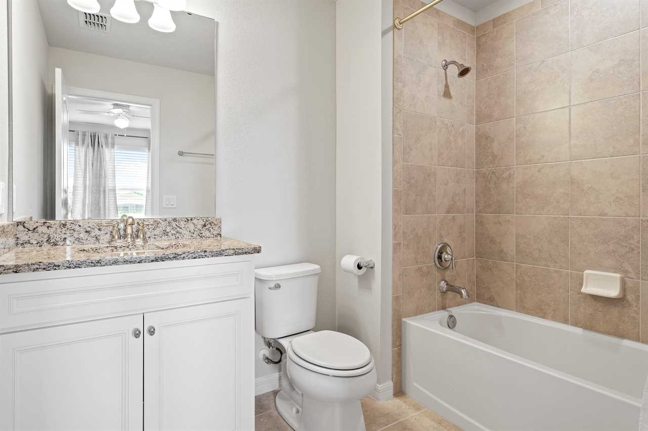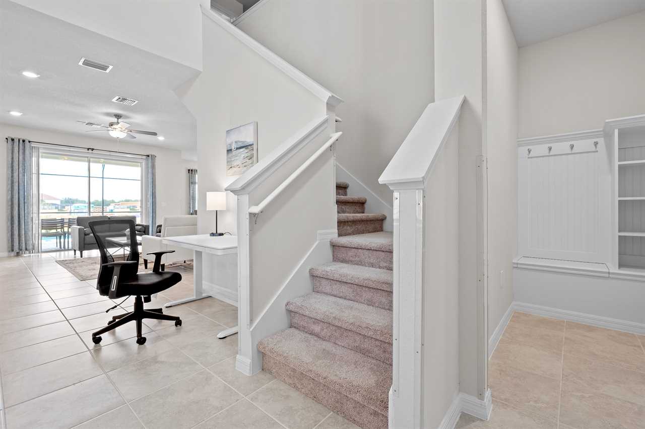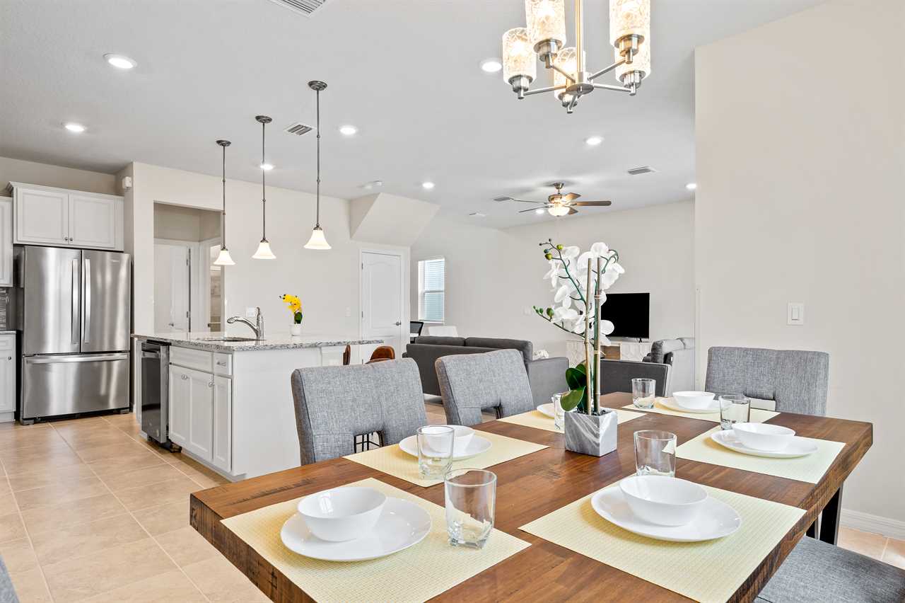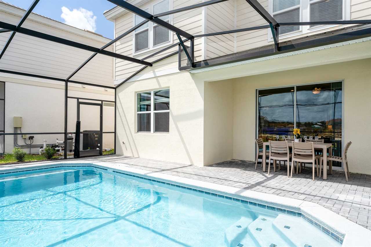 The great room sliding doors open up to the lanai and pool deck, serving as an extension of the shared space you ll enjoy with family and friends during your Florida vacation. Lunch poolside at the patio dining table for 6, or take a refreshing dip in the pool. The entire pool area is screened-in, keeping suburban critters out while letting the welcoming rays of the Florida sun in.