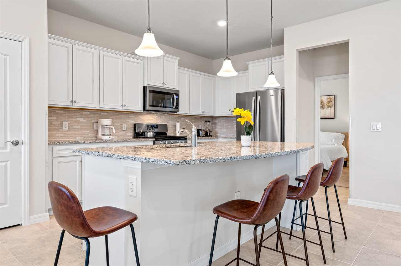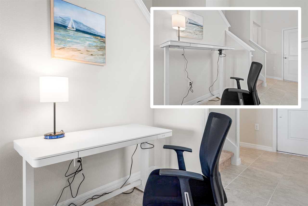 The bright and modern interior with neutral and aqua colors will give you a feeling of relaxation as soon as you enter the home. The great room includes a comfy living area before a large-screen TV and off to the side - a workstation. Catch up on your emails at the adjustable standing computer desk with an ergonomic chair - an essential for travelers nowadays! The fine dining table seats 6 while additional seating for 4 can be found at the elegant granite kitchen island. The kitchen area has all stainless steel appliances, a gas cooktop for the chef in the family, and it comes fully equipped with anything you'll need to prepare a home-cooked meal or store-and-reheat take-out.