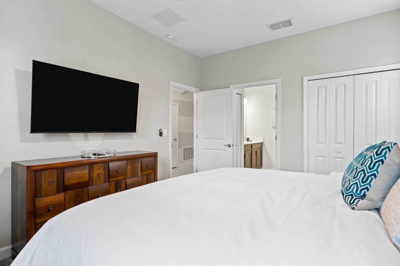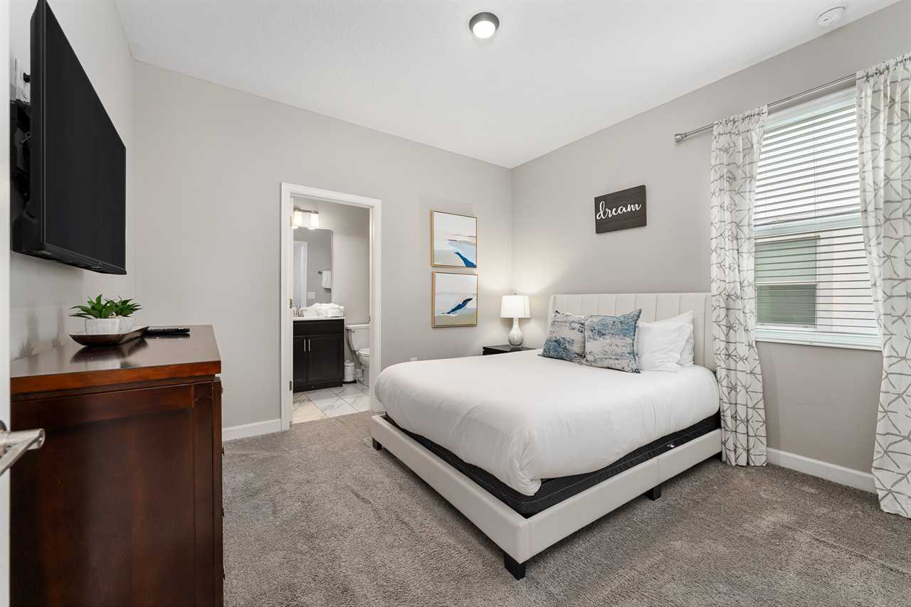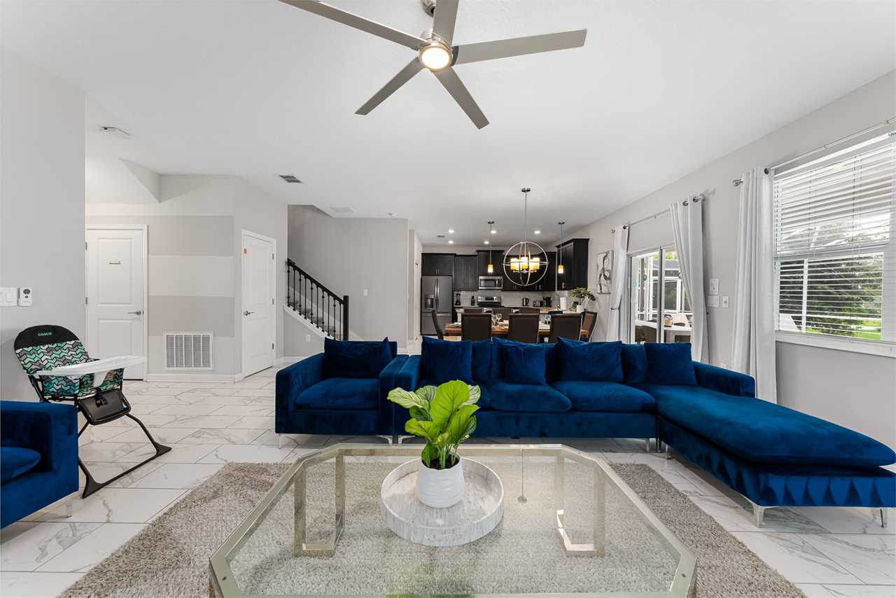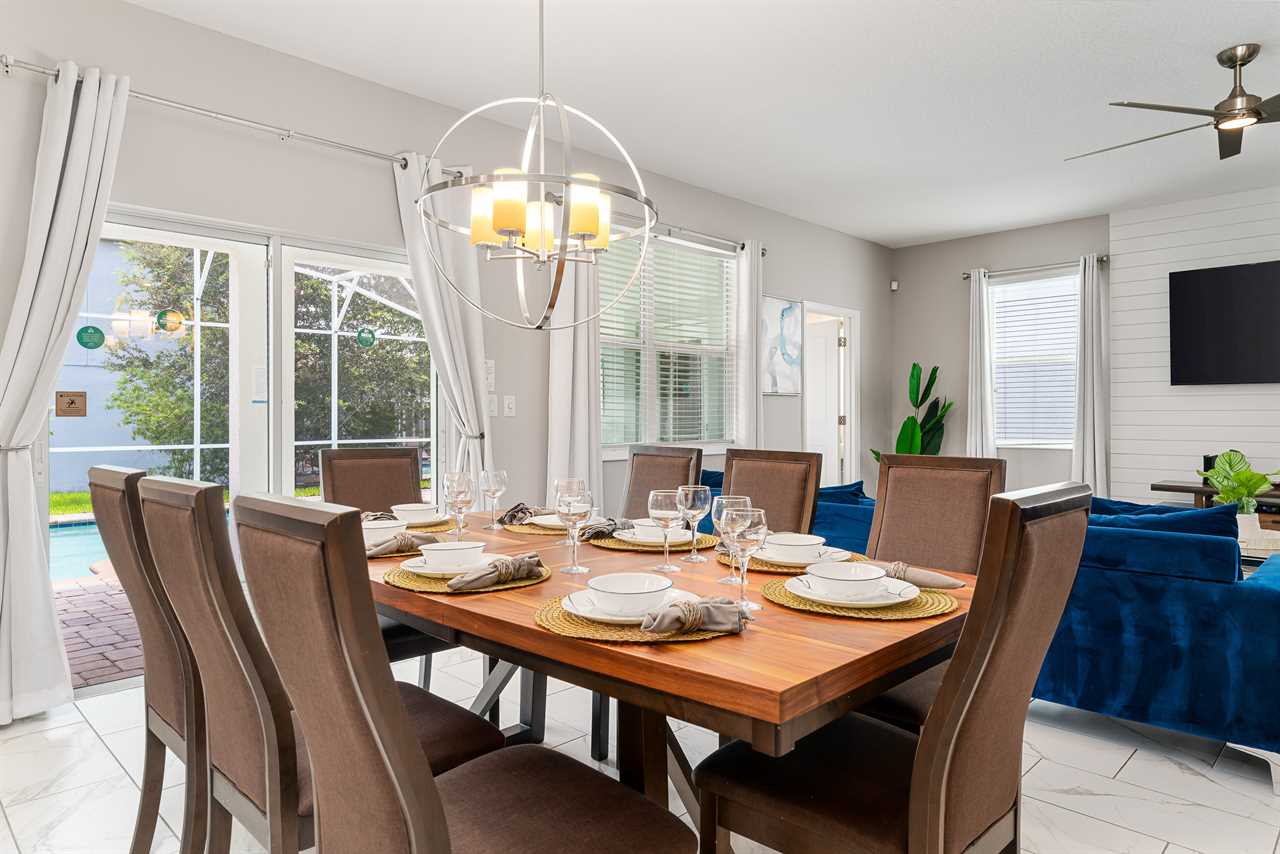 This home has a modern spacious layout with a great room including the living area, the kitchen, and the dining area. The living area consists of 2 comfy retractable couches and an armchair before a large screen TV. The kitchen has all stainless steel appliances and comes fully equipped so you can cook your own meals or store & reheat take-out. Serve it up at the kitchen counter with bar seating for 4, or have a nice dinner at the formal dining table seating 8.