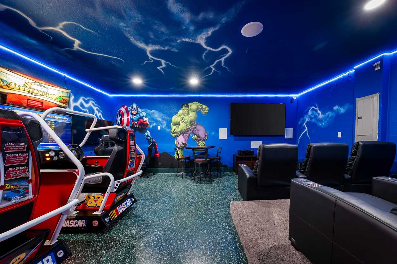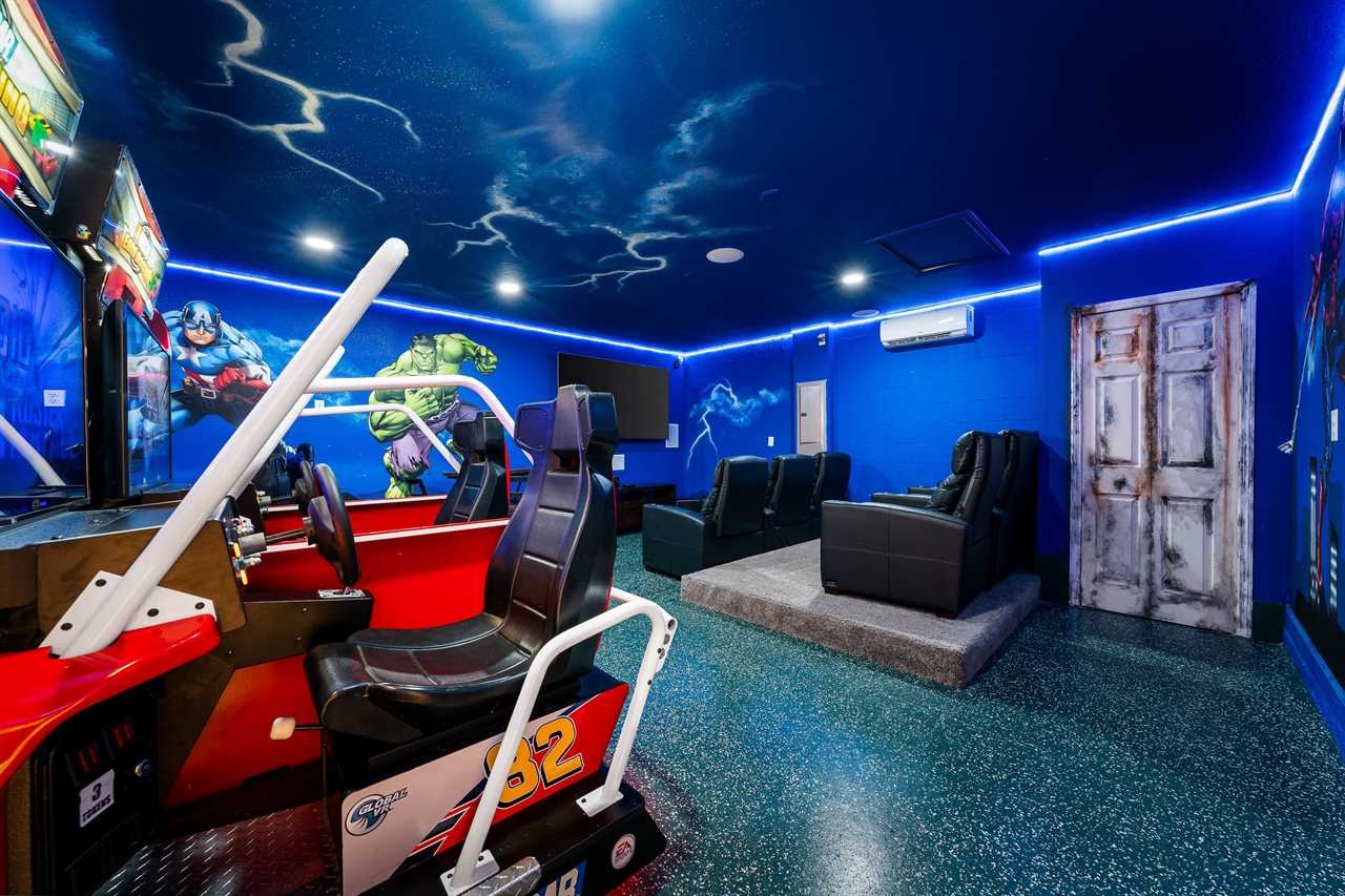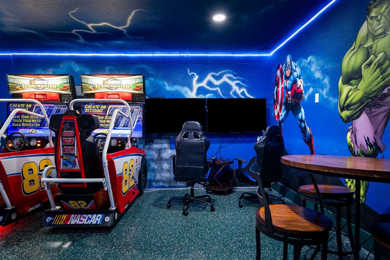 This home really turns up the entertainment with a newly renovated first-floor Theater/Arcade. Enjoy theater-style seating for six and take in the latest movie with the family, or step up the competition with a commercial racing arcade inside your own vacation home. Two gaming station Smart TVs, one has a PS4 and the other one to an Xbox. No coins needed! The room also has high-top seating for three.