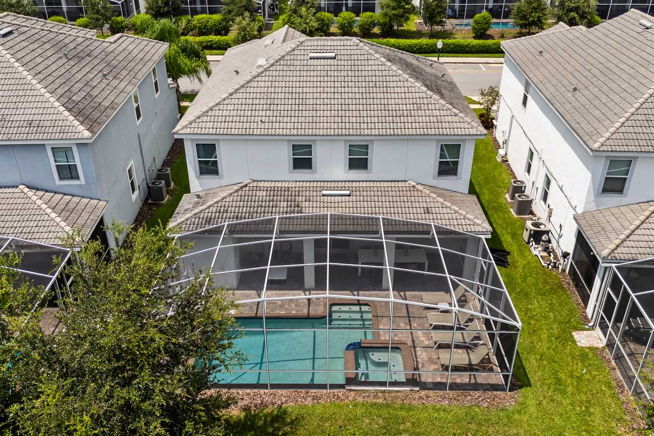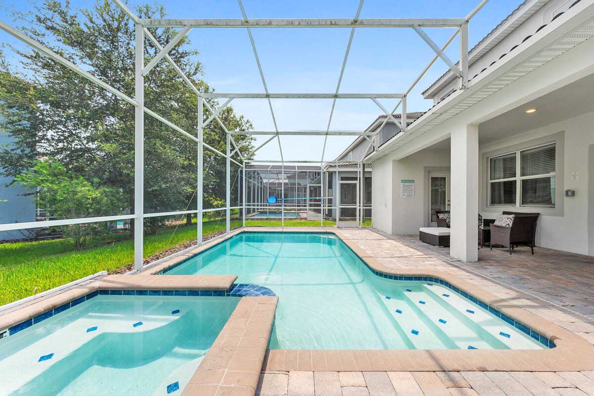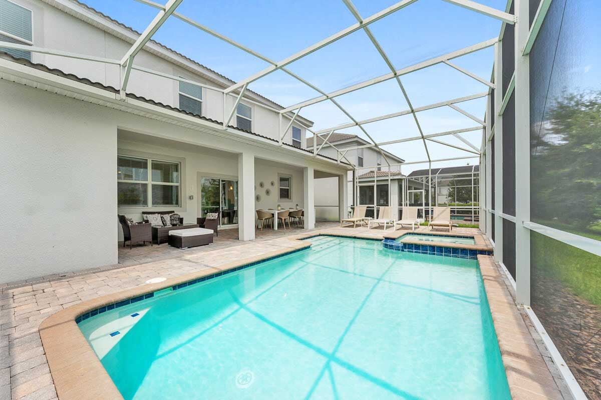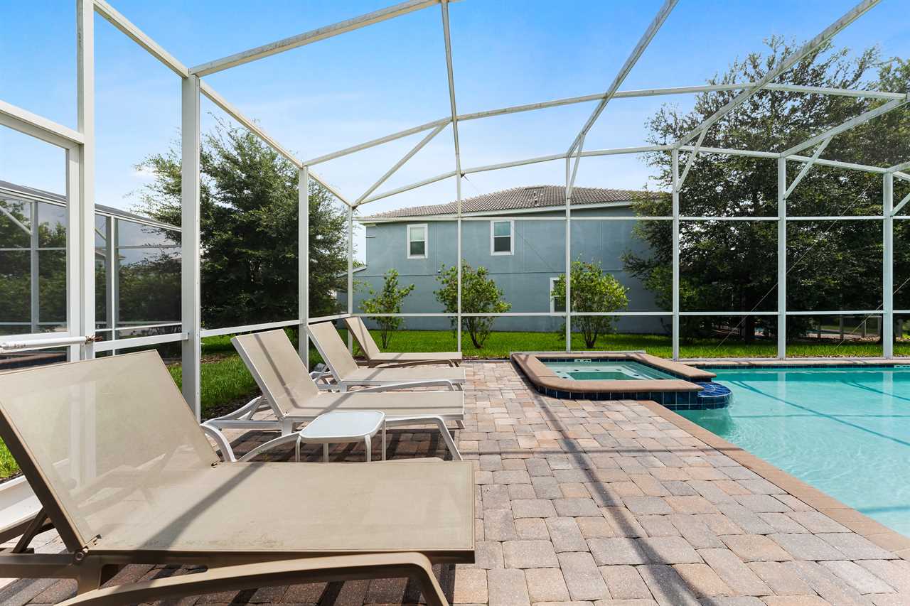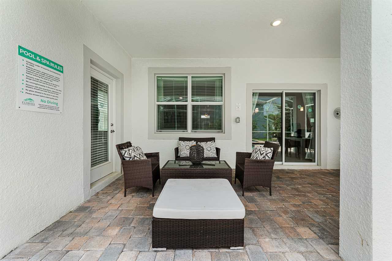 The entire pool deck is screened-in and there is a children's safety fence available. What is a Florida vacation without a pool? Relax in one of the sun loungers, take a cool dip in the pool, or soak in the spillover spa. Hungry? How about a poolside snack? The covered lanai has a nice set of patio furniture with a coffee table.