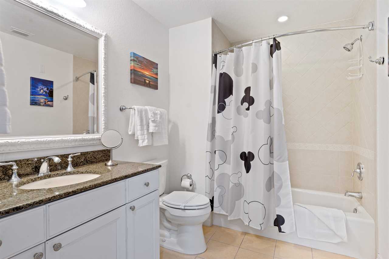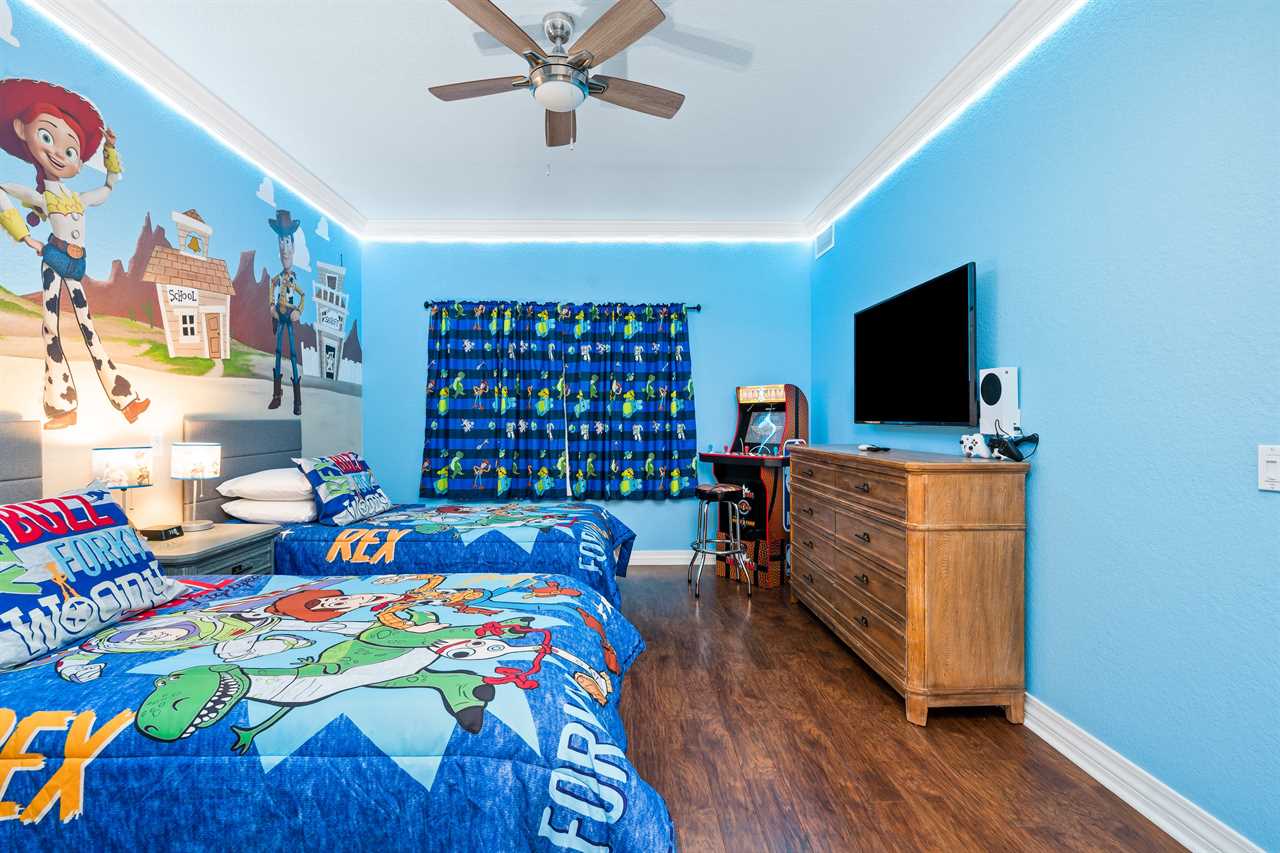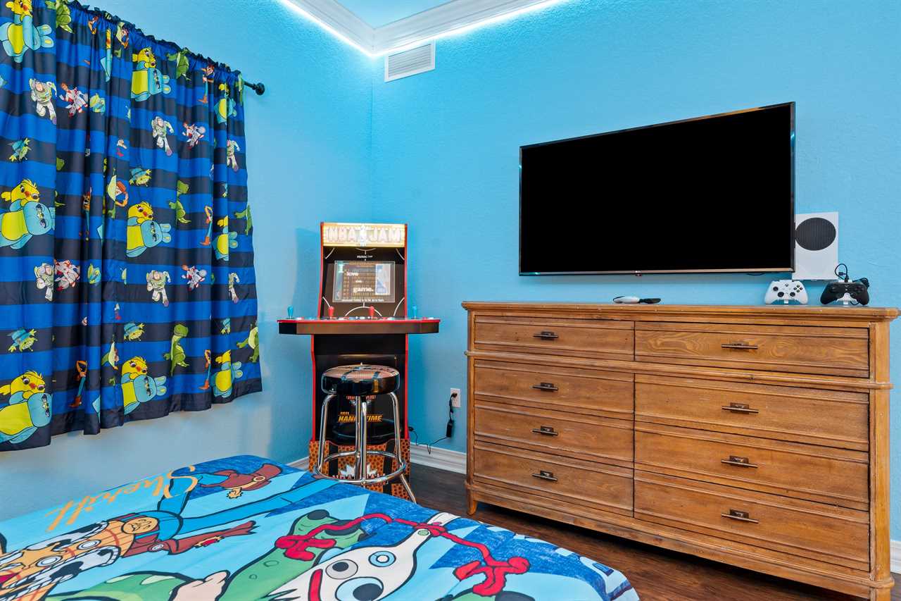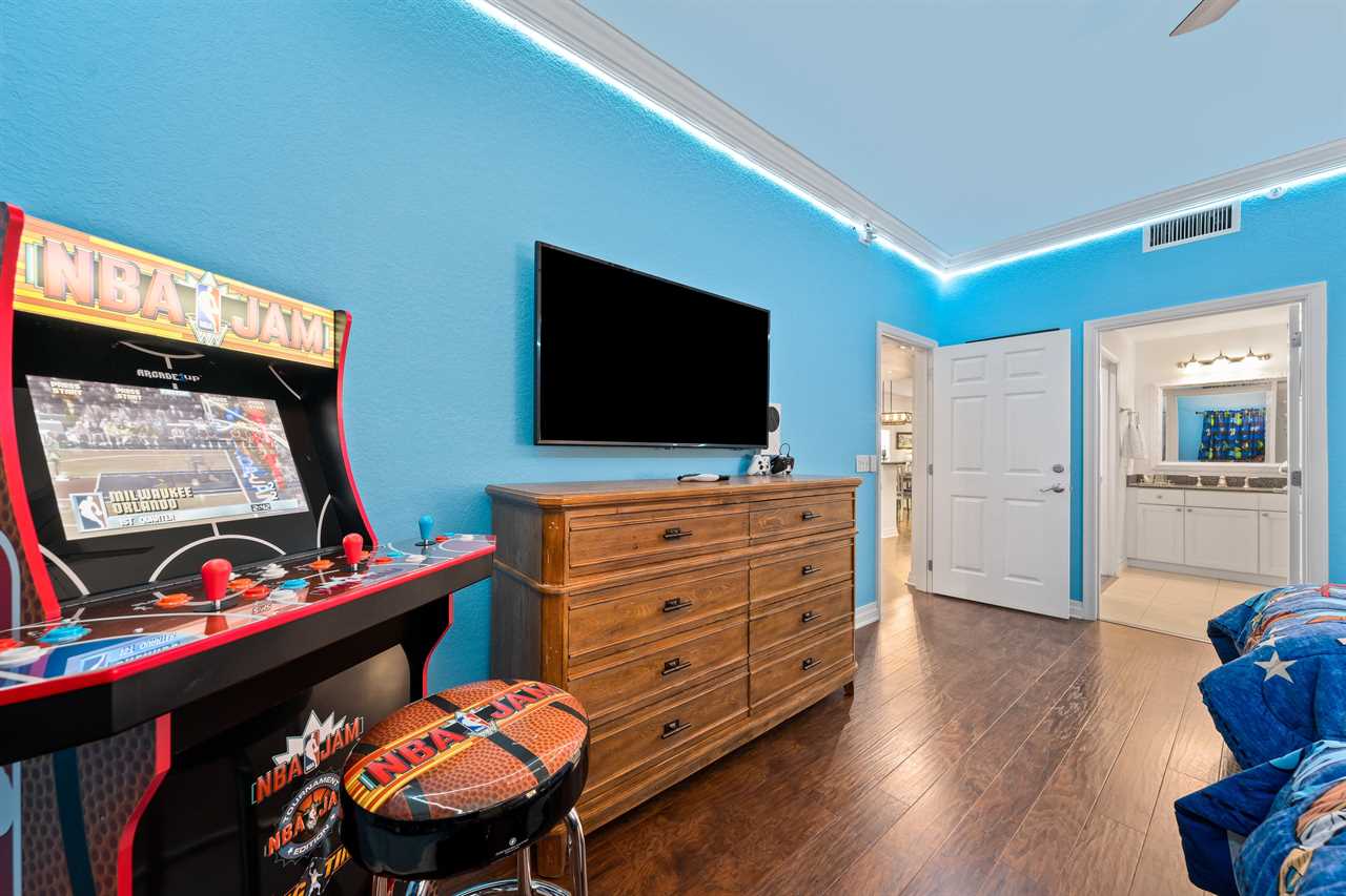 The kids can enjoy the Toy-Themed bedroom with two twin beds with trundles (Sleeps 4) a 55-inch SMART TV, a DVD player, and a stand-up NBA arcade game. The King Master bedroom includes a 60-inch SMART TV with a DVD Player and a bathroom with a tub/shower combo and single vanity. The third bedroom is a King Master that has patio access and includes a small work desk/station. There is a 55-inch SMART TV. The bathroom includes double vanity sinks, a shower, and a separate bathtub. Enjoy your next vacation in this beautiful condo, call or book online today!