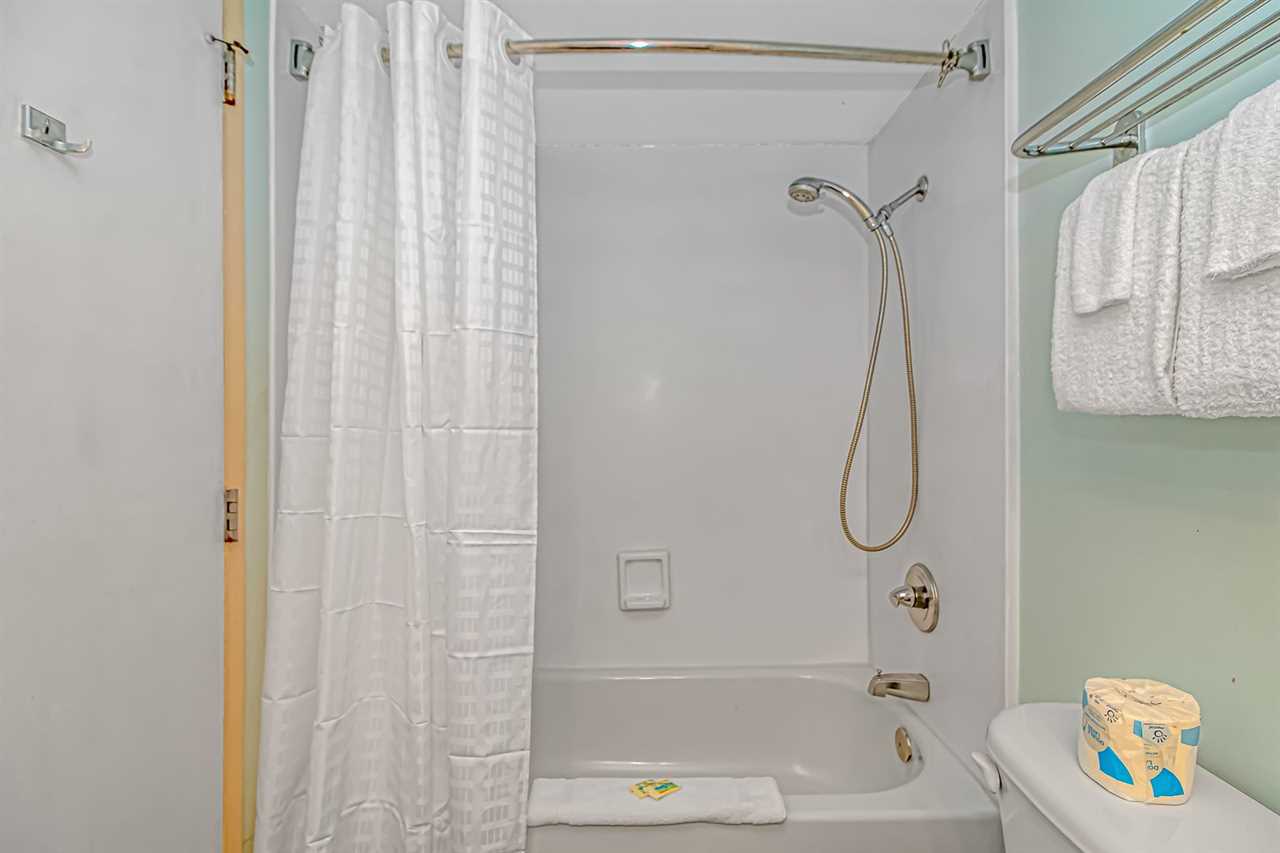 The studio features 2 full-size beds, a closet and dresser for storage, a TV with digital cable, and an AC unit. There is also an accent chair, dining table with chairs, and a full bathroom. Just behind the kitchen, the bathroom includes a tub/shower combo, vanity with sink and oversized counter space, a hair dryer, and a toilet.