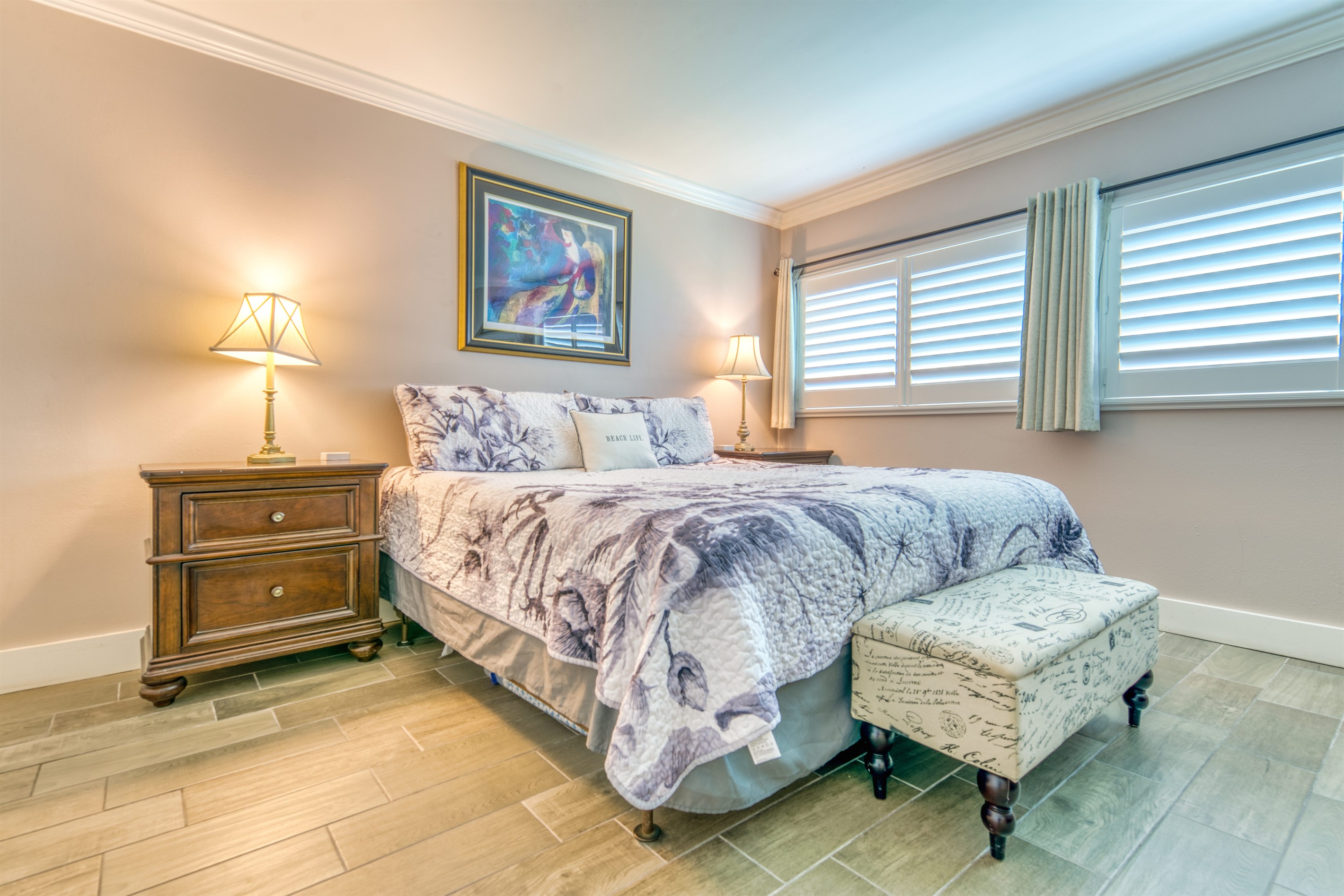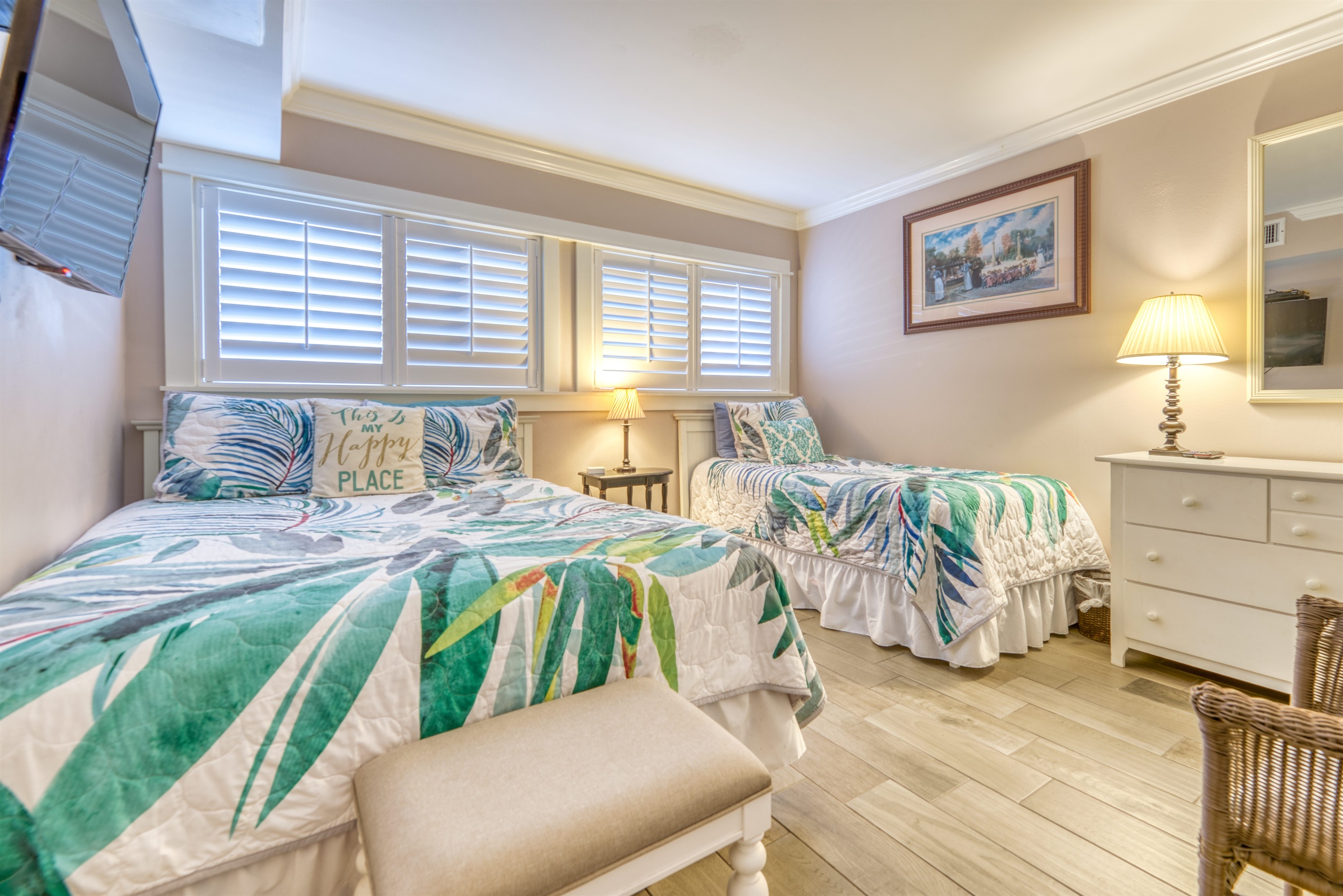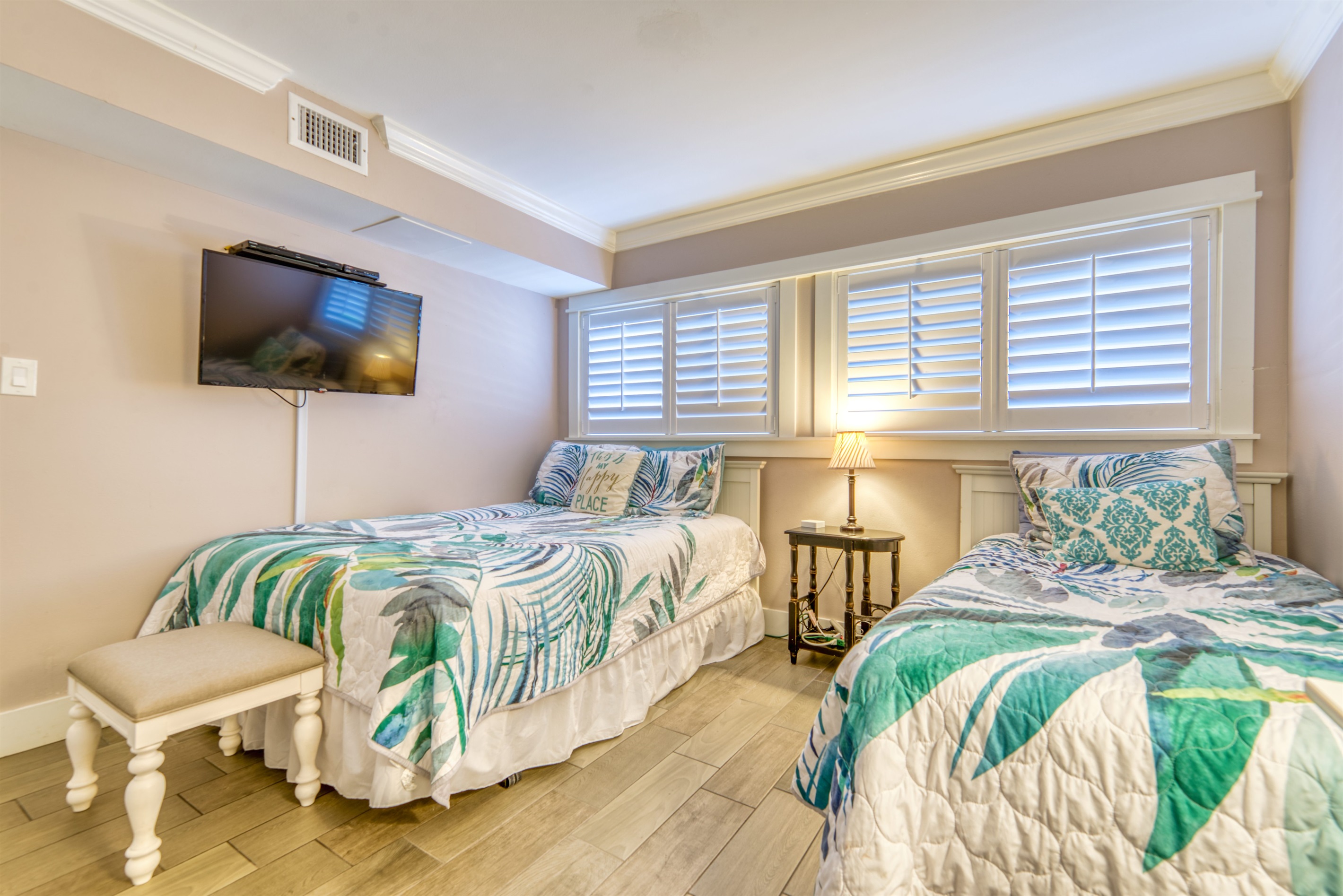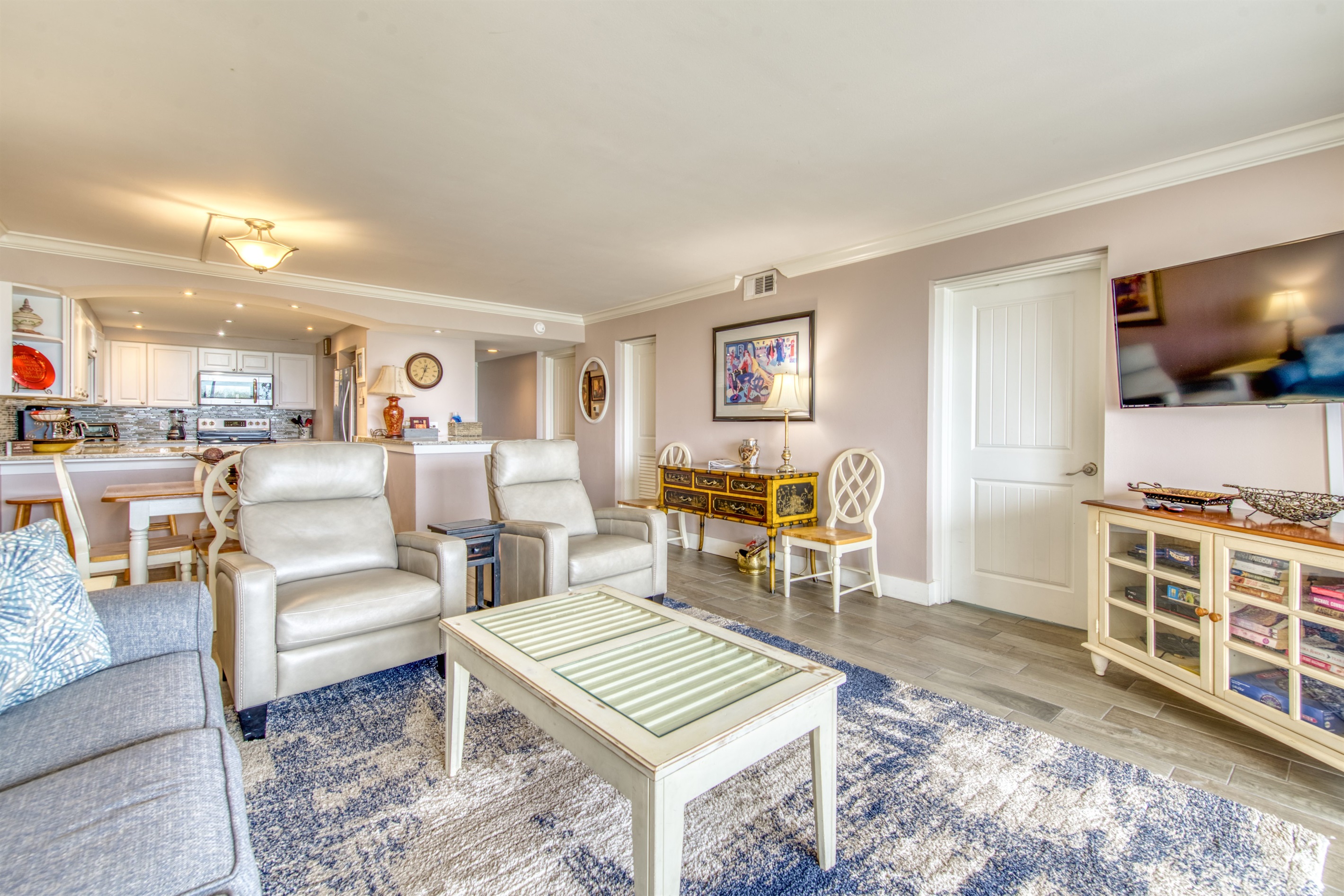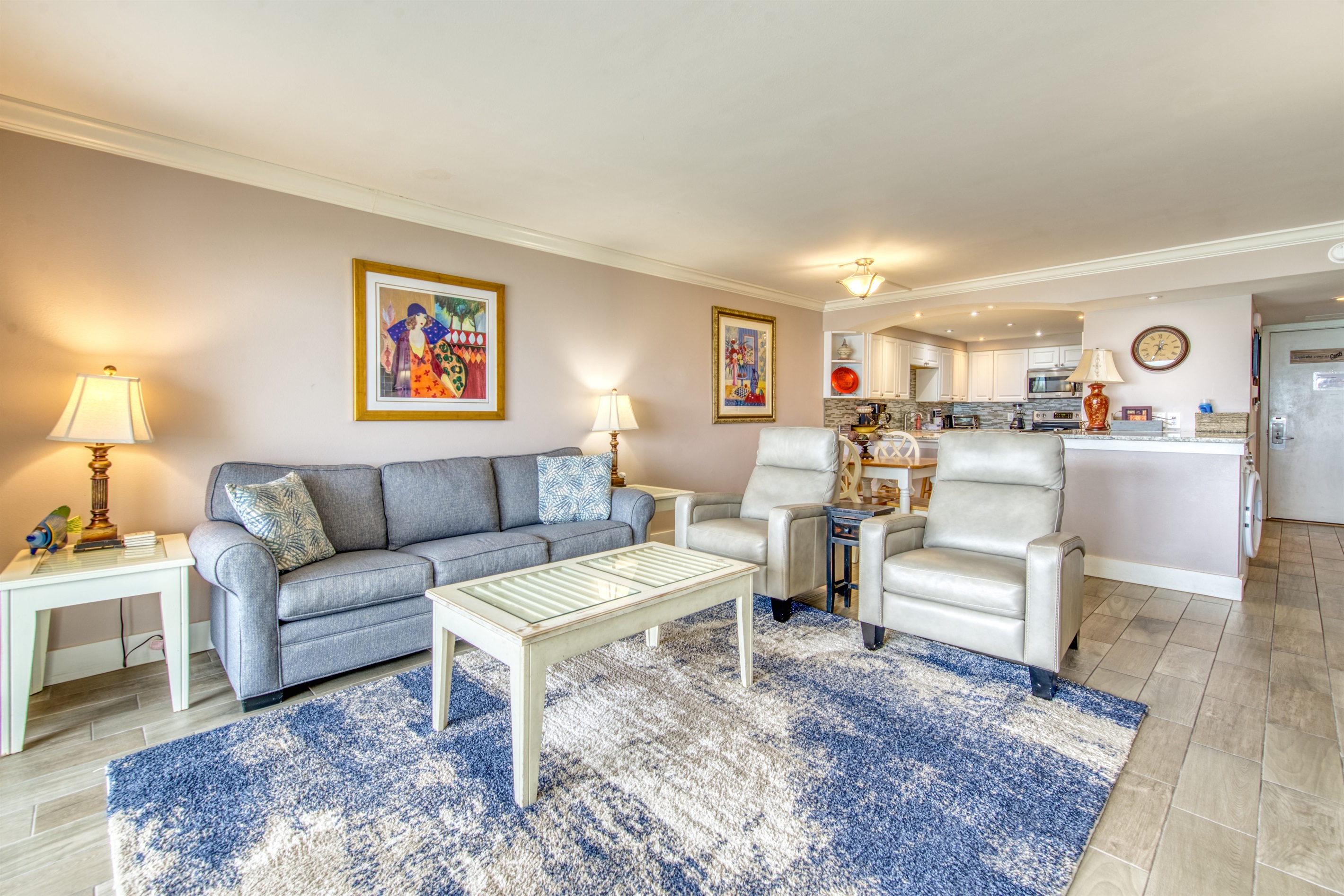 This condo can conveniently accommodate a party of 7. The master bedroom has a king-sized bed that comfortably sleeps 2, as well as a private, full bathroom attached to it. The guest bedroom has 1 queen size bed and 1 twin bed along with an attached full bathroom that is also accessible from the living room area. The living room is equipped with plenty of comfortable seating for lounging and relaxing throughout the day during your breaks from the beach, as well as a pull-out sleeper sofa bed that can comfortably sleep 2. The total sleeping accommodations for this condo is 7 guests.