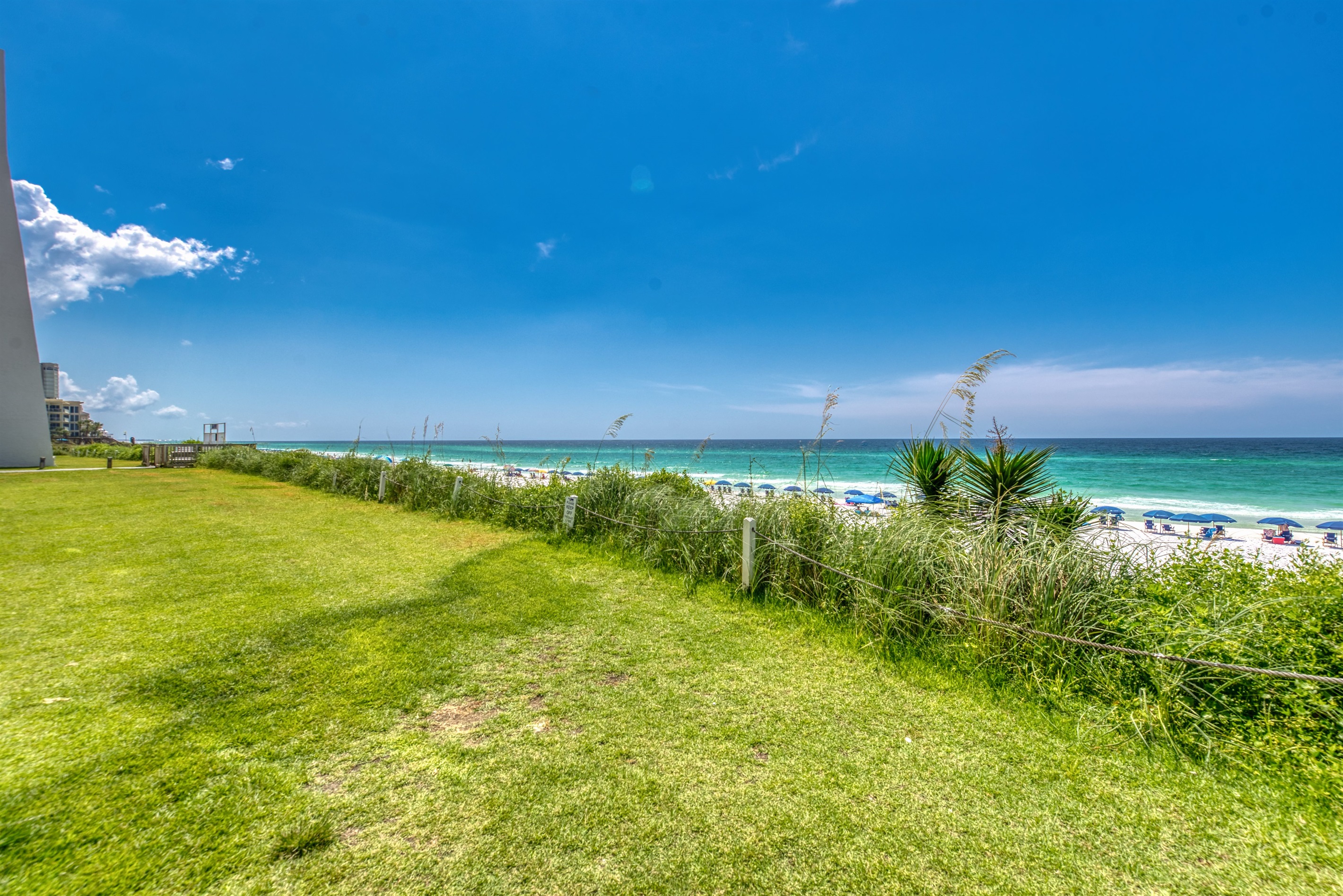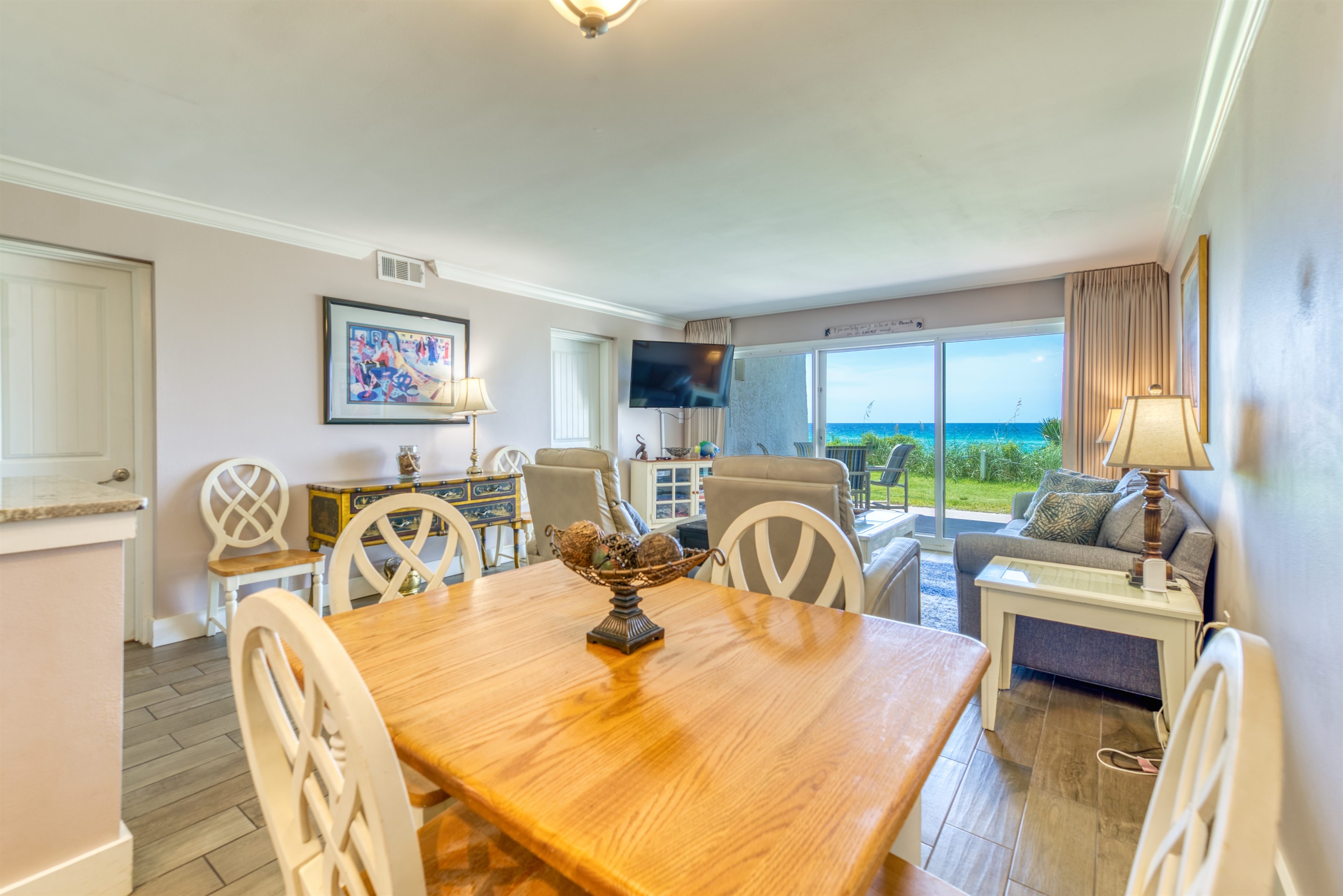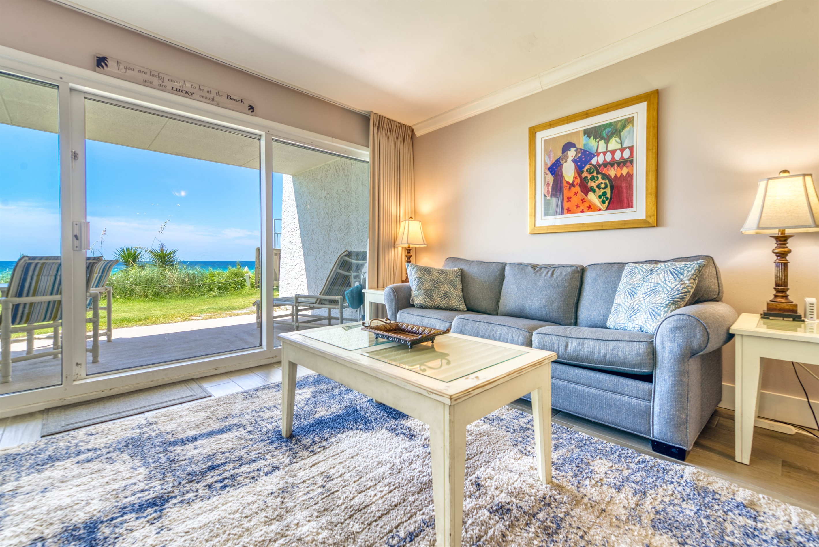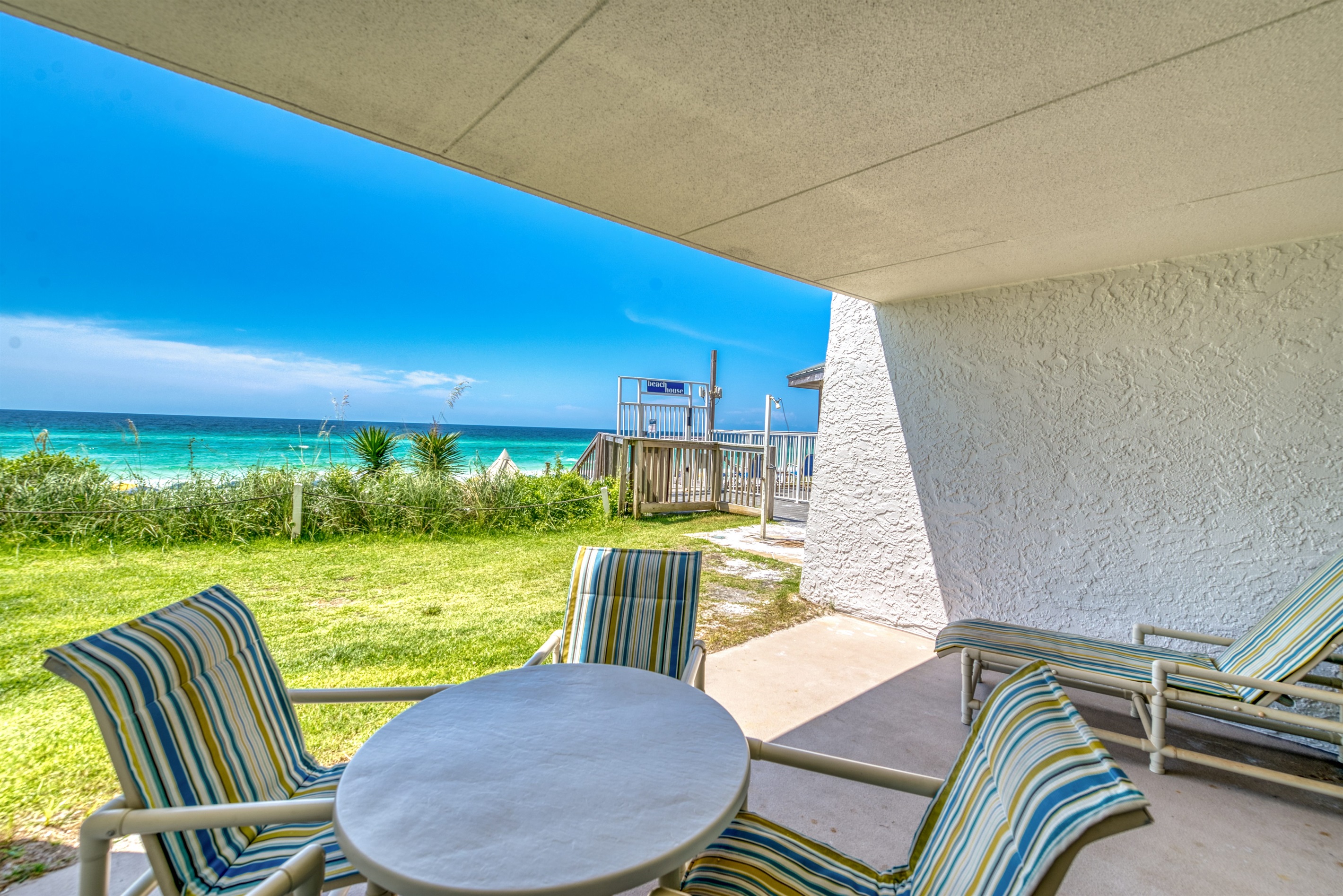Enter condo B101 at Beach House Condominiums to an open, airy beachy welcome! This property is located directly on the beach with no streets to cross. It is a beautiful two bedroom, two bathroom condo sits on the ground floor and it is centrally located near the pool deck, gazebo, tennis courts, and grill area. Stepping outside onto the covered walk out patio, you are met with a gorgeous view of the Gulf of Mexico and the white sandy beaches of the Emerald Coast! You can hear the waves crashing and almost feel the surf splash right from the walk out patio!