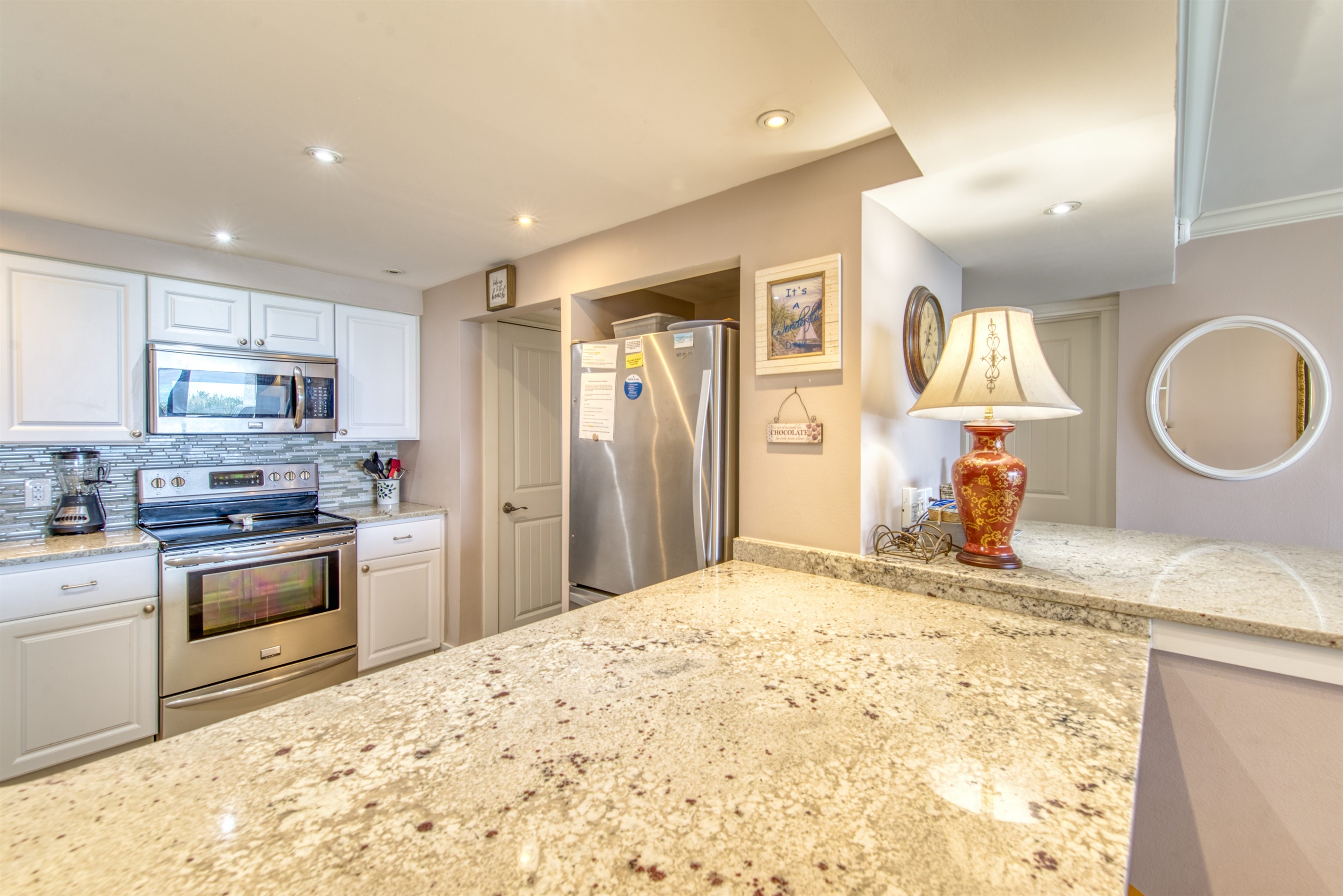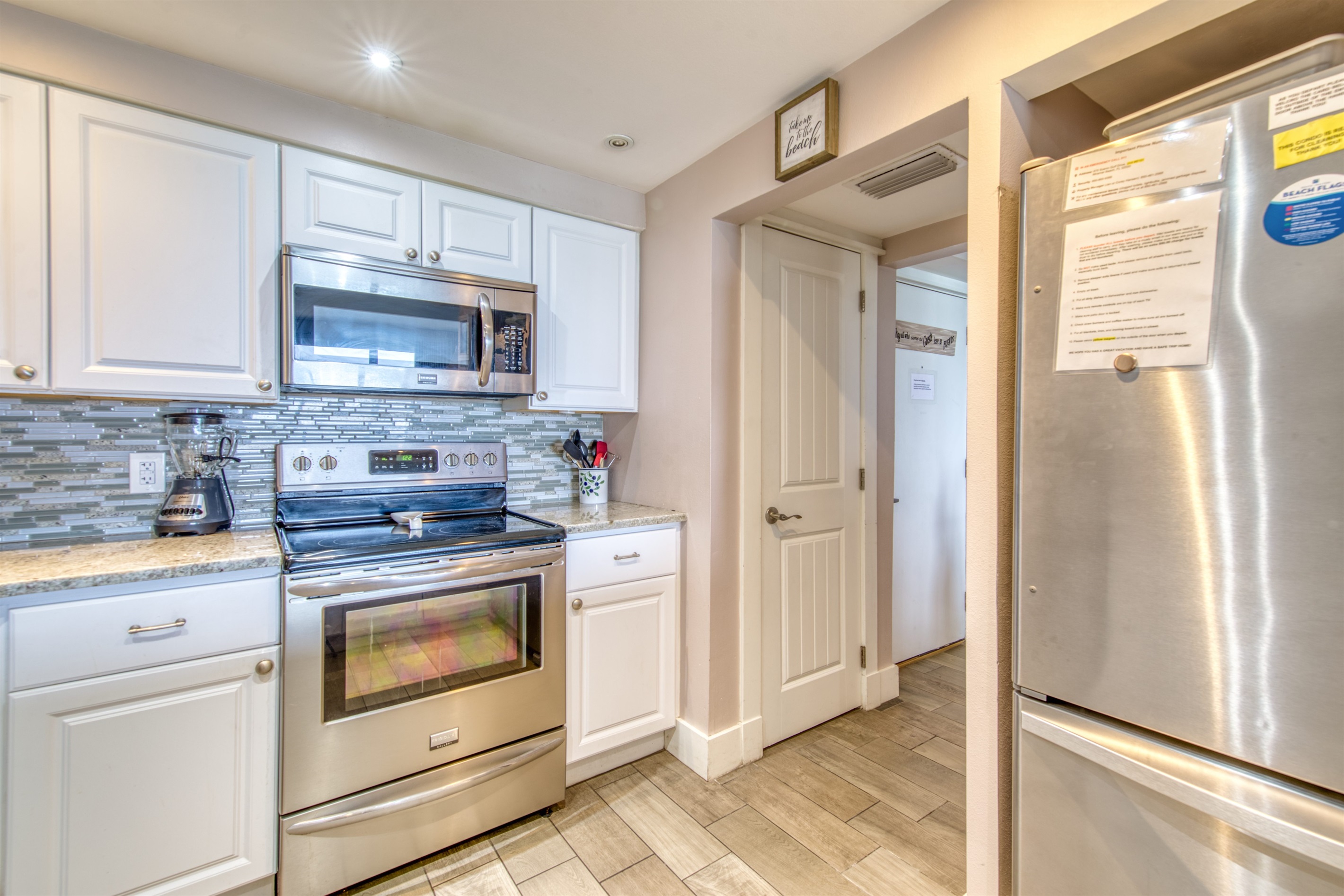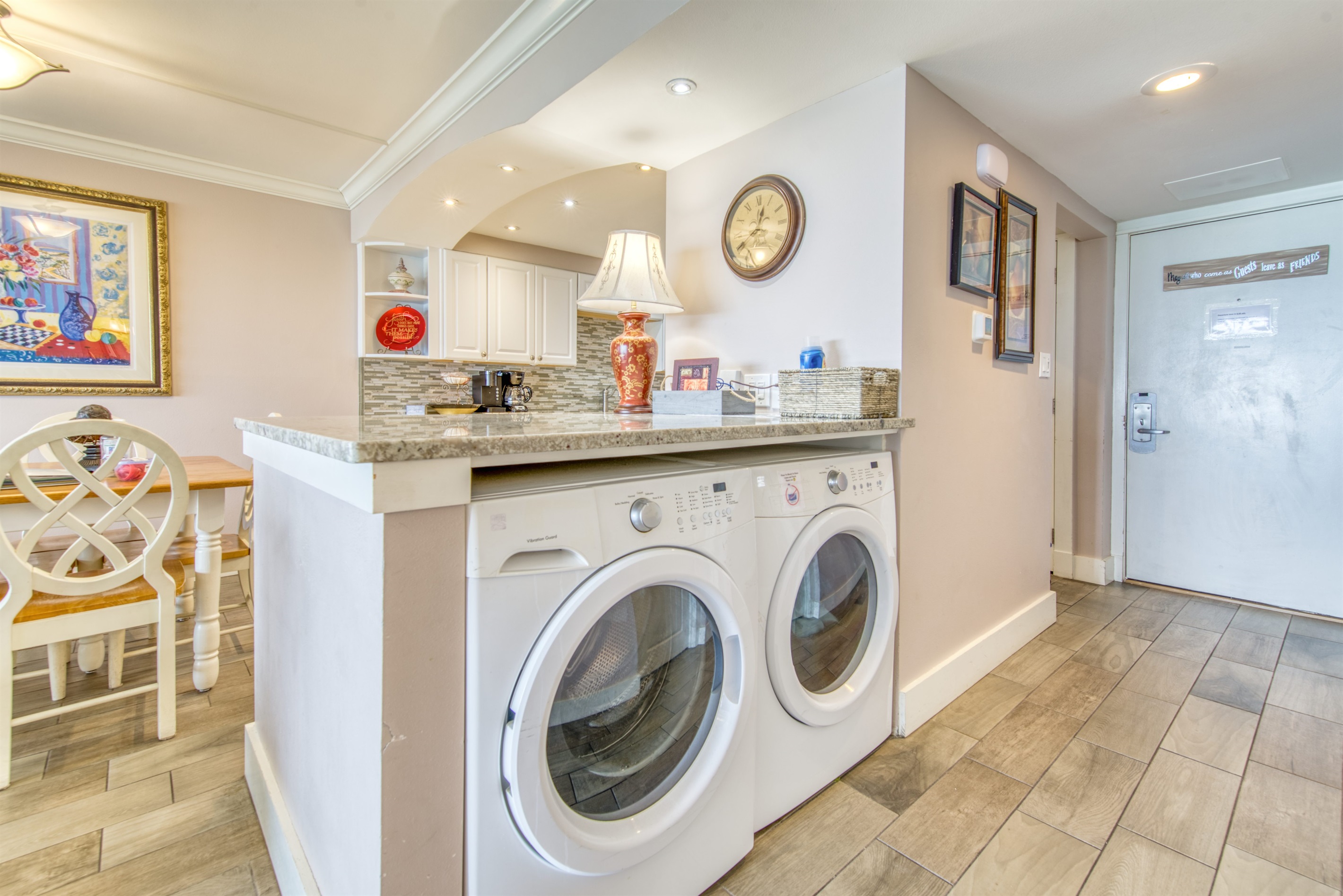 The kitchen is fully equipped with all major and small appliances including refrigerator, stove, dishwasher and microwave & more. Cookware, utensils, and table service are all included, with a private washer and dryer located conveniently inside the condo.