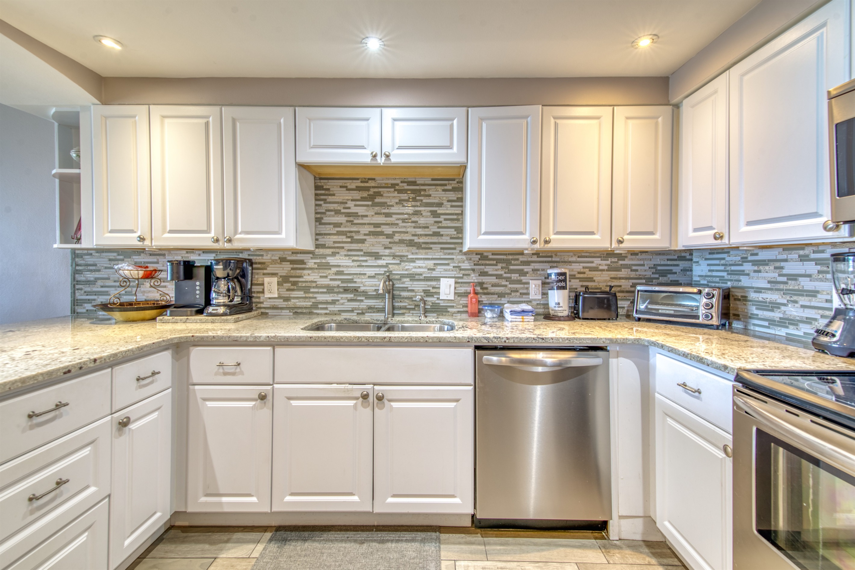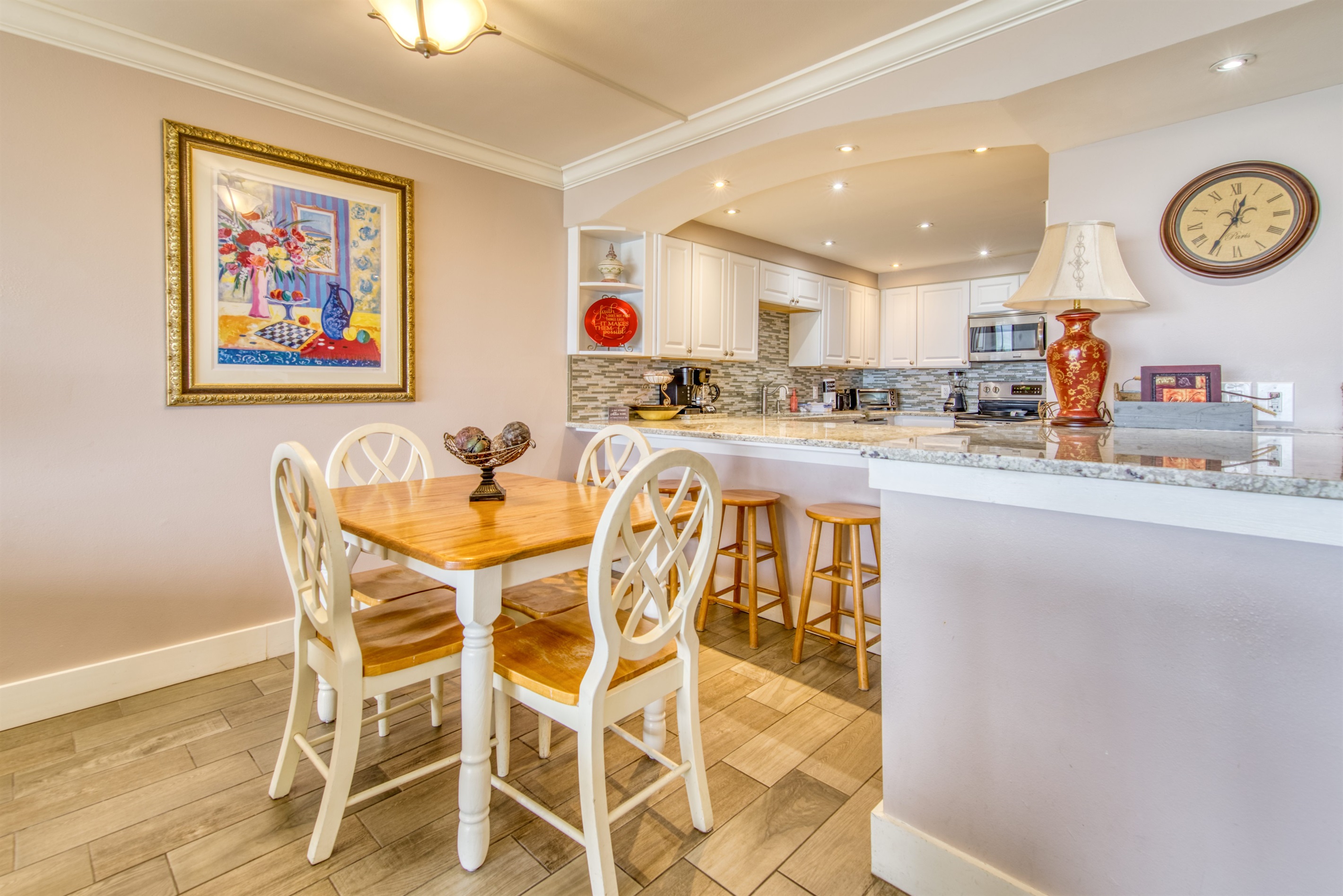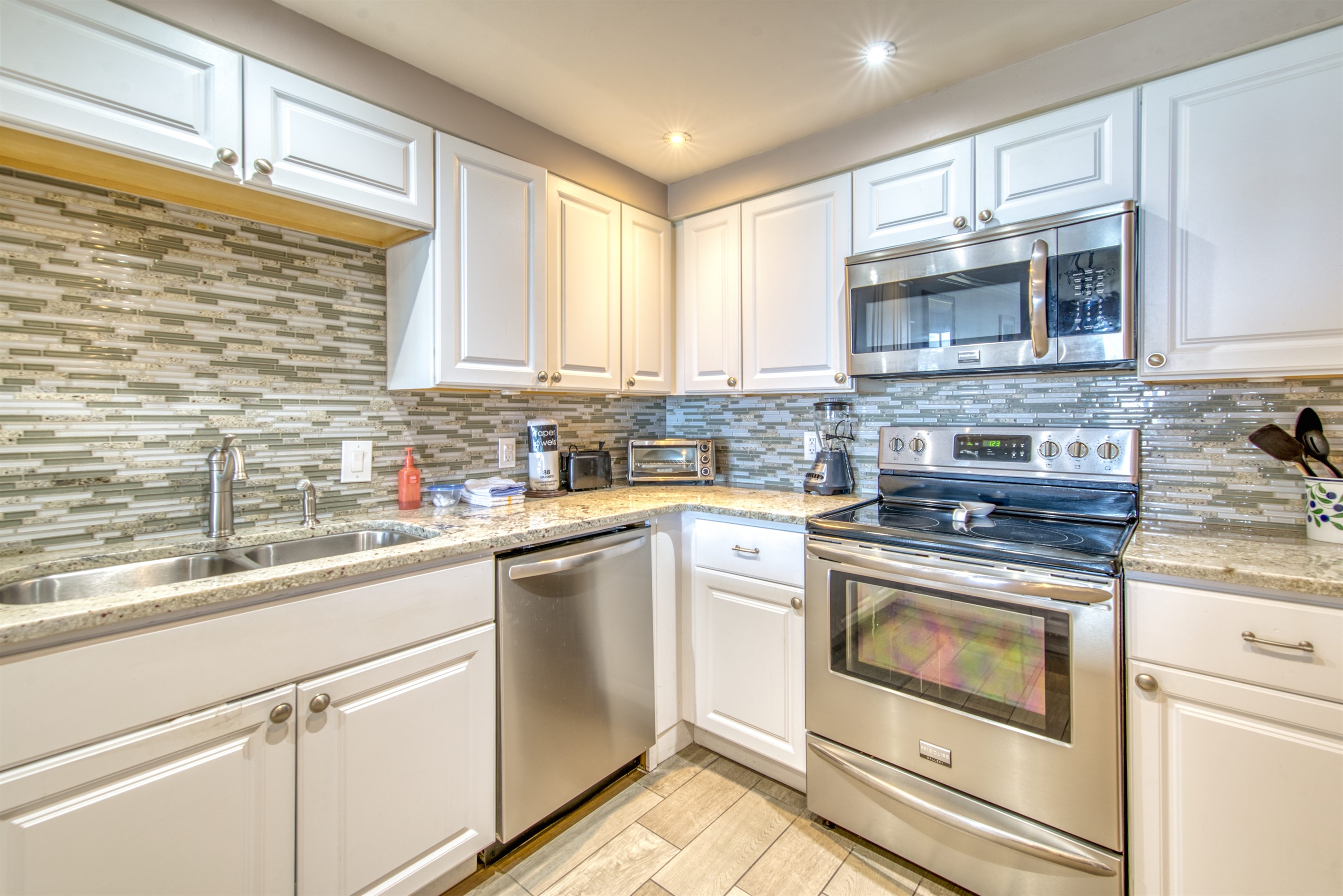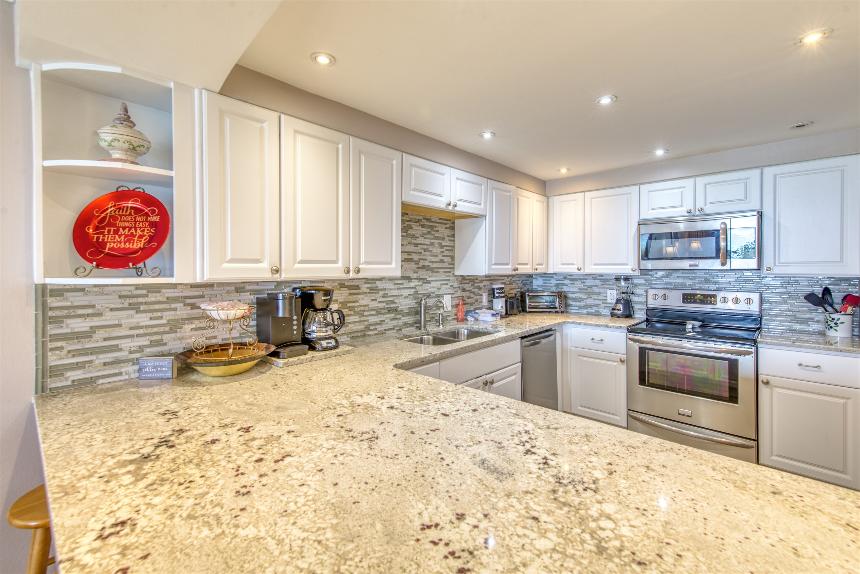 The kitchen is fully equipped with all major and small appliances including refrigerator, stove, dishwasher and microwave & more. Cookware, utensils, and table service are all included, with a private washer and dryer located conveniently inside the condo.