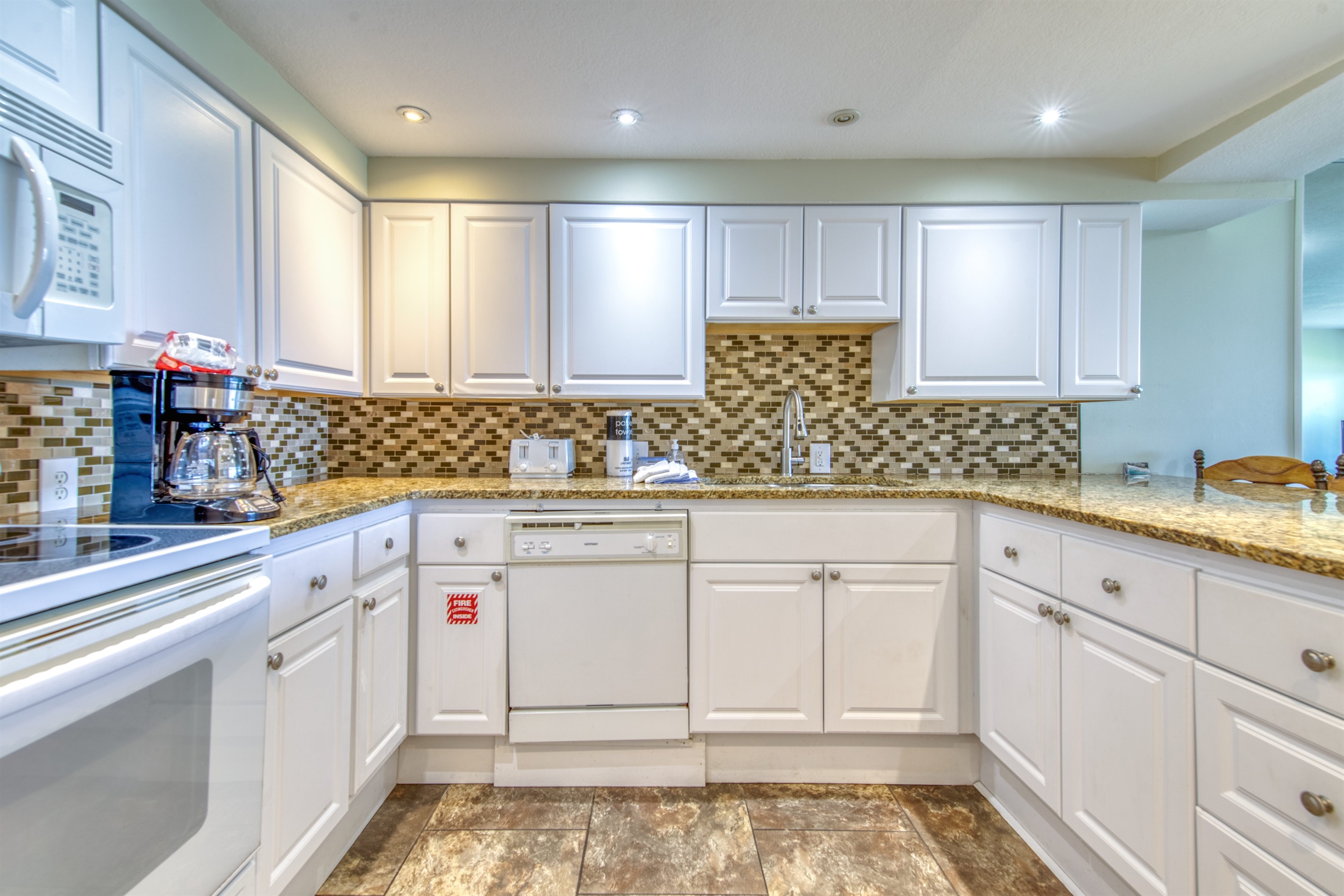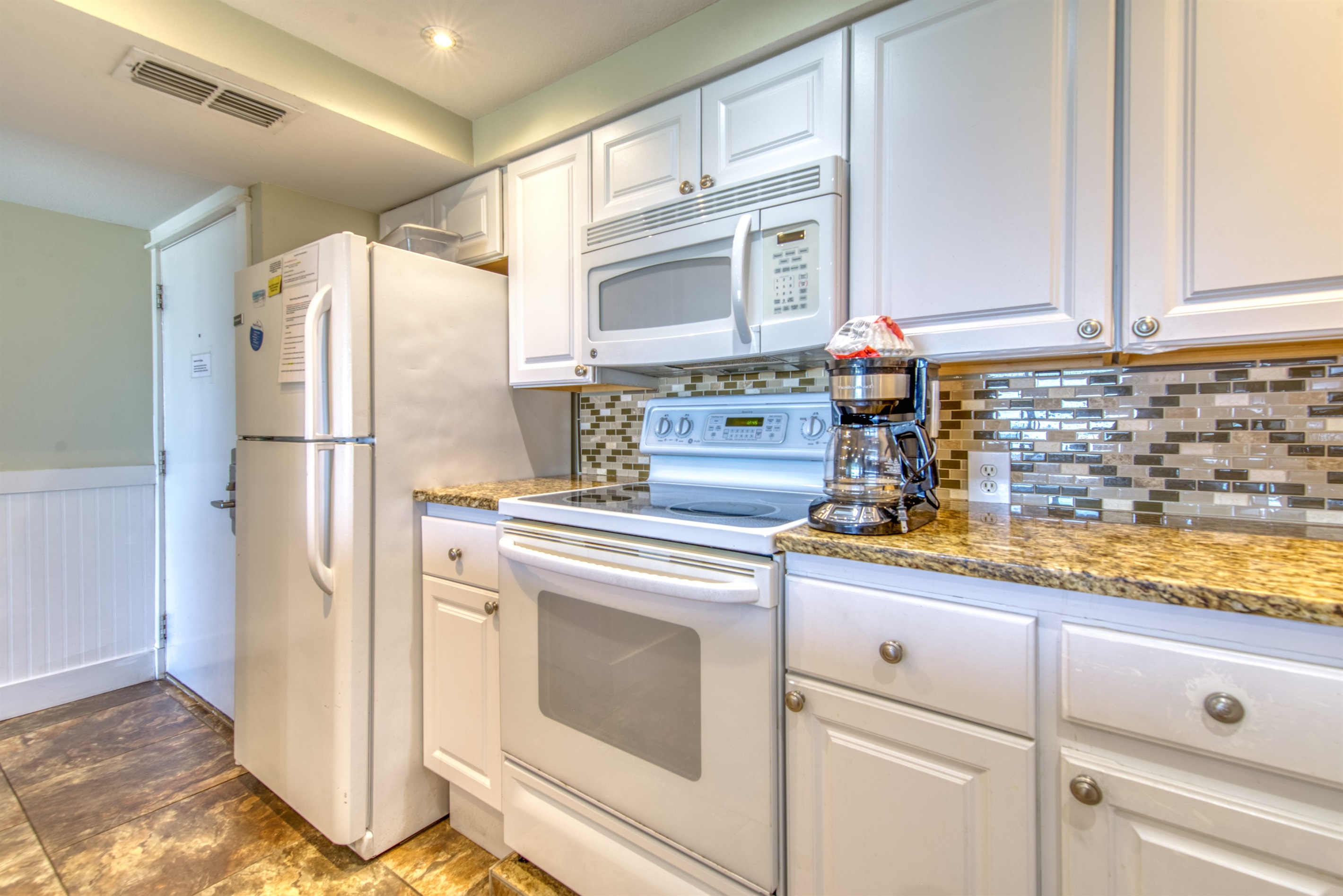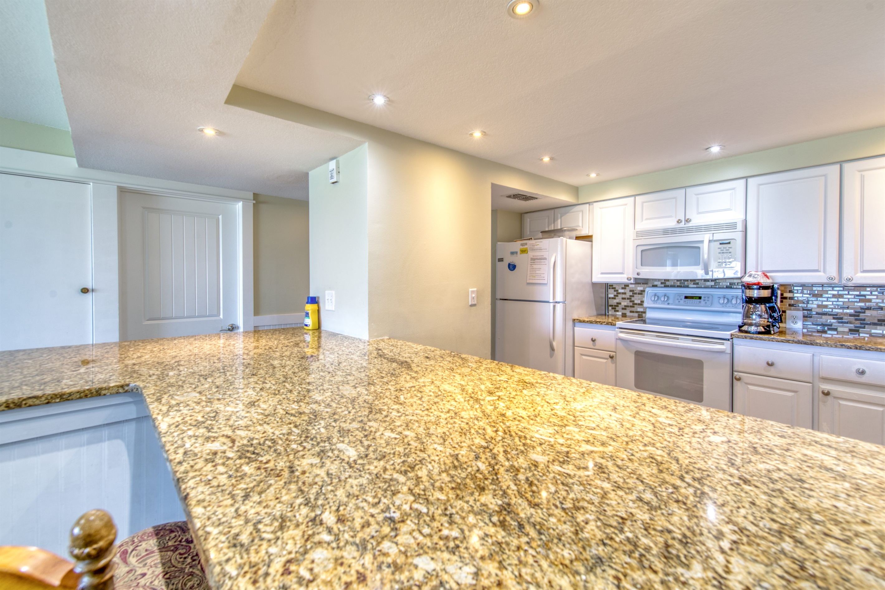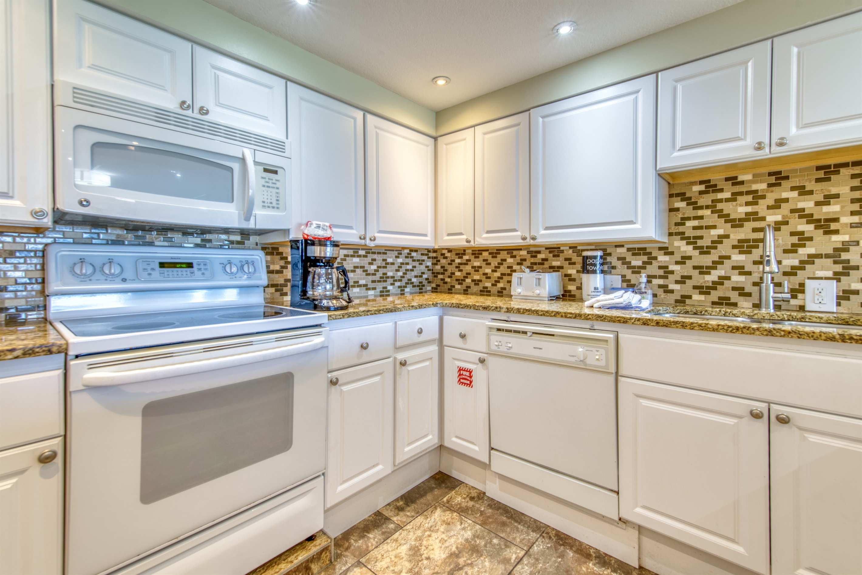 The kitchen is fully equipped with all major and small appliances including refrigerator, stove, dishwasher and microwave & more. Cookware, utensils, and table service are all included, with a private washer and dryer located conveniently inside the condo.
