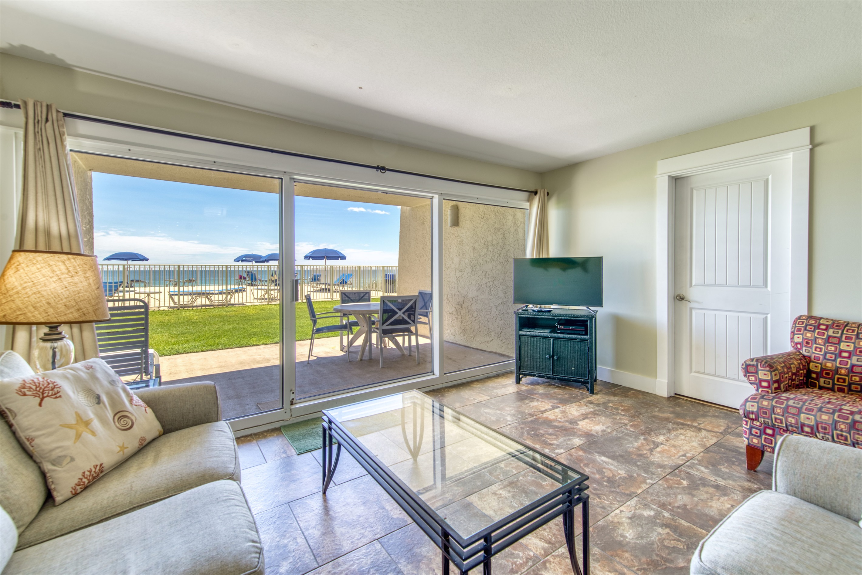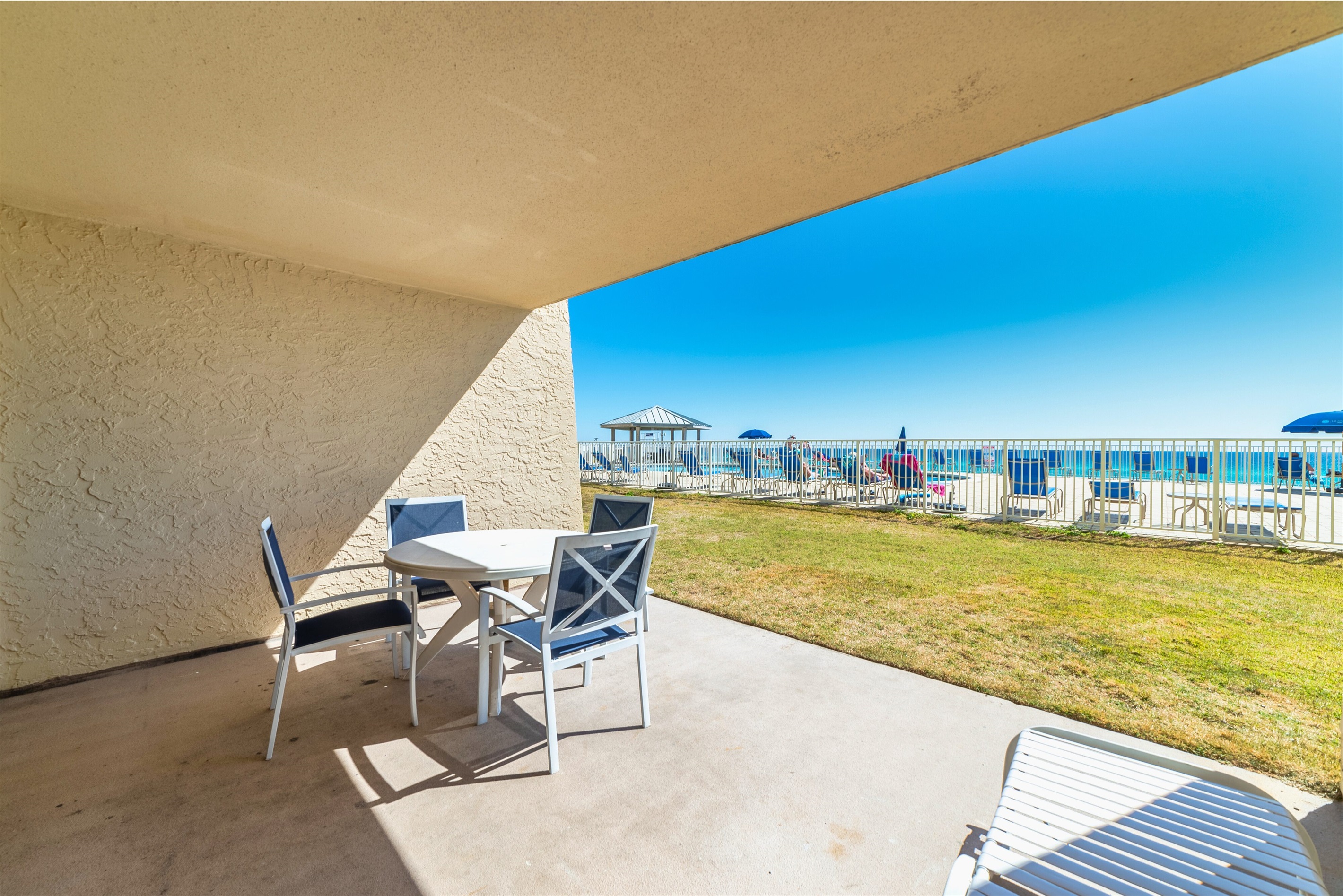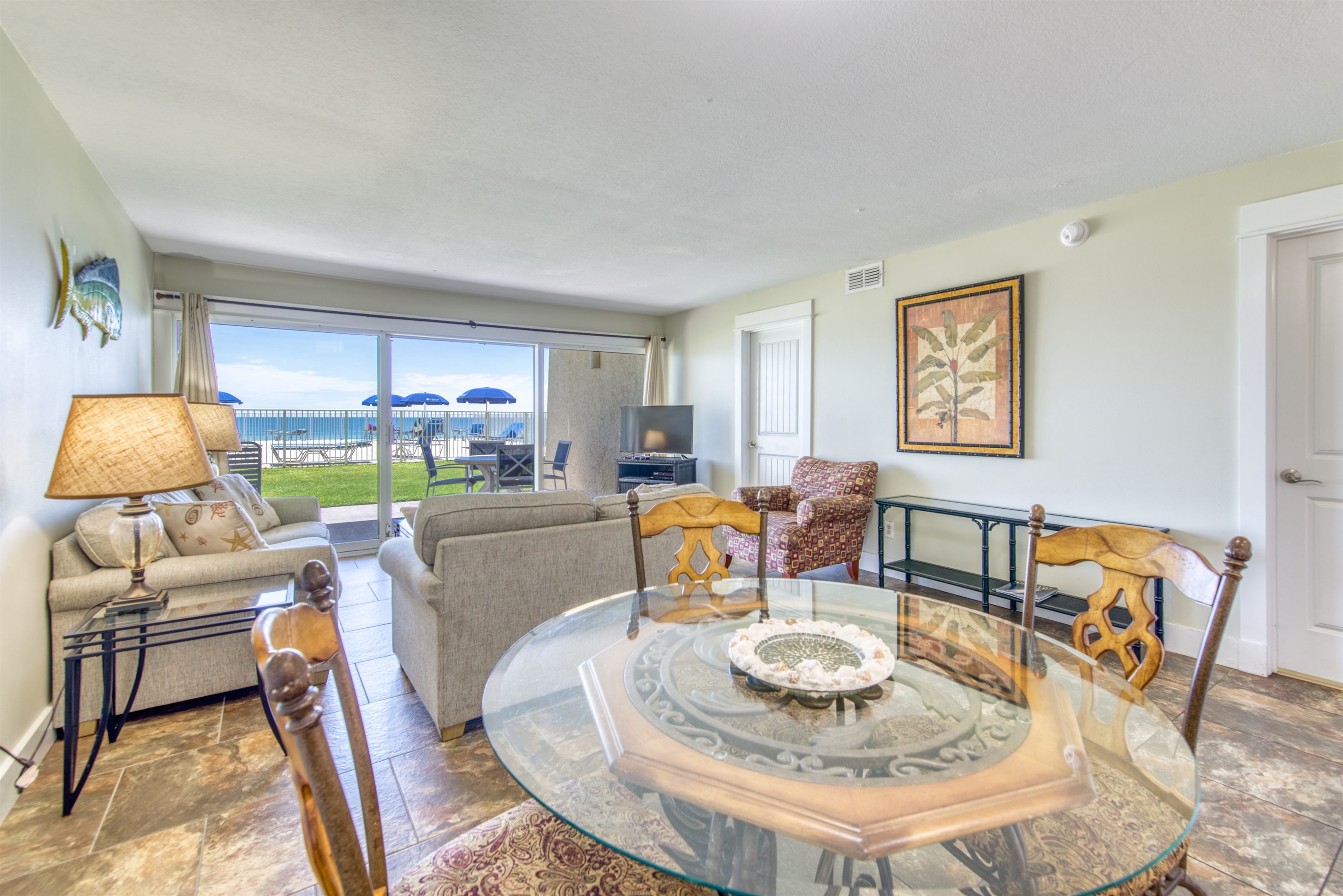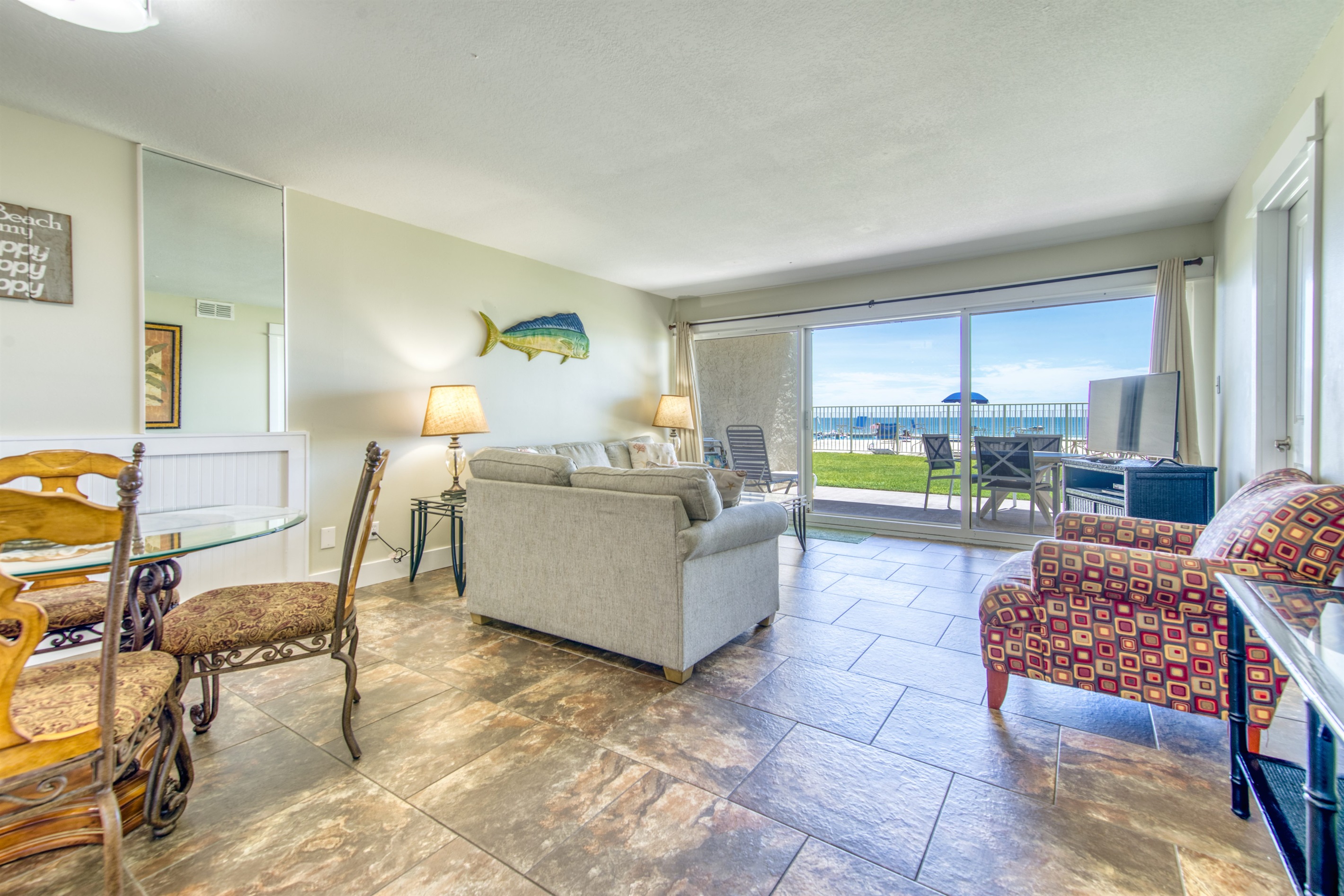 Enter condo C103 at Beach House Condominiums to an open, airy beachy welcome! This property is located directly on the beach with no streets to cross. It is a beautiful two bedroom, two bathroom condo sits on the ground floor and it is centrally located near the pool deck, gazebo, and grill area. Stepping outside onto the covered walk out patio, you are met with a gorgeous view of the pool area overlooking the Gulf of Mexico and the white sandy beaches of the Emerald Coast! You can hear the waves crashing and almost feel the surf splash right from the walk out patio!