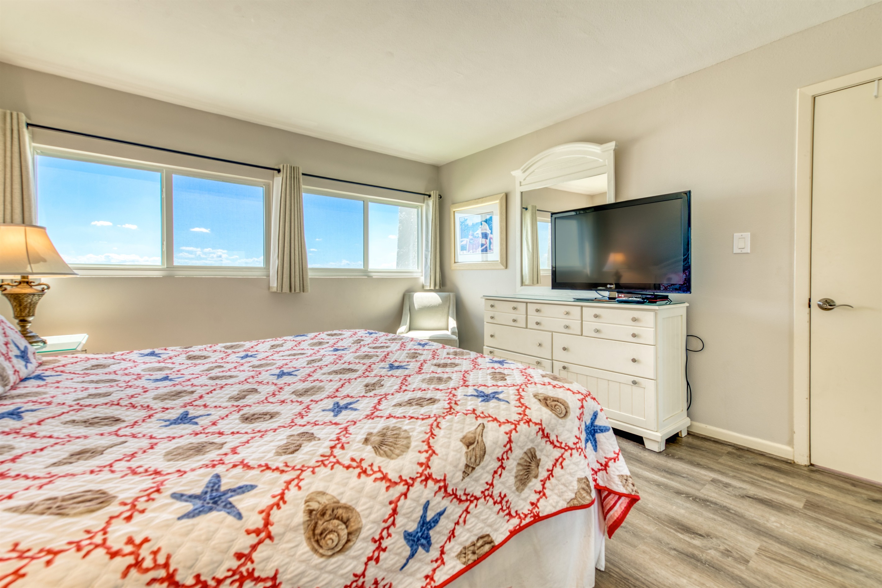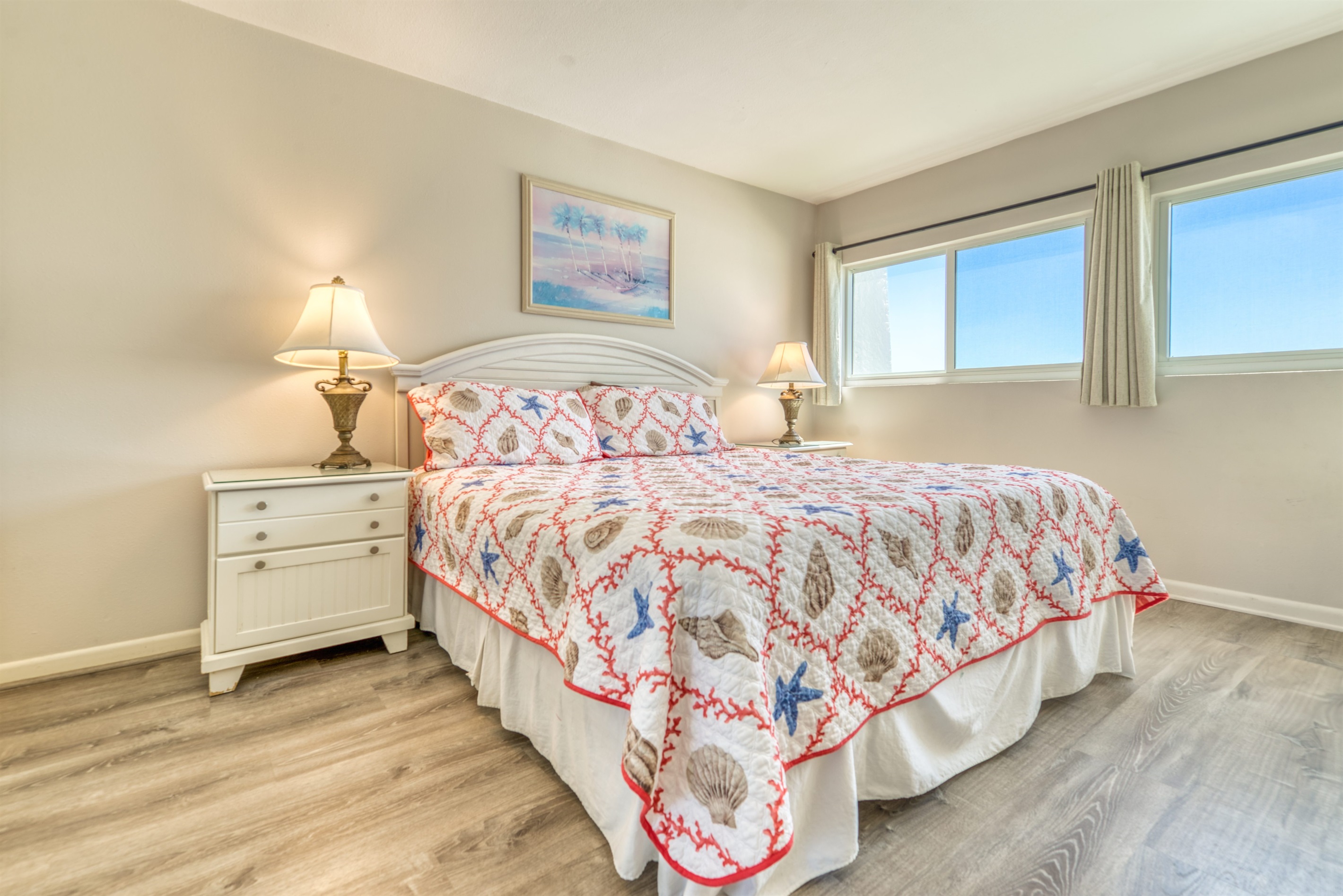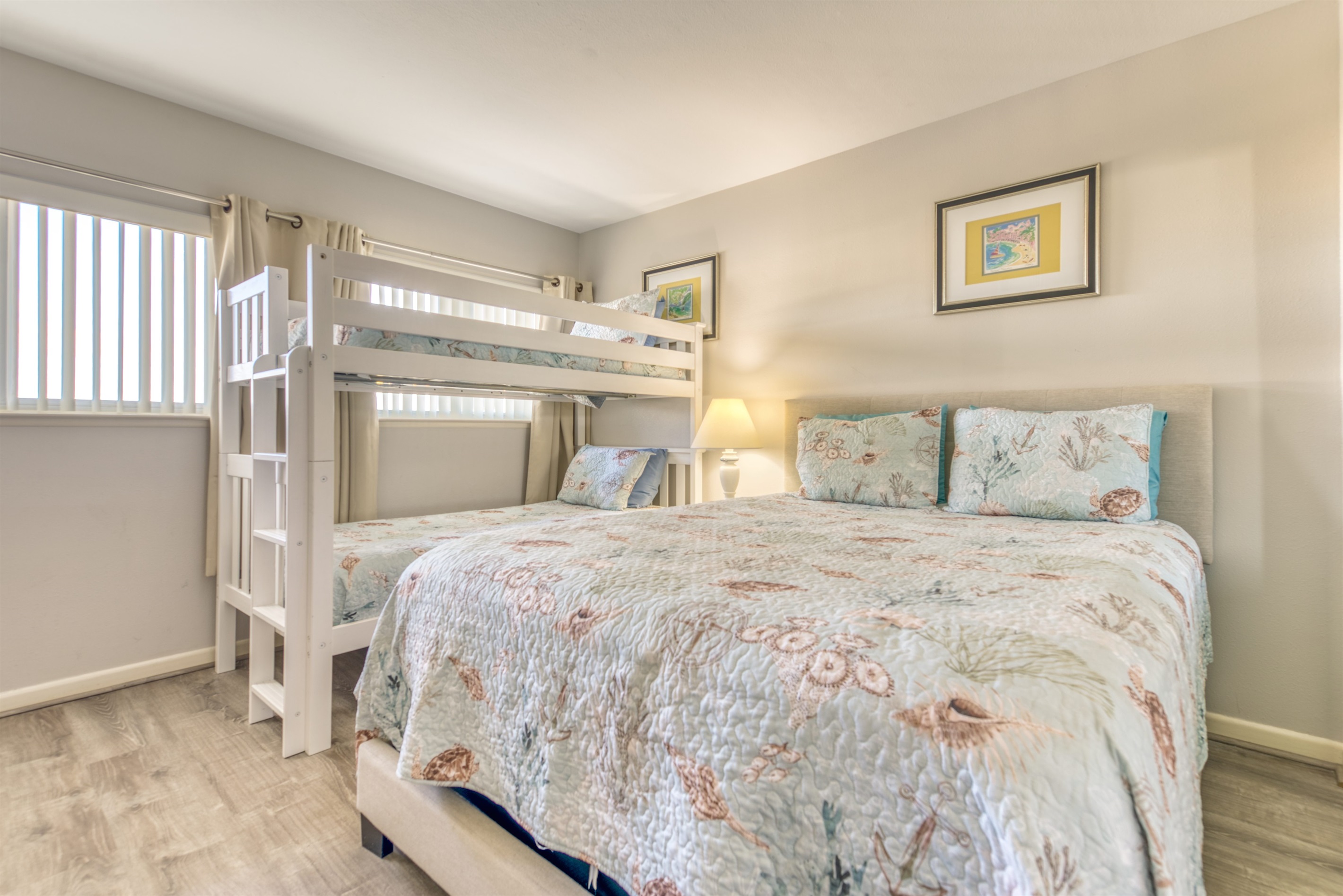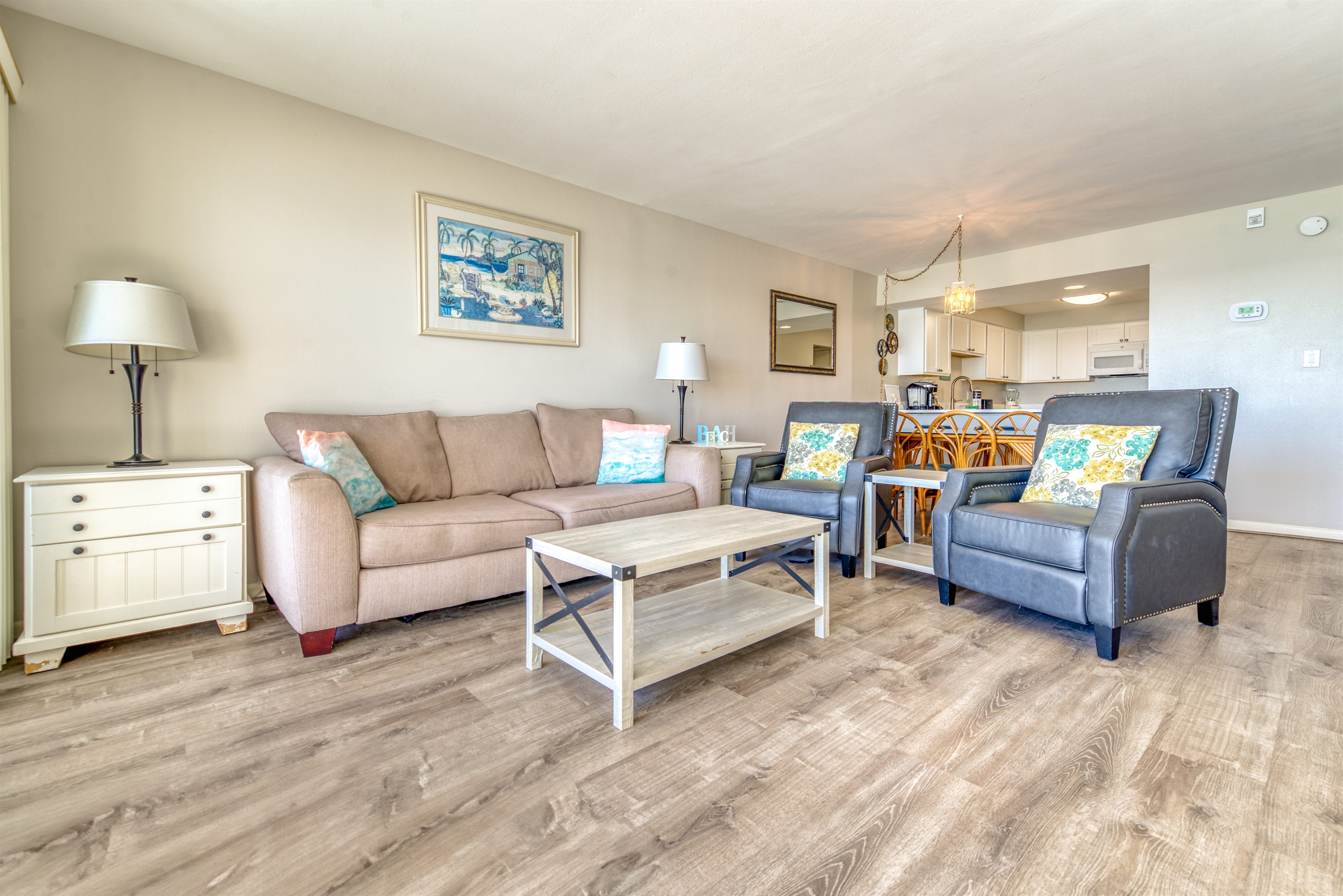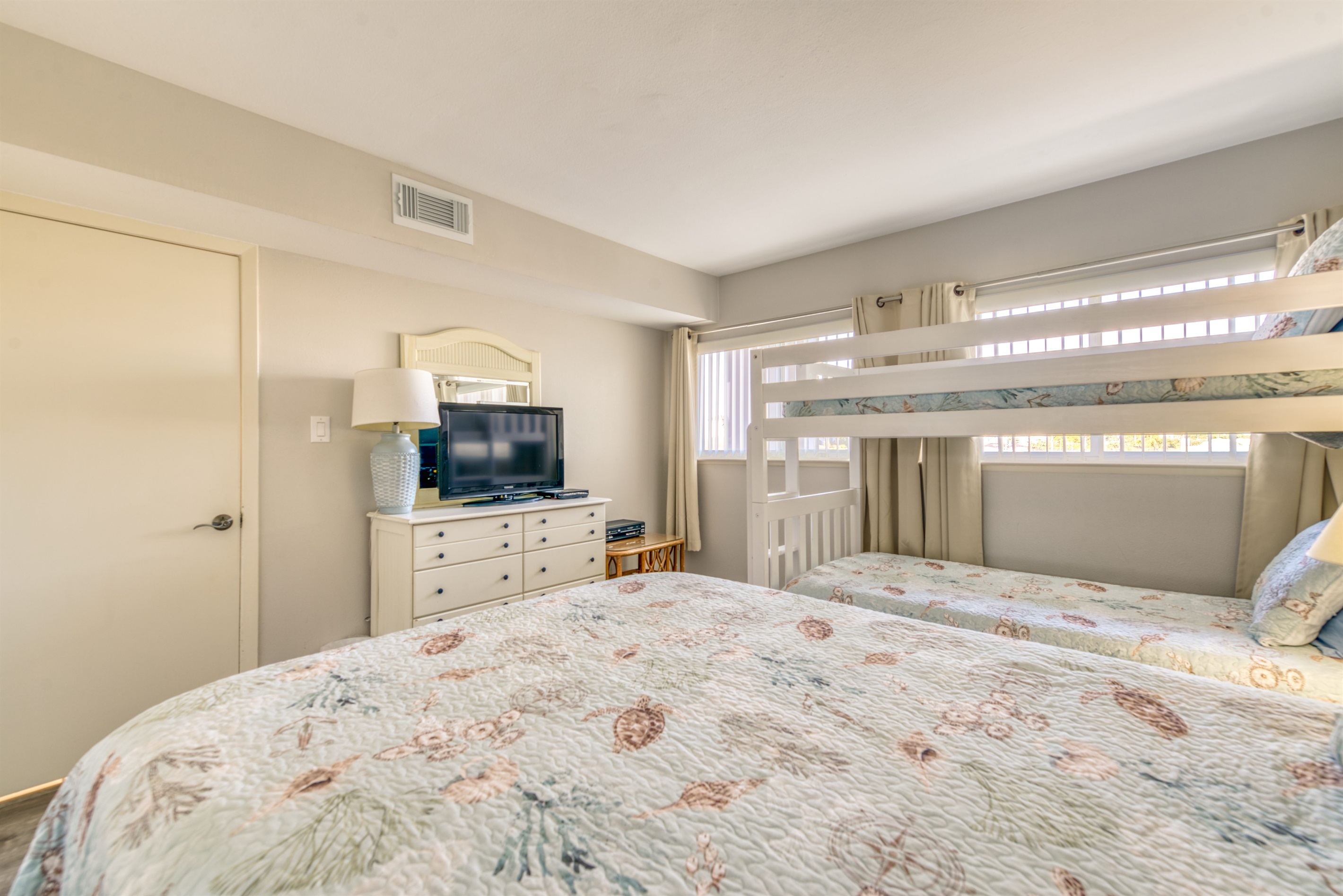 This condo can conveniently accommodate a party of 8. The master bedroom has a king-sized bed that comfortably sleeps 2, as well as a private, full bathroom attached to it. The guest bedroom has 1 queen size bed and 1 bunk bed along with an attached full bathroom that is also accessible from the living room area. The living room is equipped with plenty of comfortable seating for lounging and relaxing throughout the day during your breaks from the beach, as well as a pull-out sleeper sofa bed that can comfortably sleep 2. The total sleeping accommodations for this condo are 8 guests.