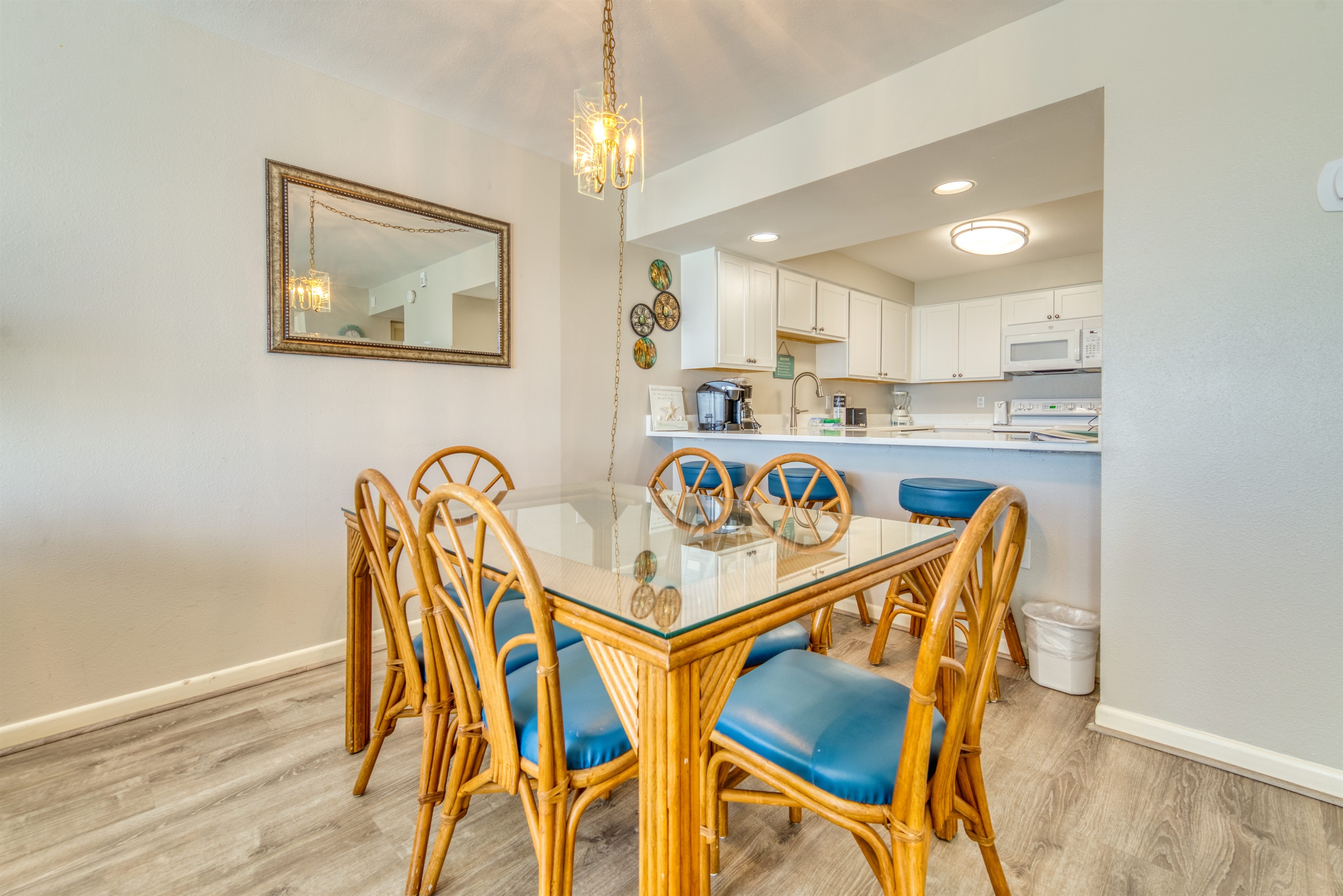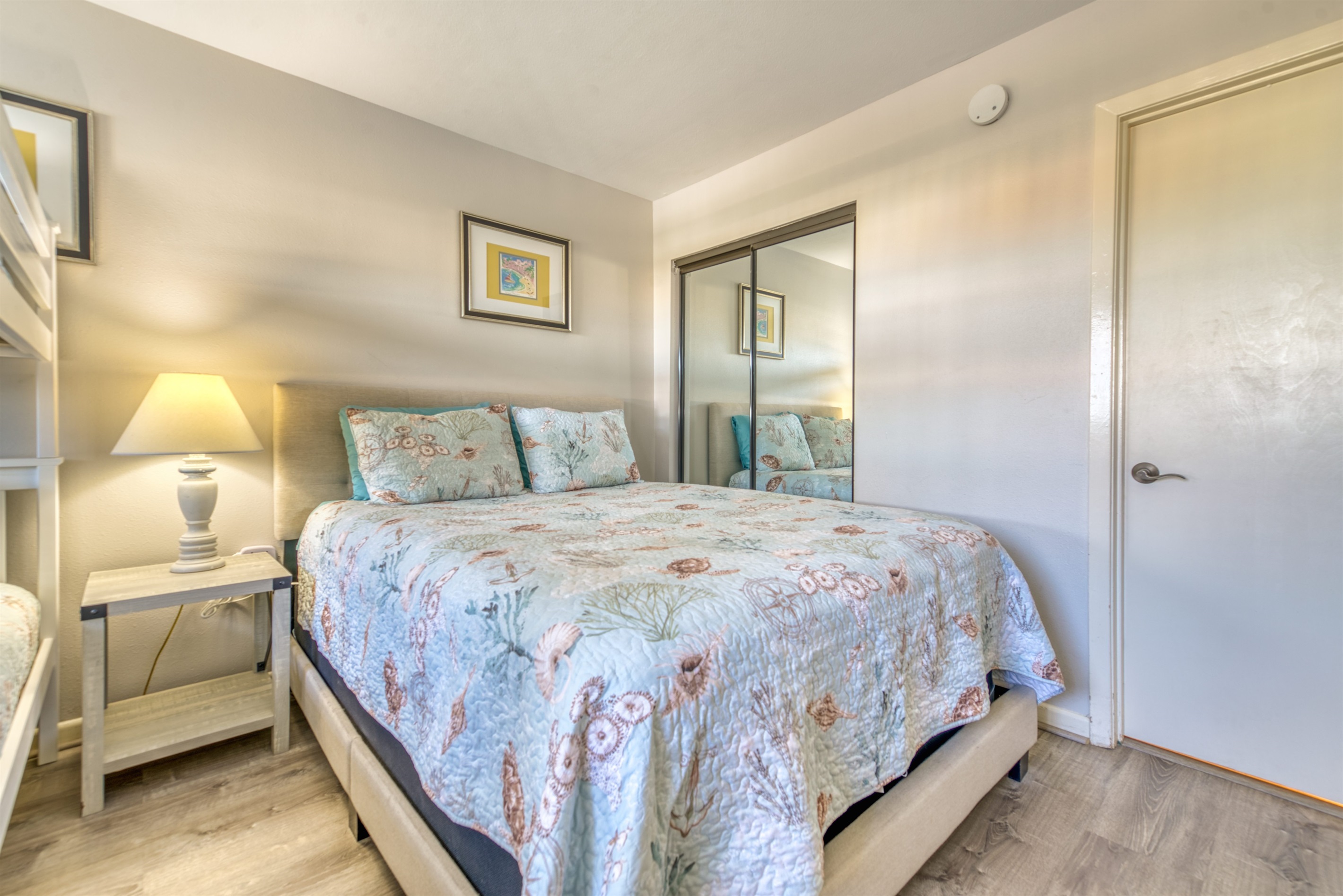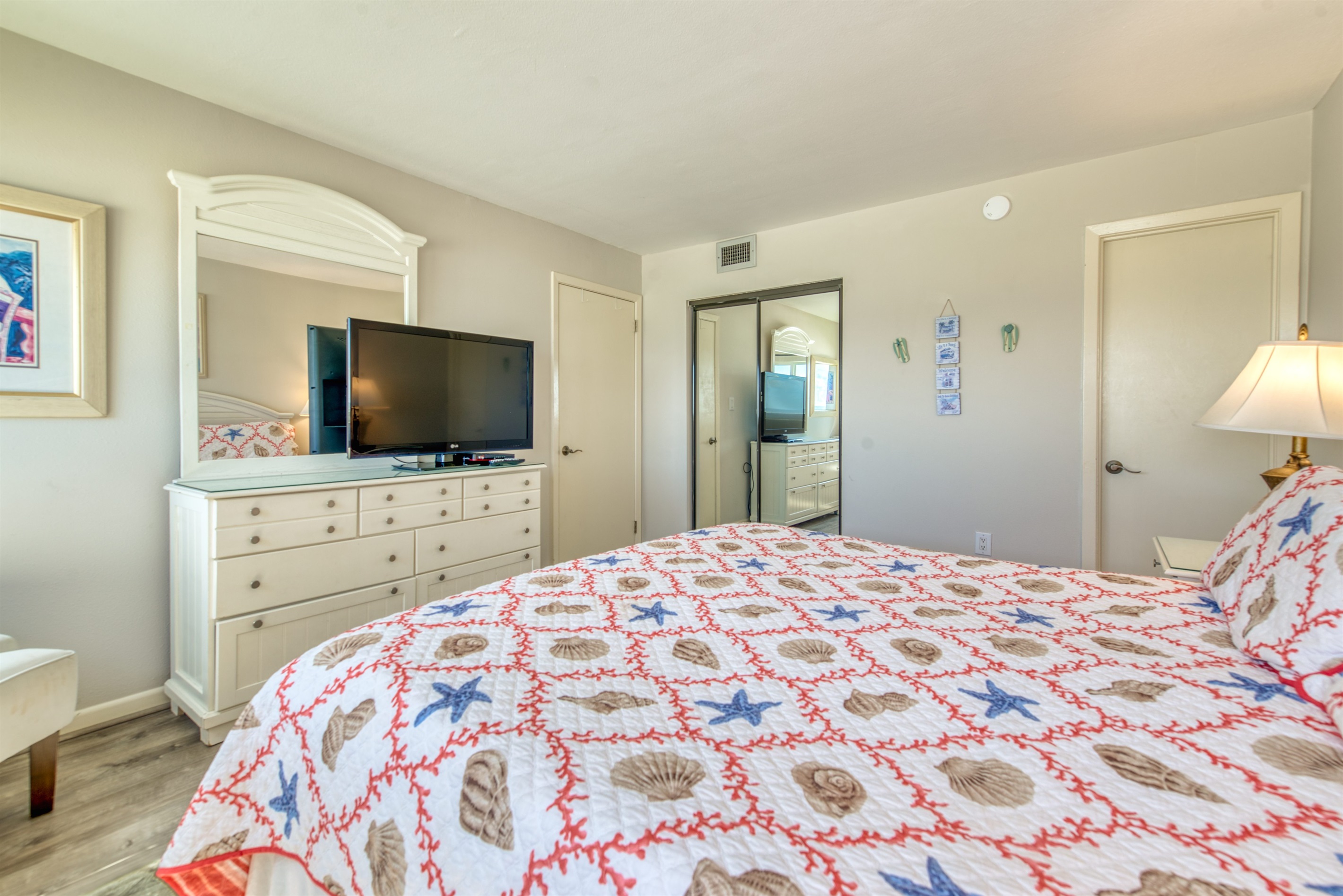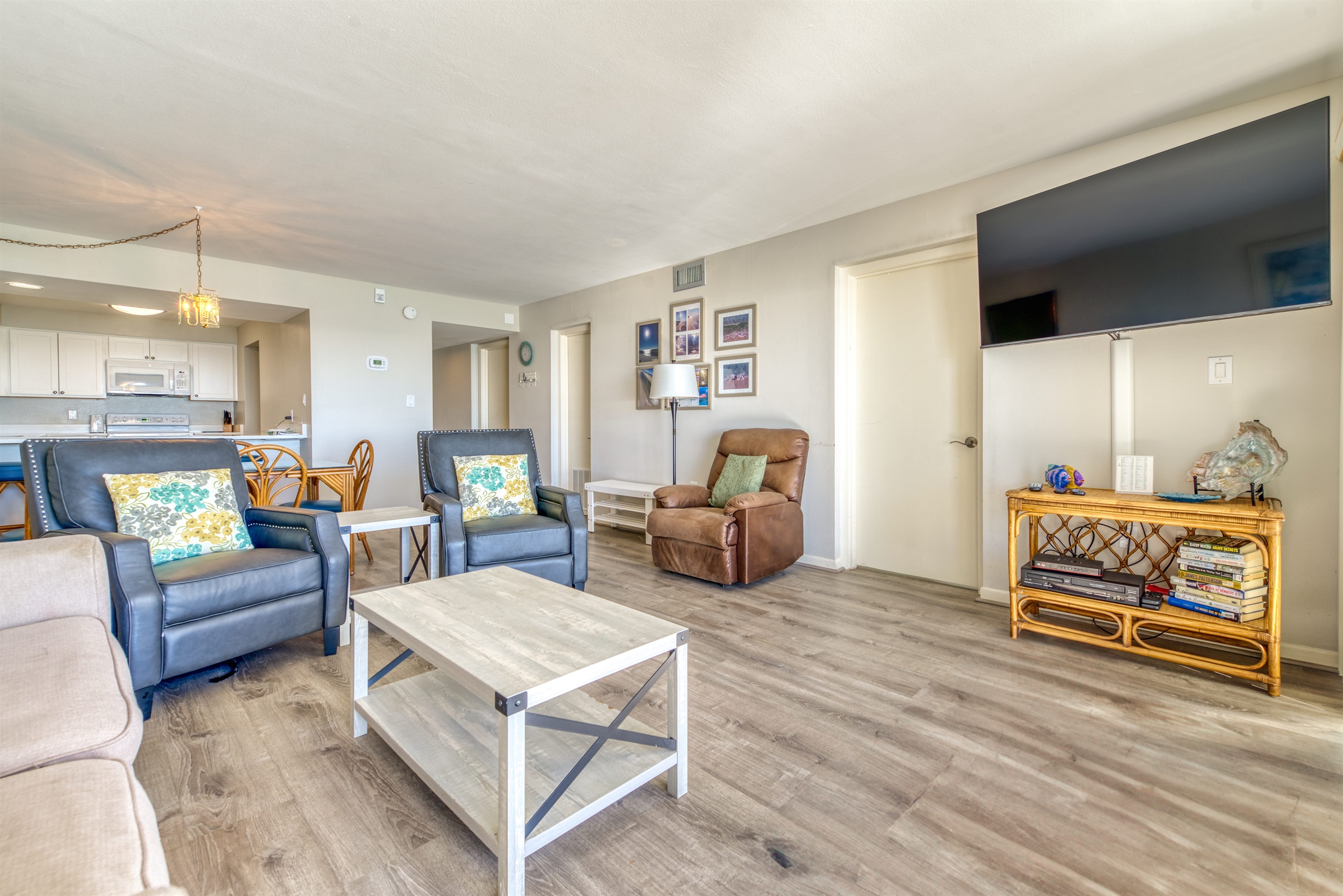 This condo can conveniently accommodate a party of 8. The master bedroom has a king-sized bed that comfortably sleeps 2, as well as a private, full bathroom attached to it. The guest bedroom has 1 queen size bed and 1 bunk bed along with an attached full bathroom that is also accessible from the living room area. The living room is equipped with plenty of comfortable seating for lounging and relaxing throughout the day during your breaks from the beach, as well as a pull-out sleeper sofa bed that can comfortably sleep 2. The total sleeping accommodations for this condo are 8 guests.