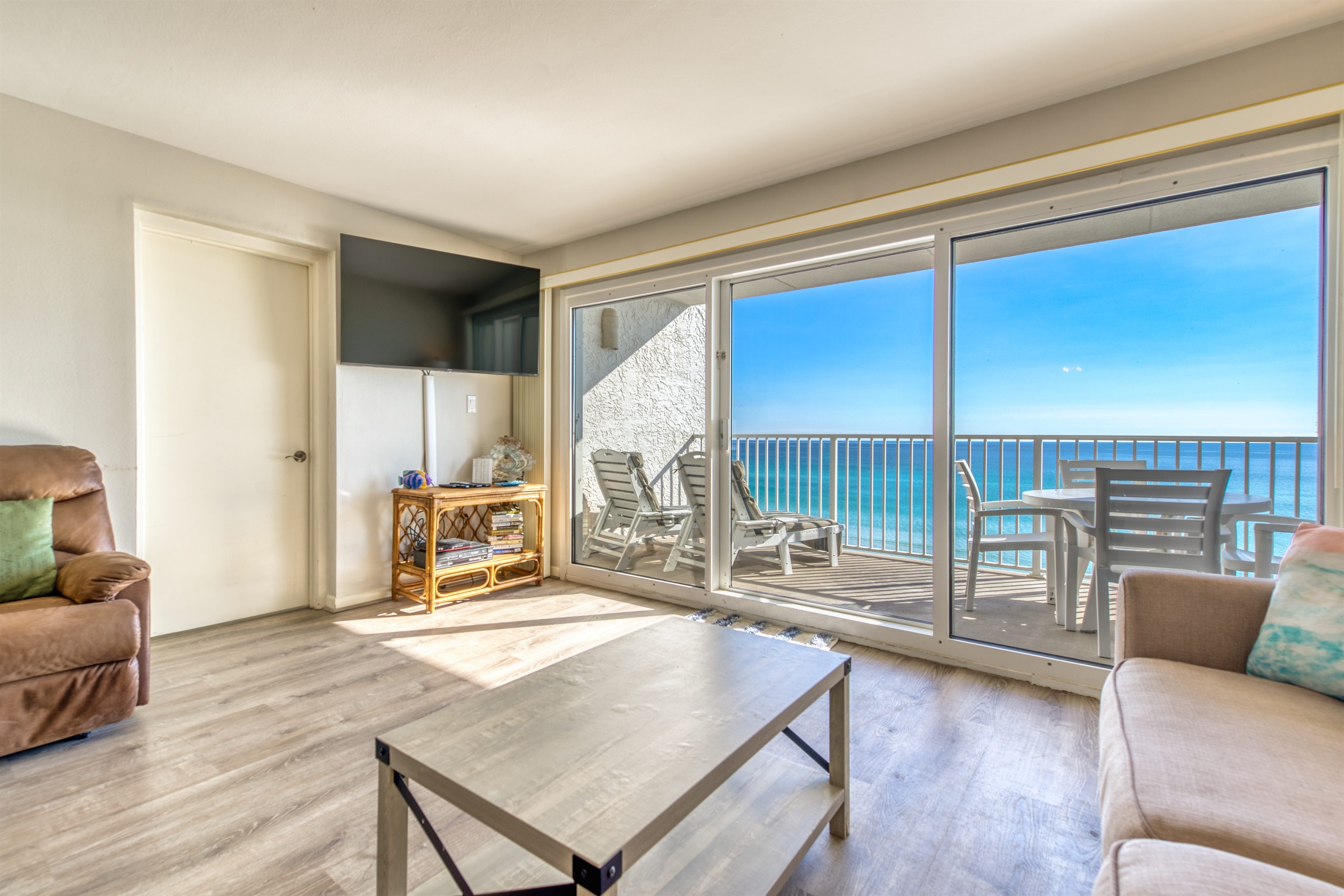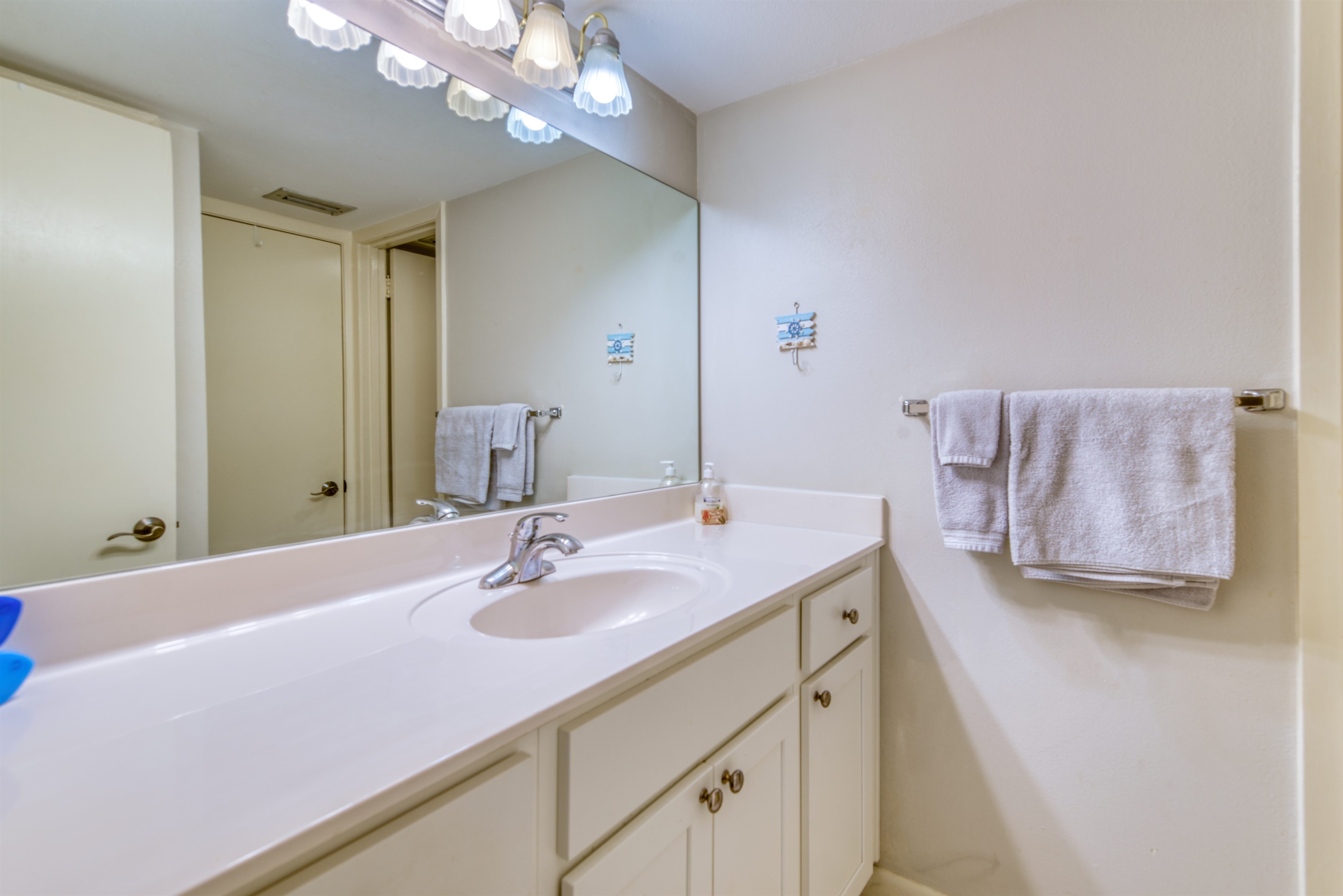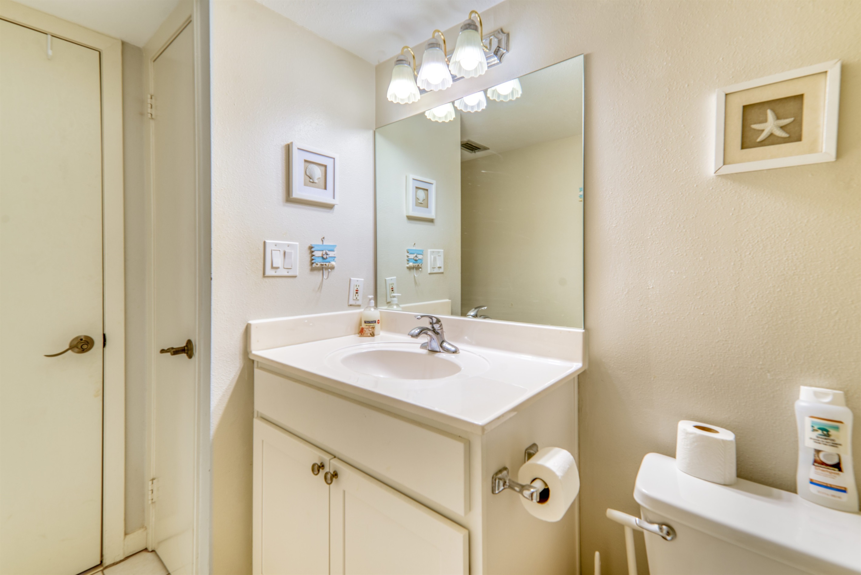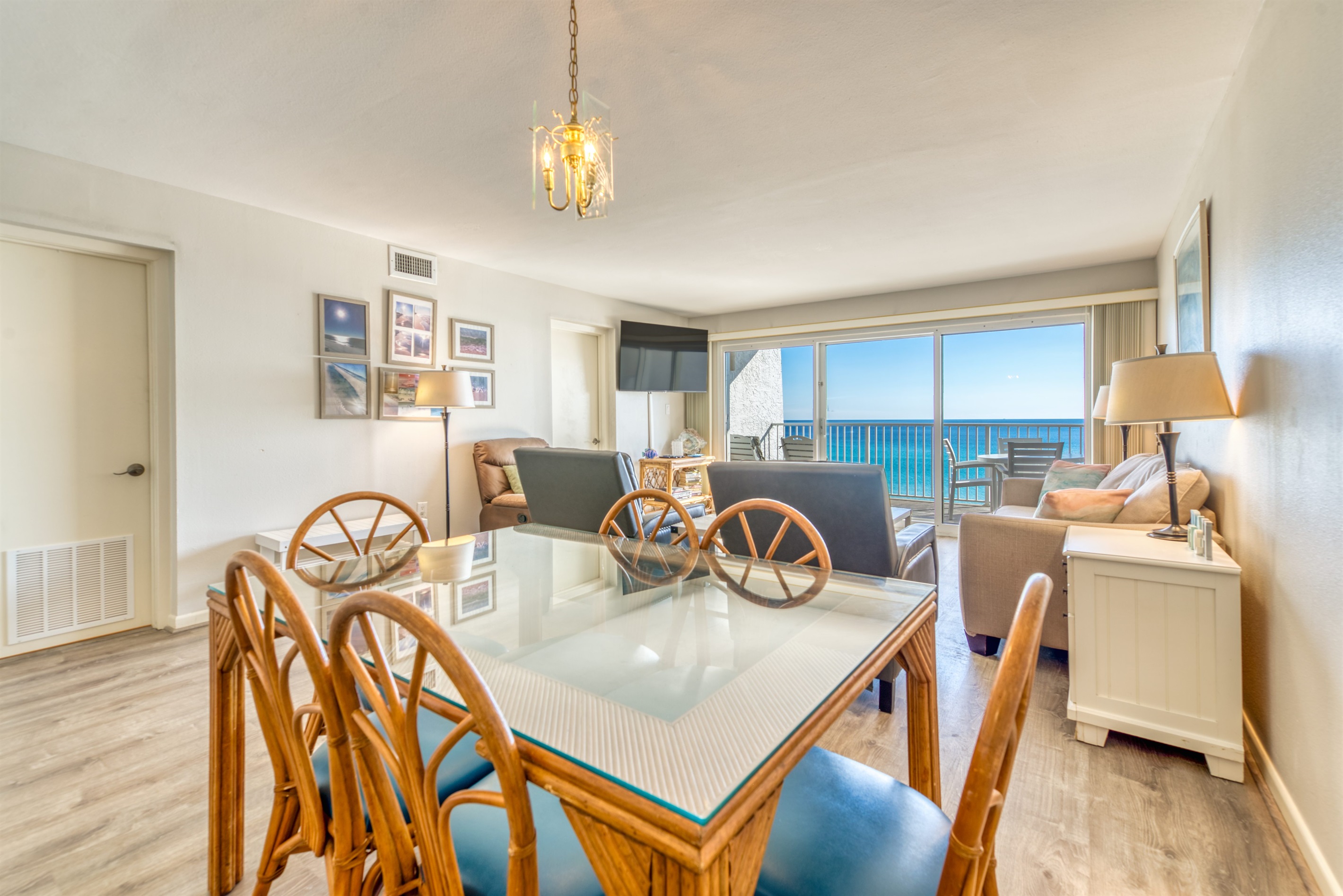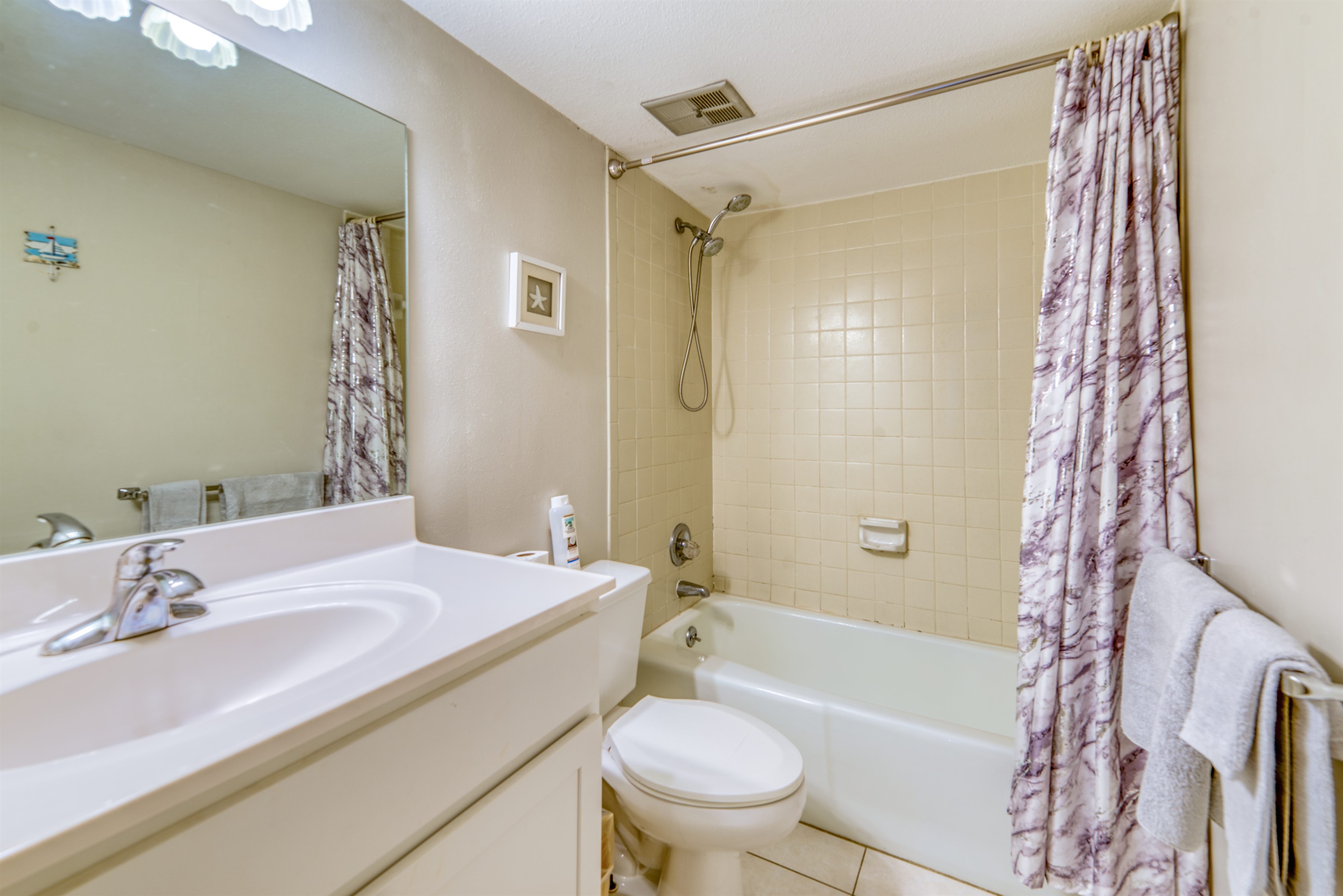 This condo can conveniently accommodate a party of 8. The master bedroom has a king-sized bed that comfortably sleeps 2, as well as a private, full bathroom attached to it. The guest bedroom has 1 queen size bed and 1 bunk bed along with an attached full bathroom that is also accessible from the living room area. The living room is equipped with plenty of comfortable seating for lounging and relaxing throughout the day during your breaks from the beach, as well as a pull-out sleeper sofa bed that can comfortably sleep 2. The total sleeping accommodations for this condo are 8 guests.
