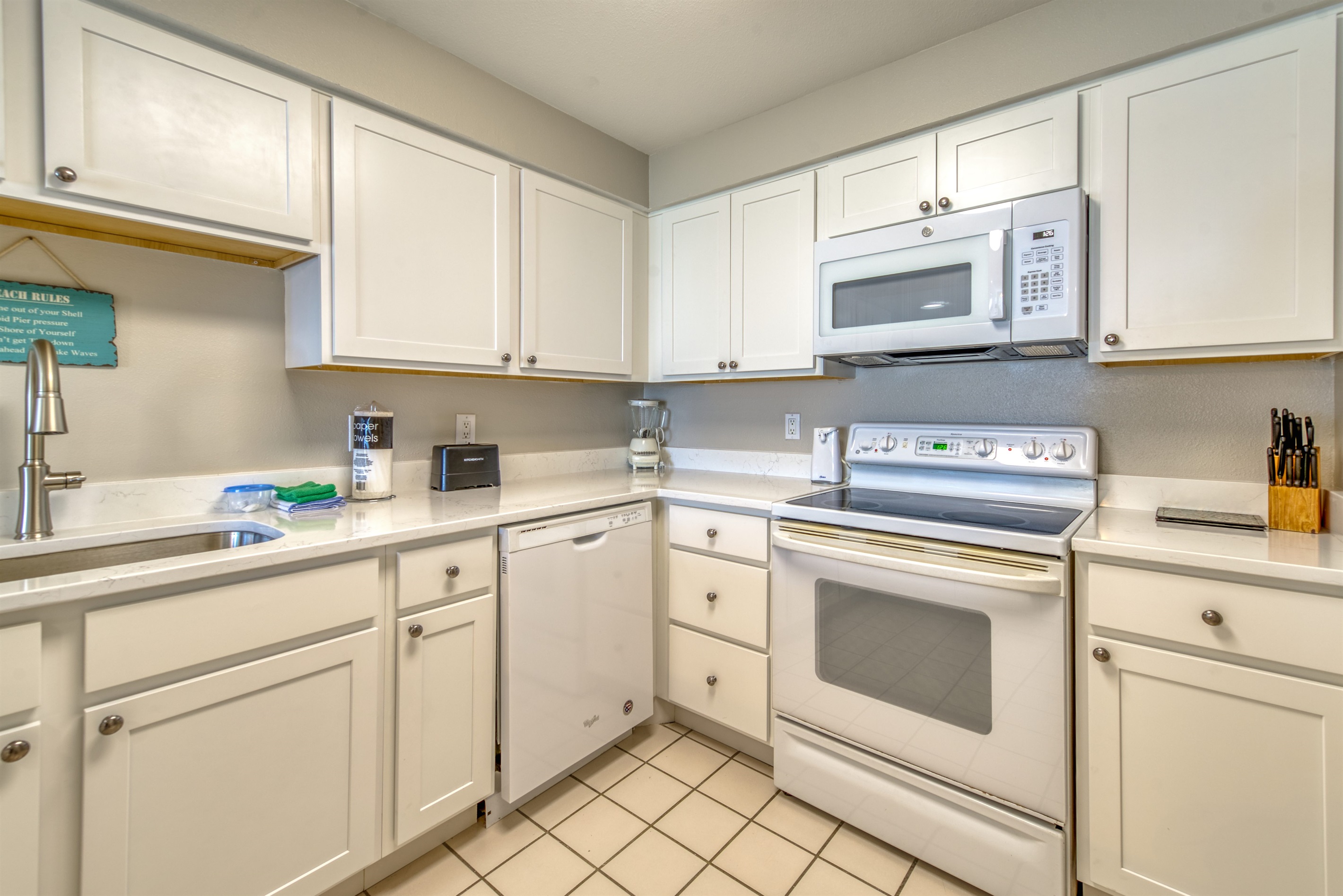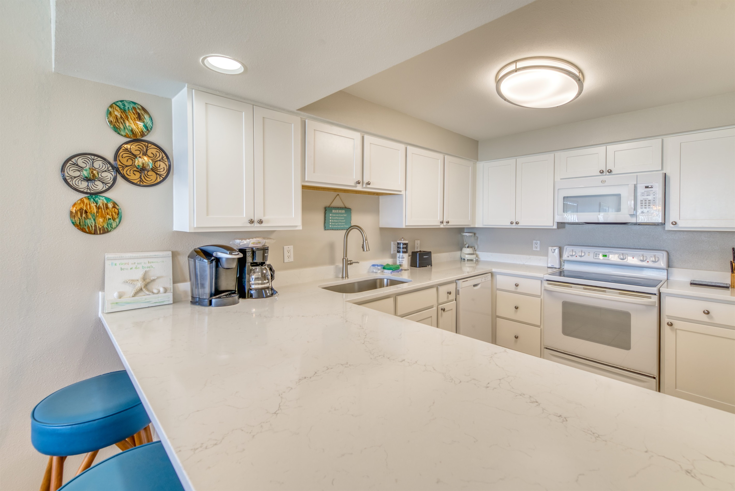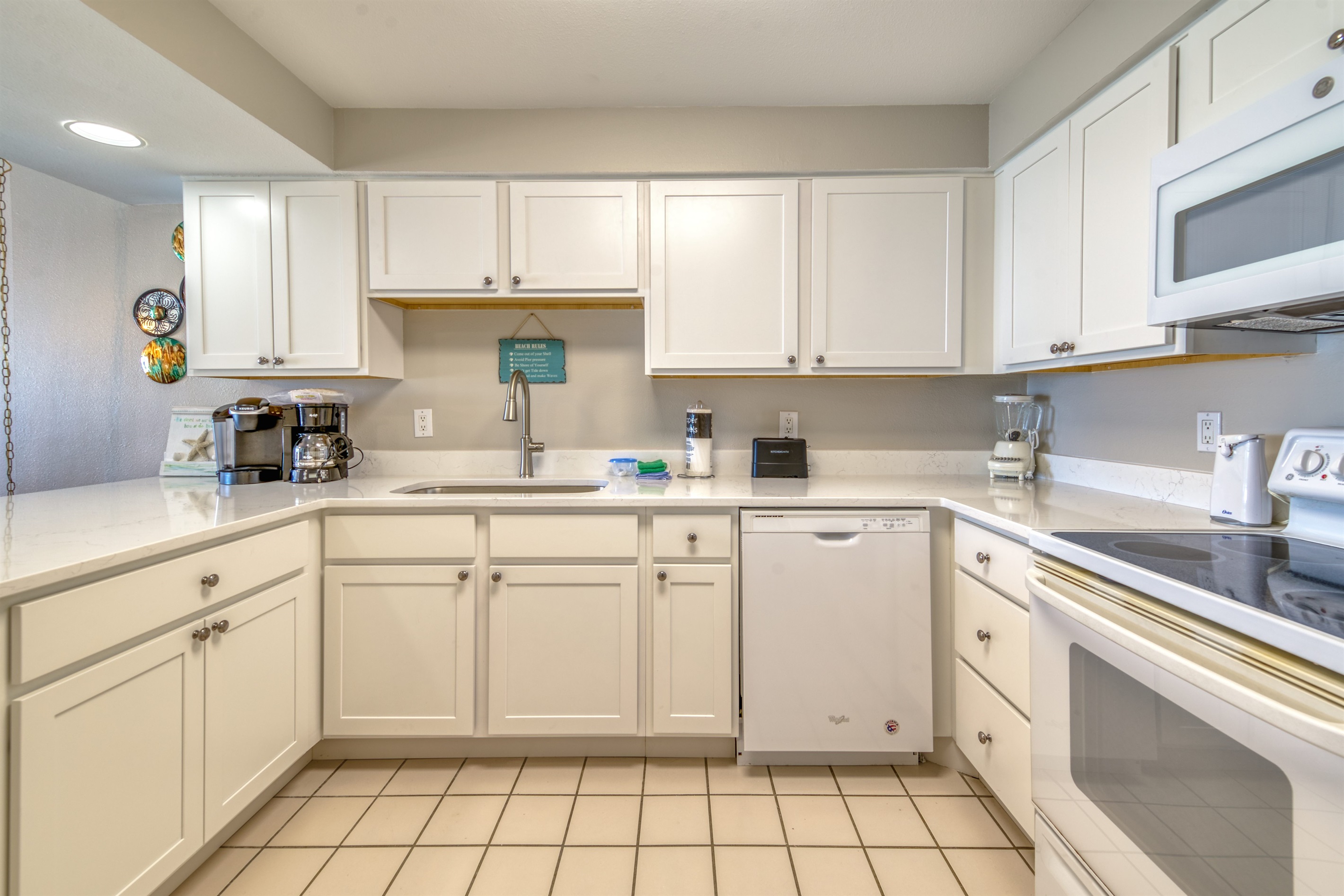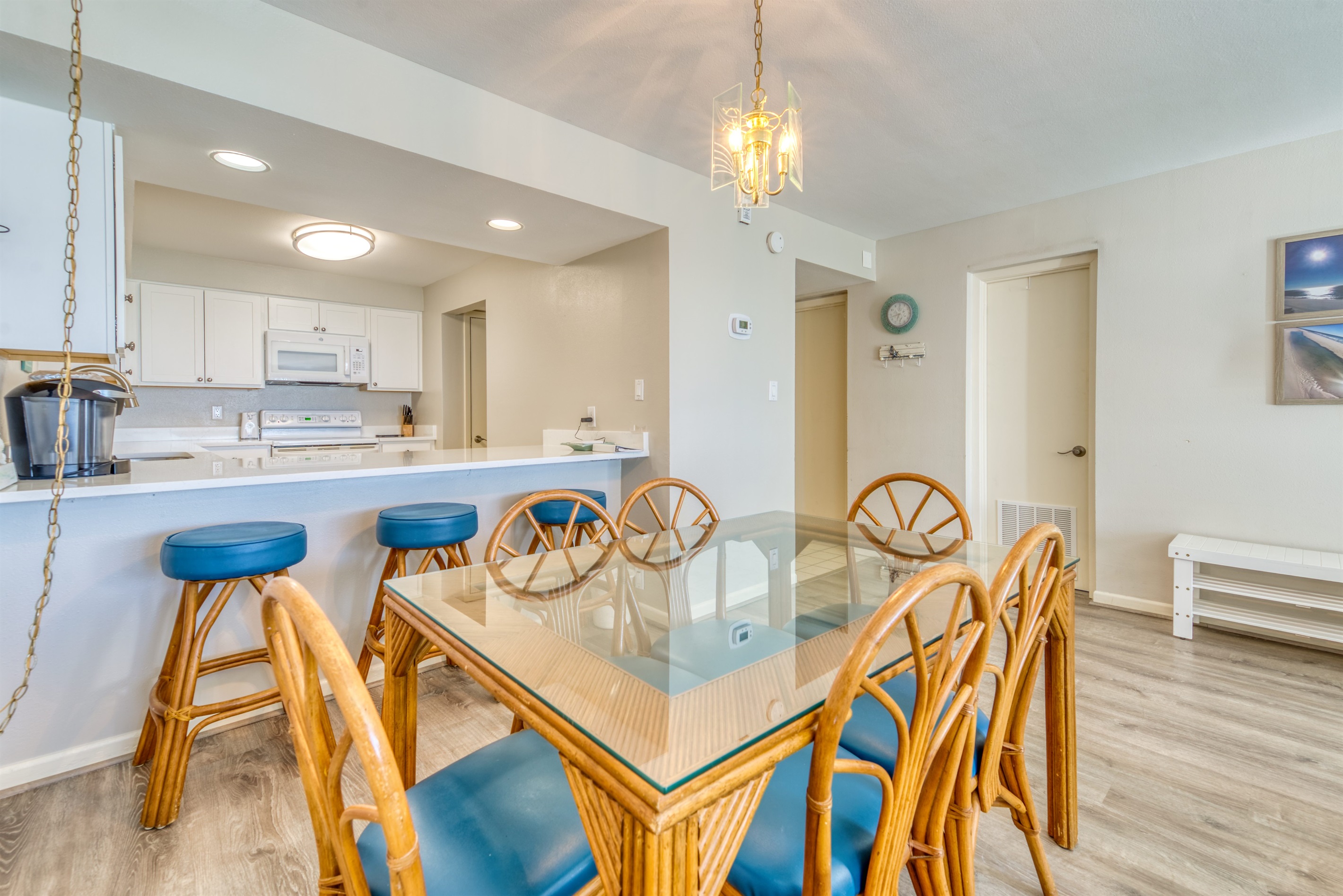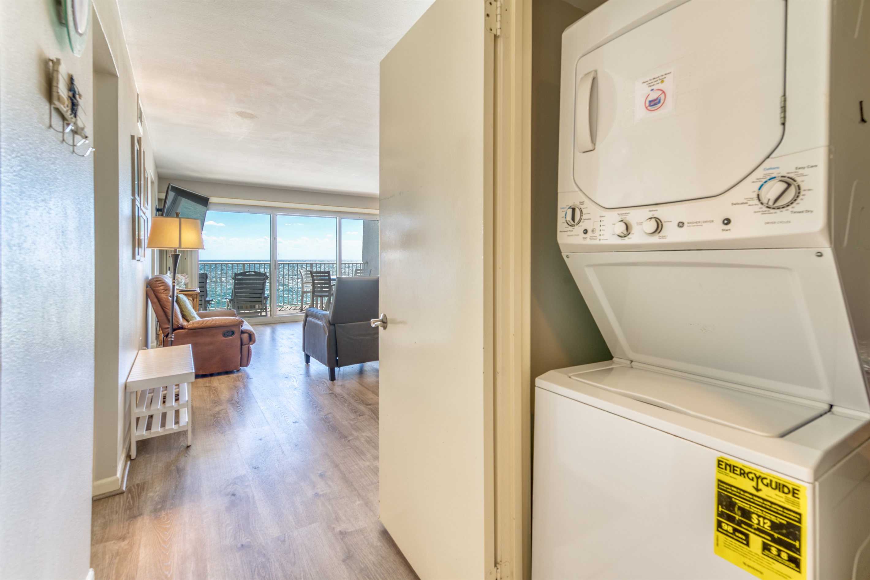 The kitchen is fully equipped with all major and small appliances including a refrigerator, stove, dishwasher, and microwave & more. Cookware, utensils, and table service are all included, with a private washer and dryer located conveniently inside the condo.