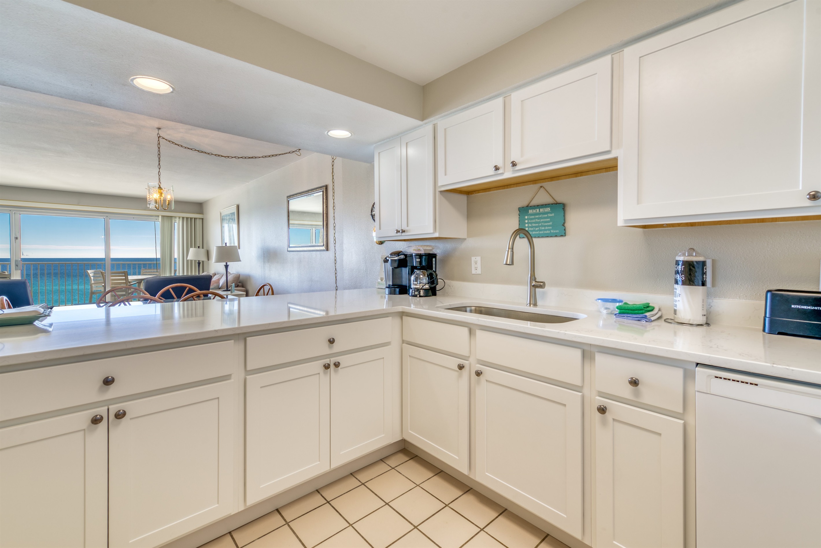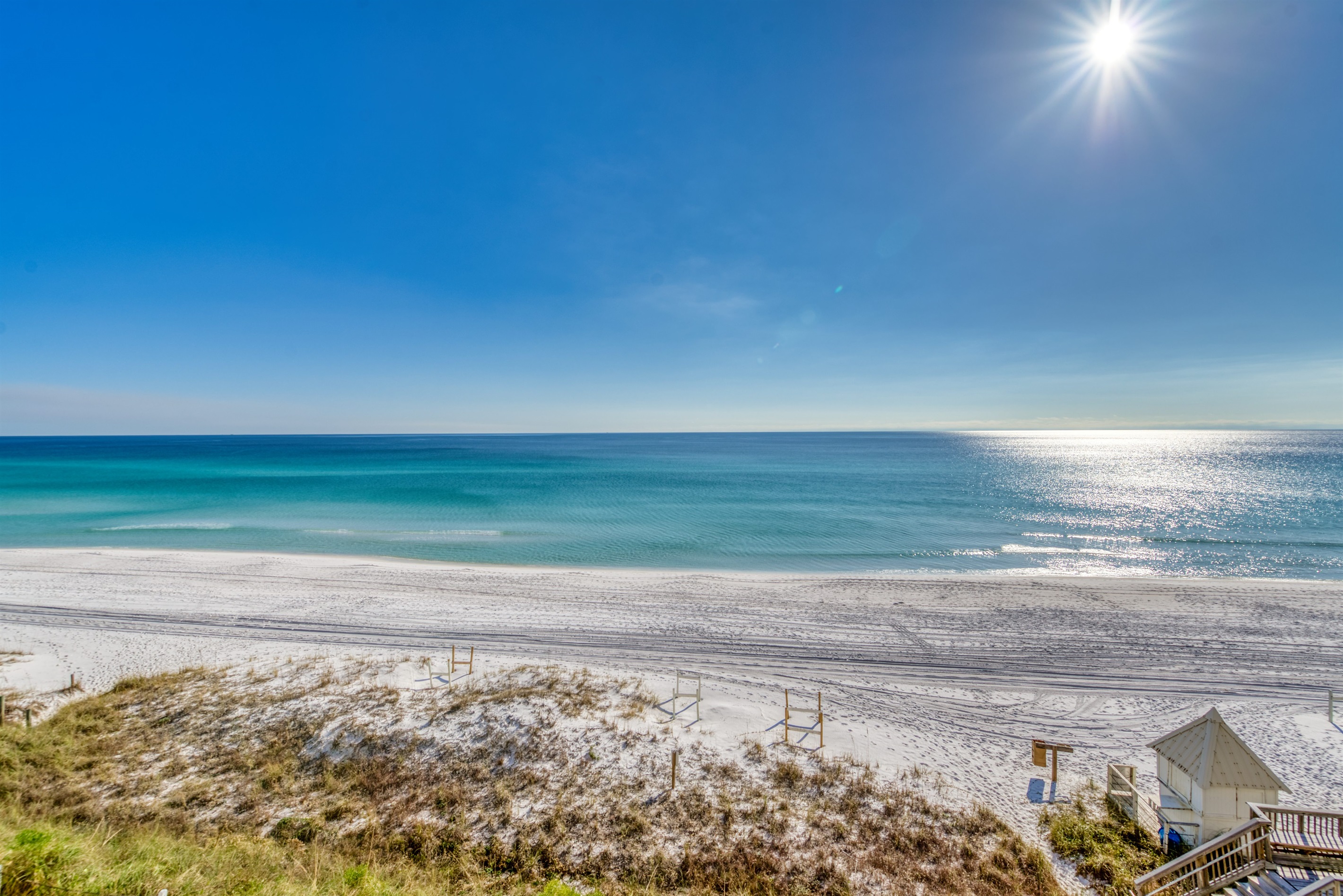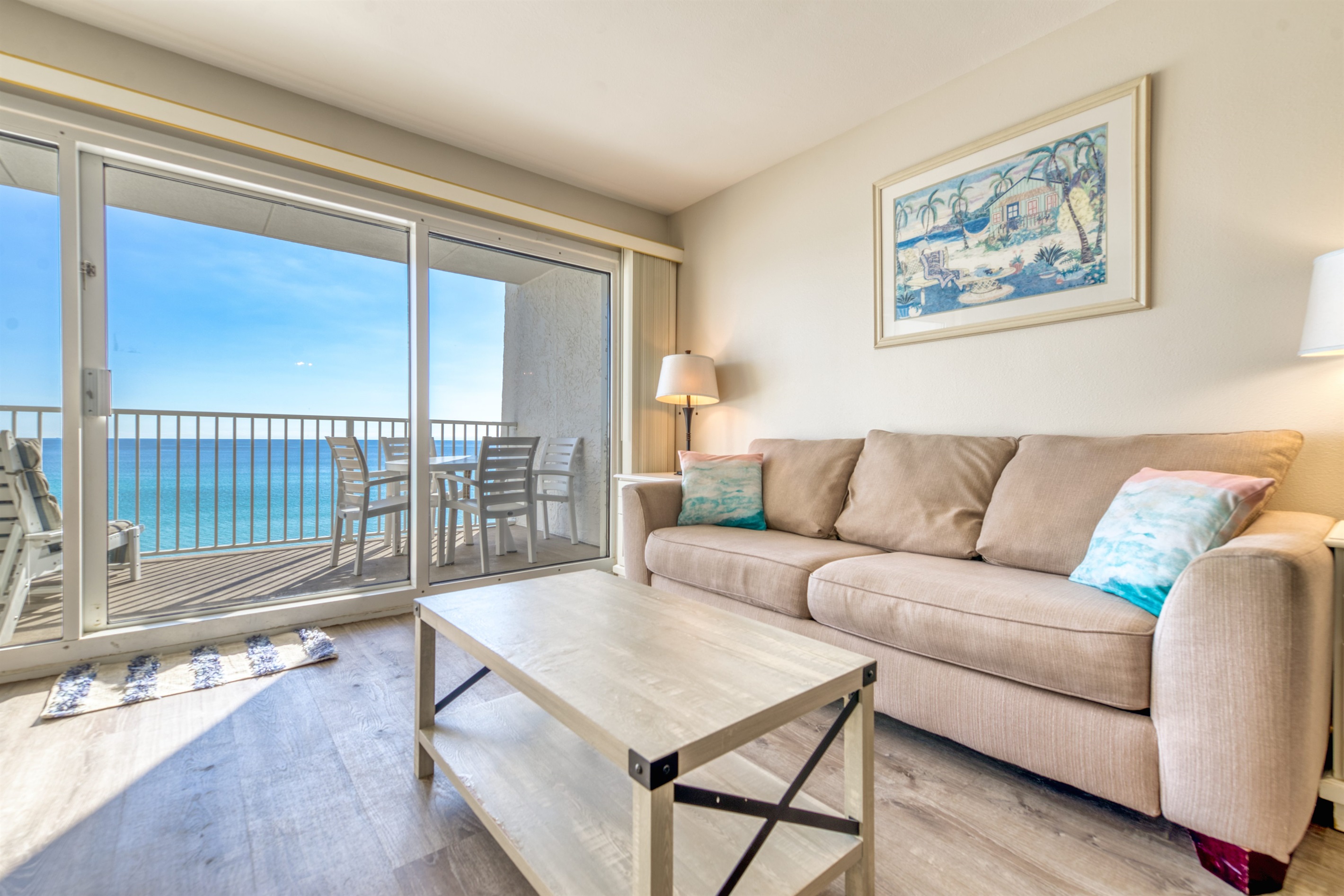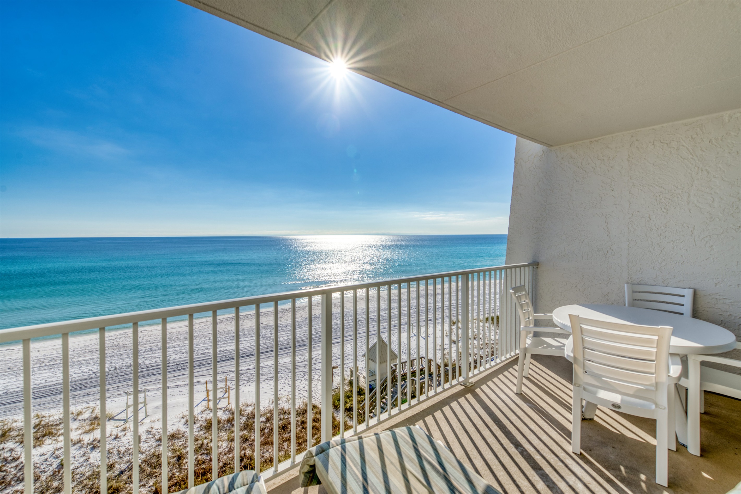 Enter condo B402 at Beach House Condominiums to an open, airy beachy welcome! This property is located directly on the beach with no streets to cross. It is a beautiful two-bedroom, two-bathroom condo sits on the 4th floor and it is centrally located near the pool deck, gazebo, tennis courts, and grill area. Stepping outside onto the covered balcony, you are met with a gorgeous view of the Gulf of Mexico and the white sandy beaches of the Emerald Coast! You can hear the waves crashing and almost feel the surf splash right from the balcony!