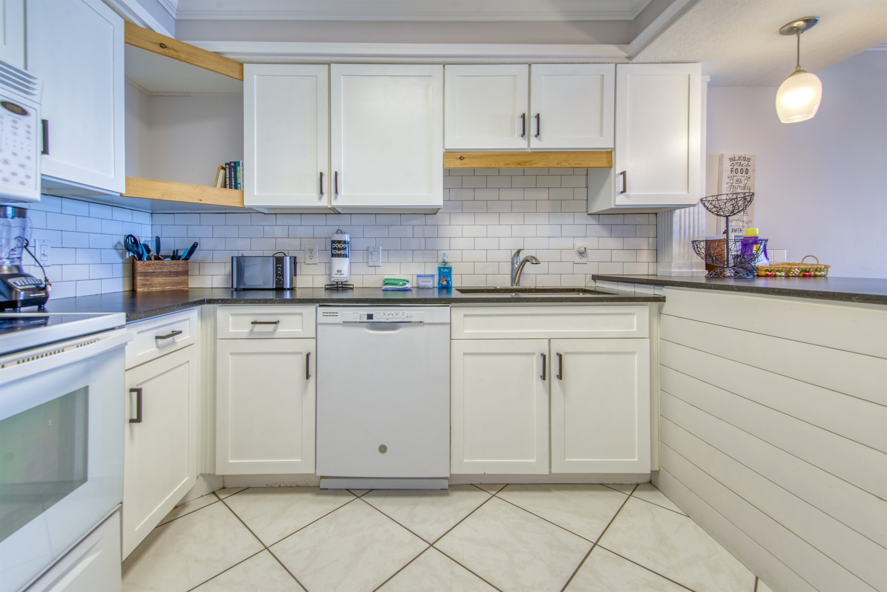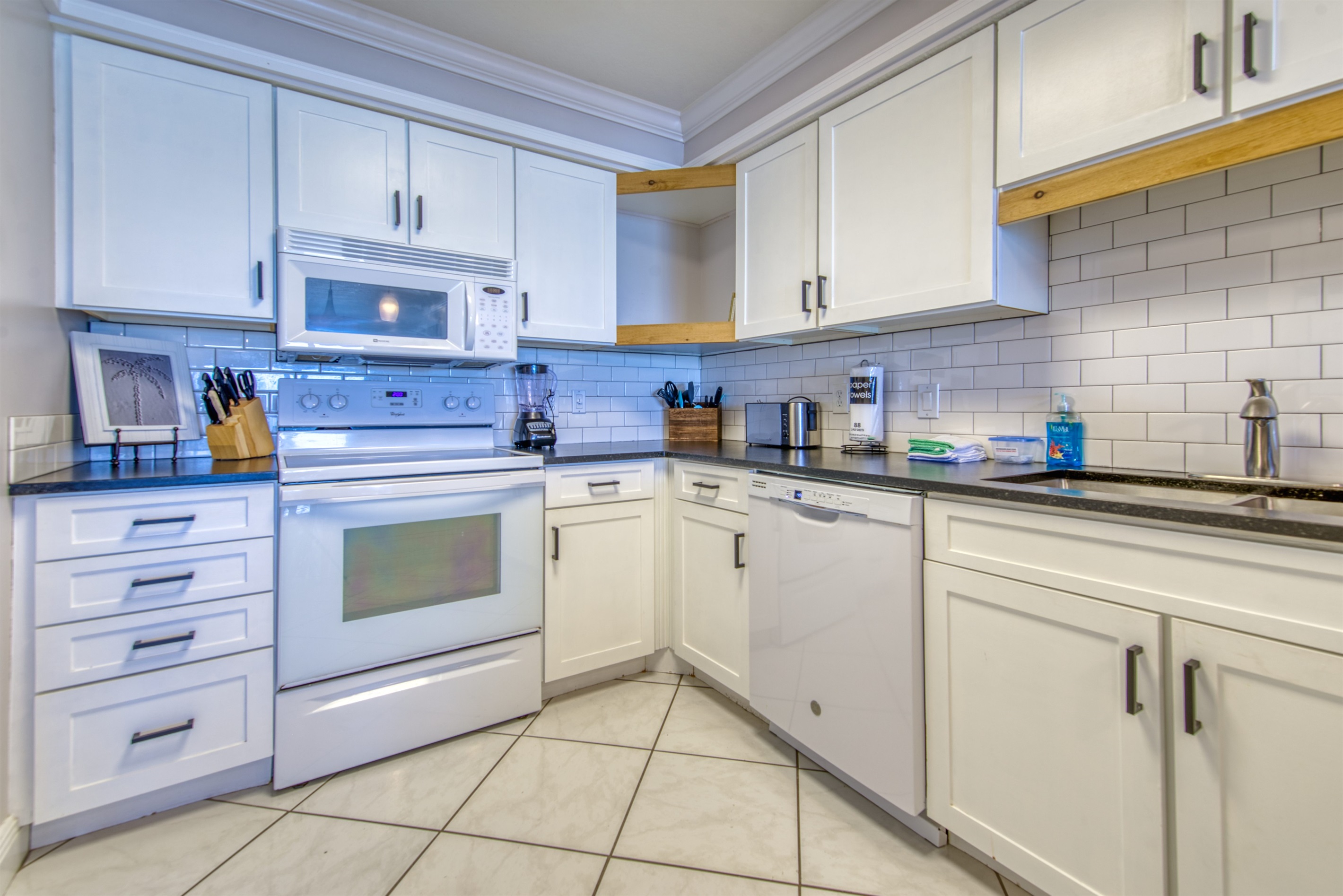 The kitchen is fully equipped with all major and small appliances including a refrigerator, stove, dishwasher, microwave & more. Cookware, utensils, and table service are all included, with a private washer and dryer located conveniently inside the condo.