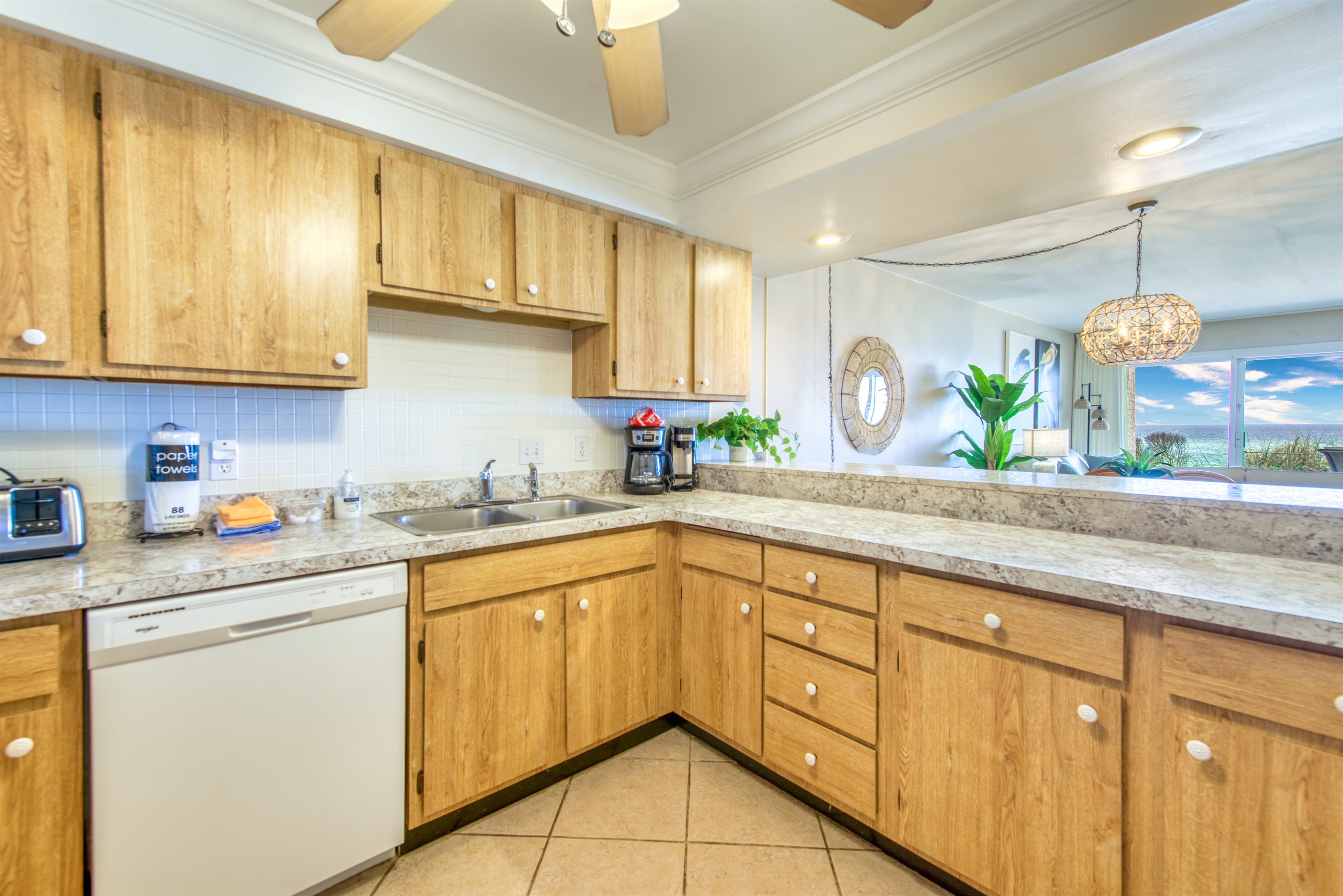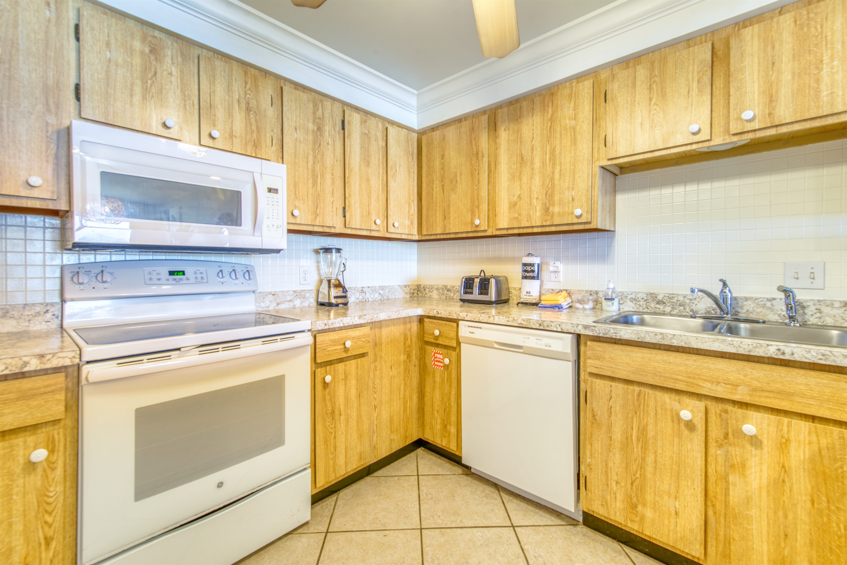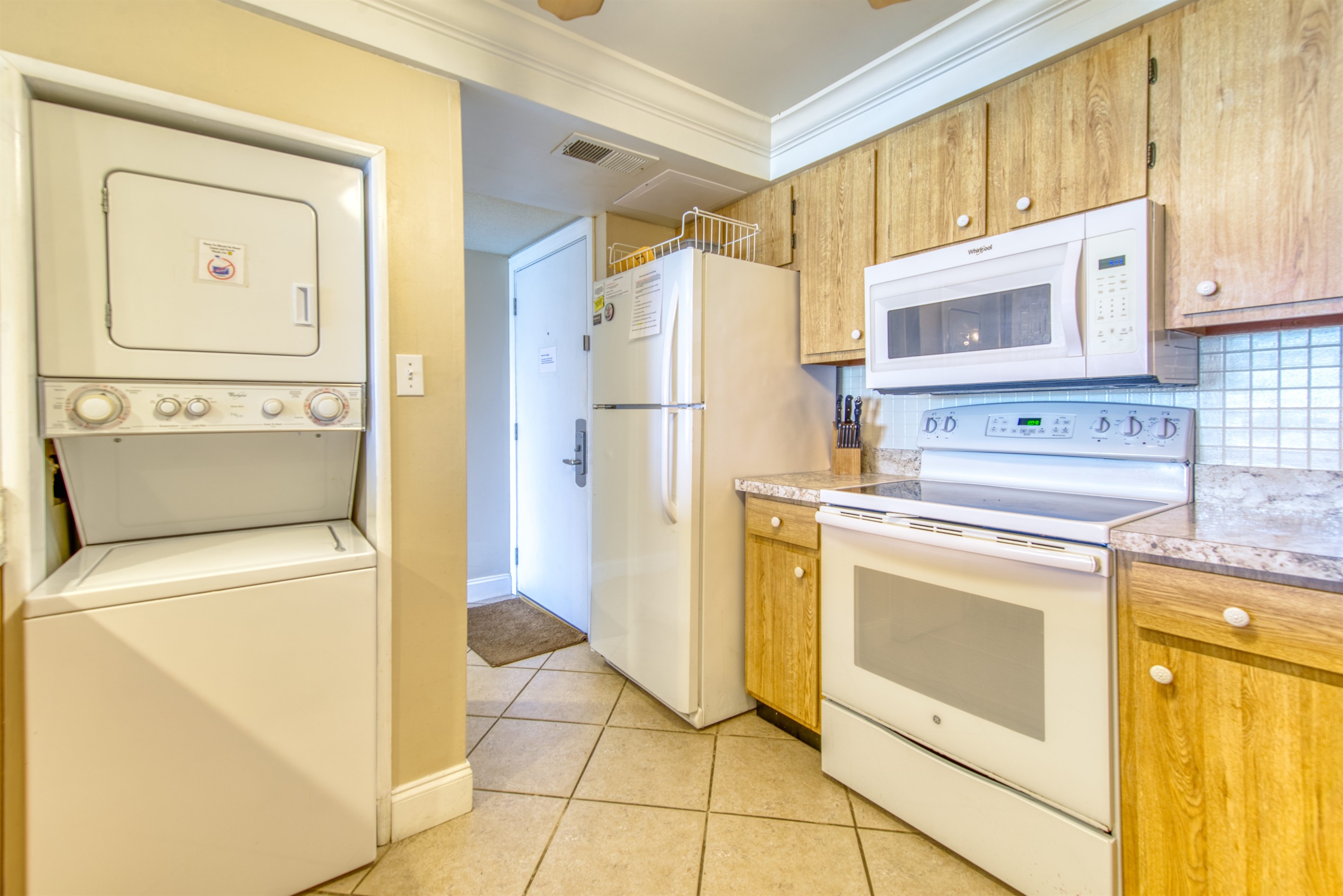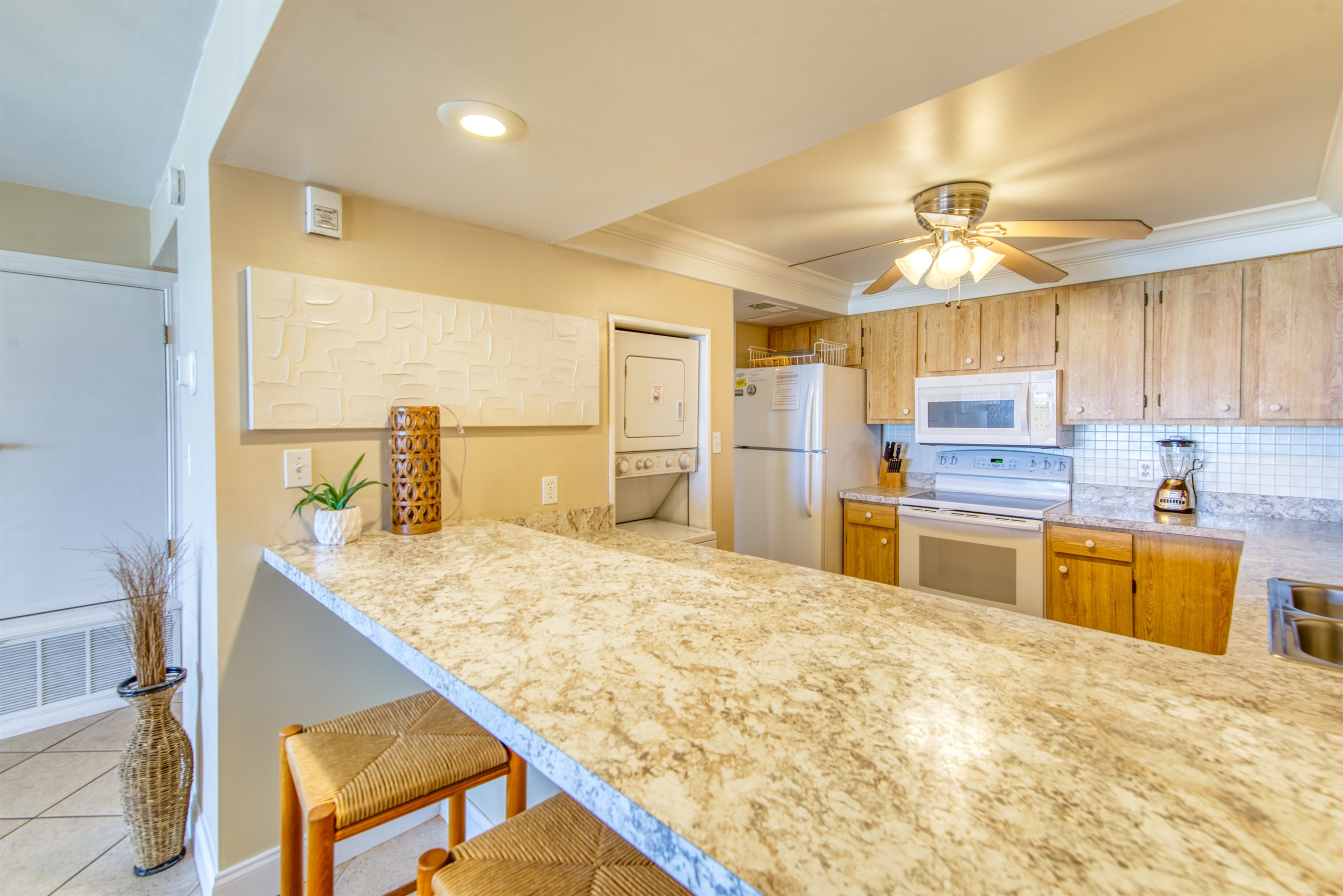 The kitchen is fully equipped with all major and small appliances including refrigerator, stove, dishwasher and microwave & more. Cookware, utensils, and table service are all included, with a private washer and dryer located conveniently inside the condo.