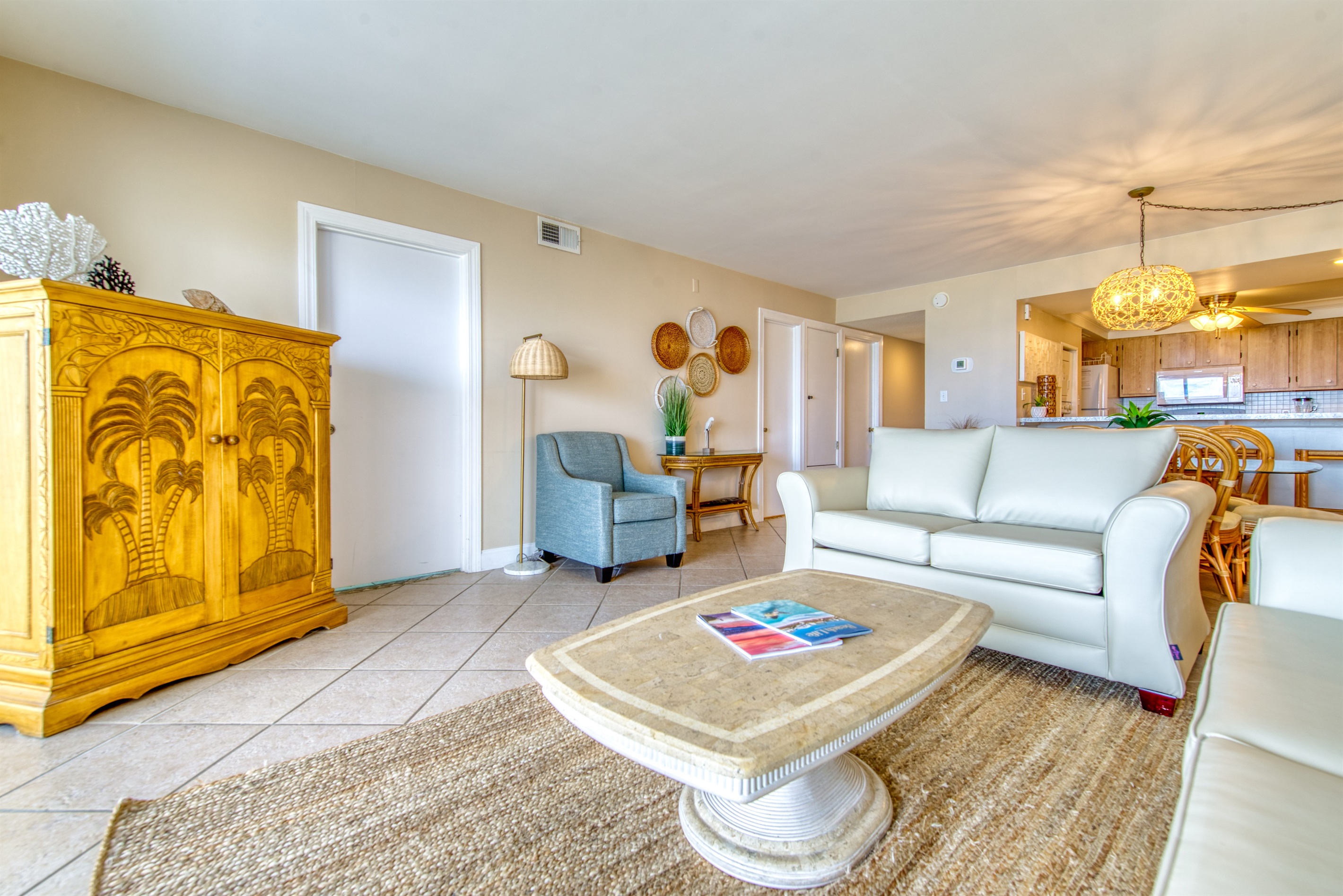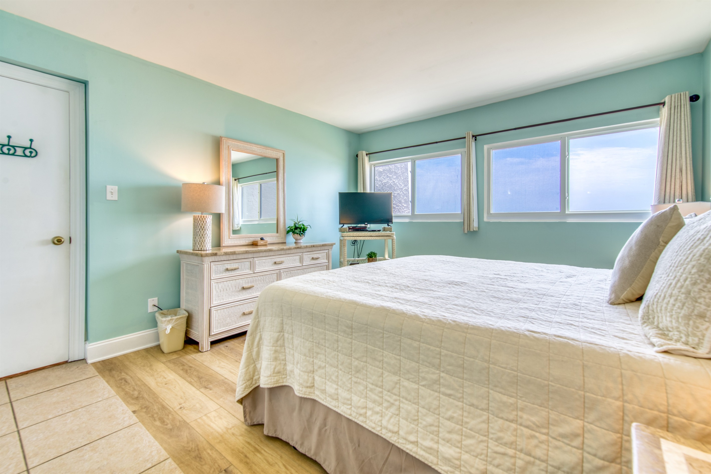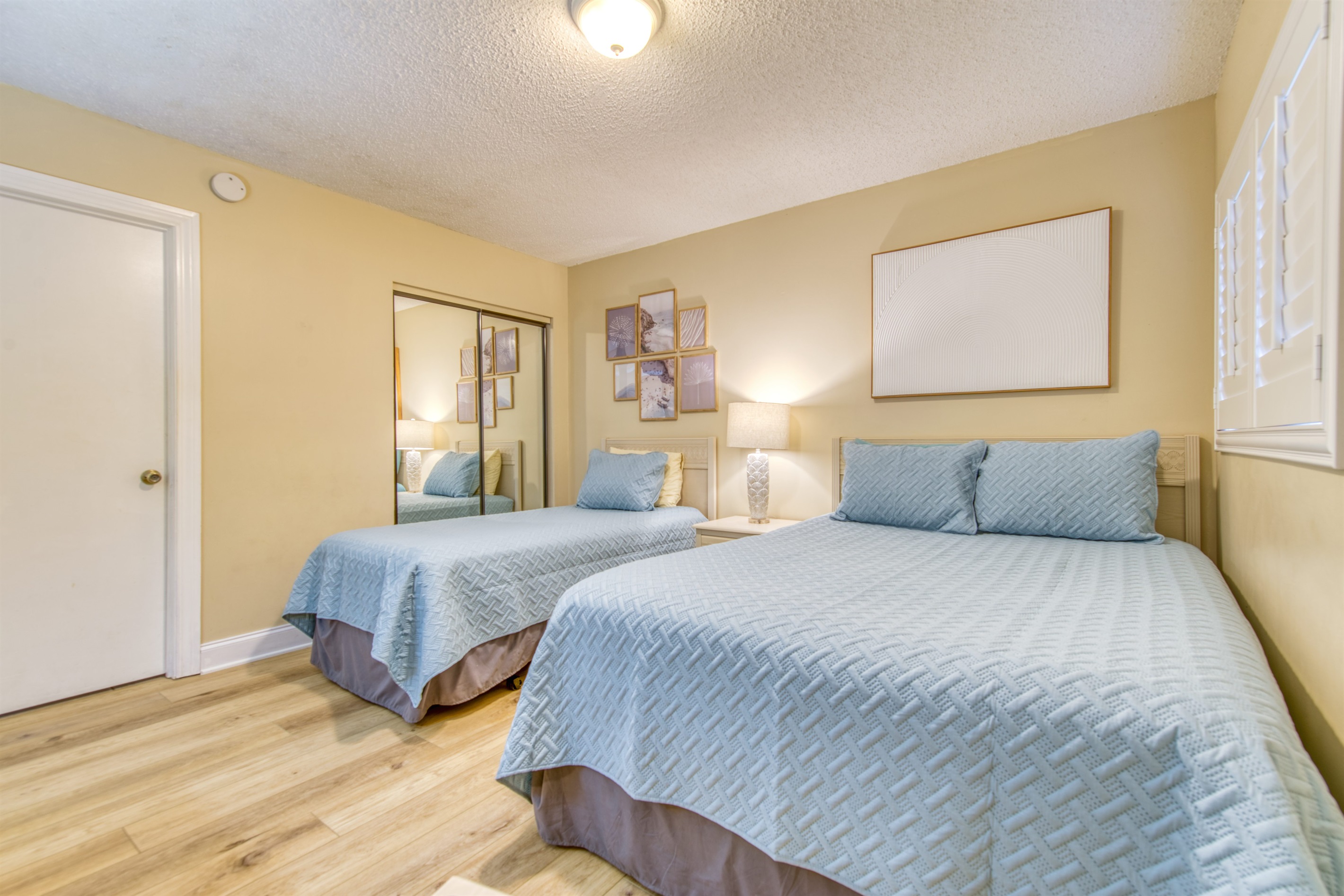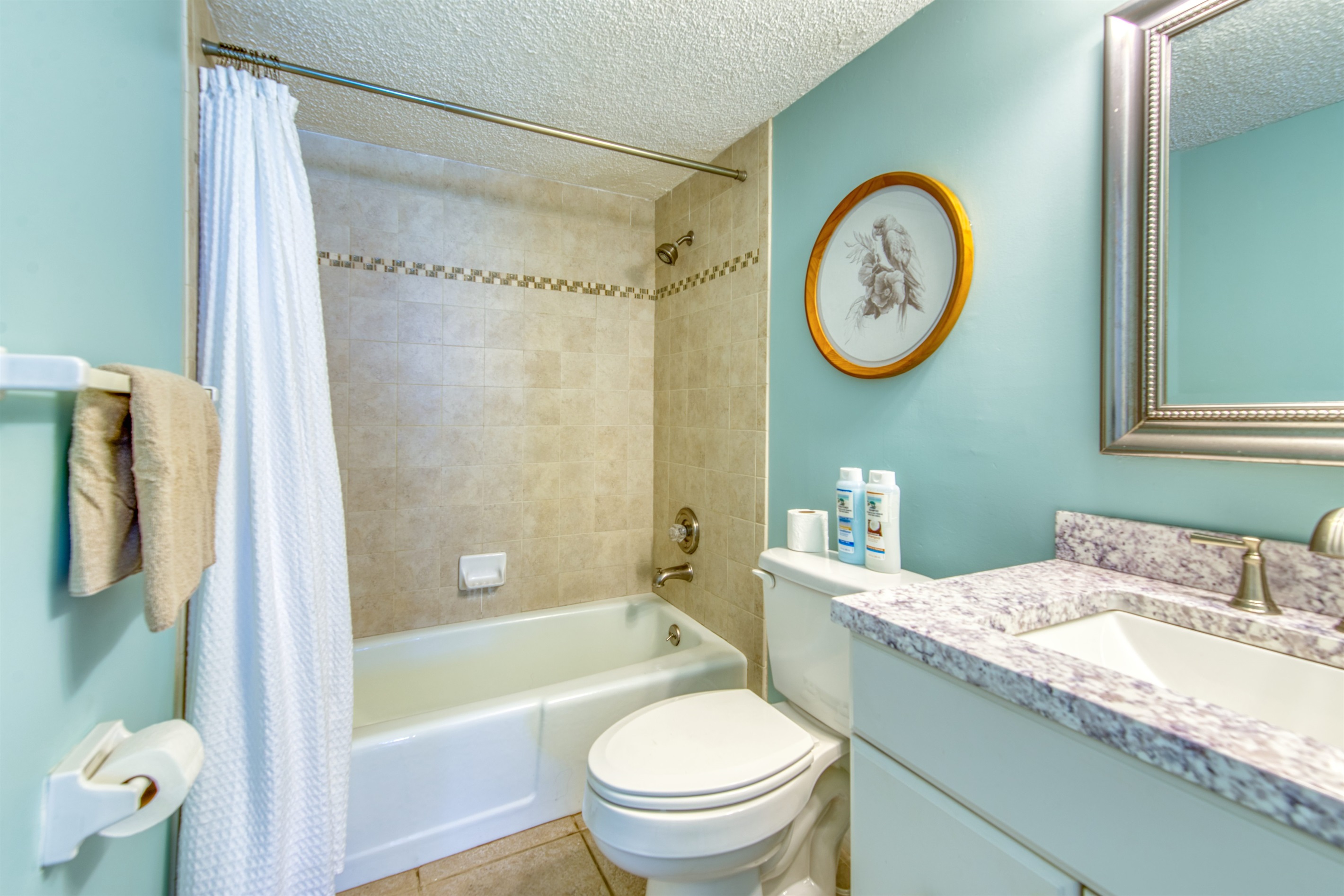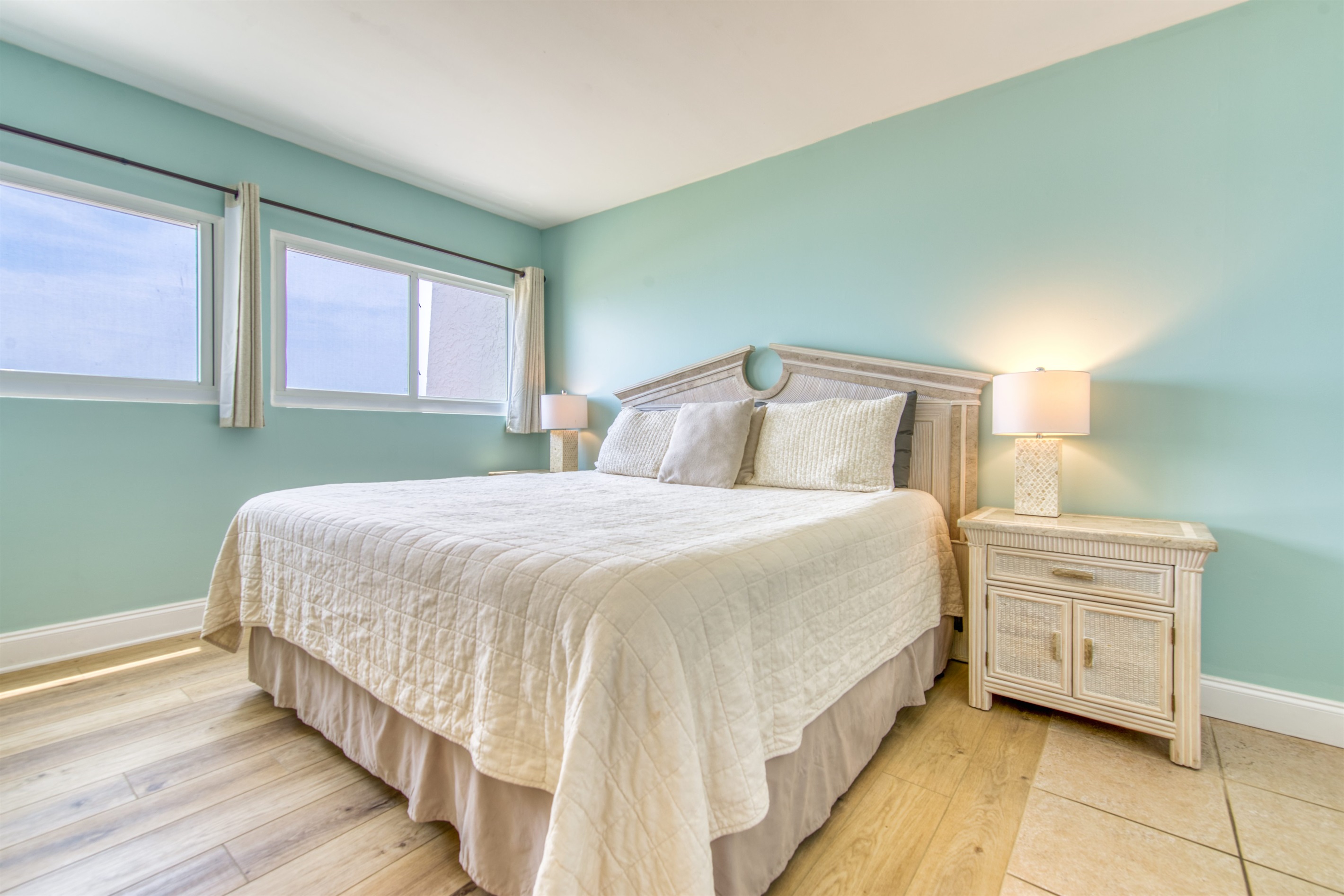 This condo can conveniently accommodate a party of 7. The master bedroom has a king-sized bed that comfortably sleeps 2, as well as a private, full bathroom attached to it. The guest bedroom has 1 queen size bed and 1 twin bed along with an attached full bathroom that is also accessible from the living room area. The living room is equipped with plenty of comfortable seating for lounging and relaxing throughout the day during your breaks from the beach, as well as a pull-out sleeper sofa bed that can comfortably sleep 2. The total sleeping accommodations for this condo is 7 guests.
