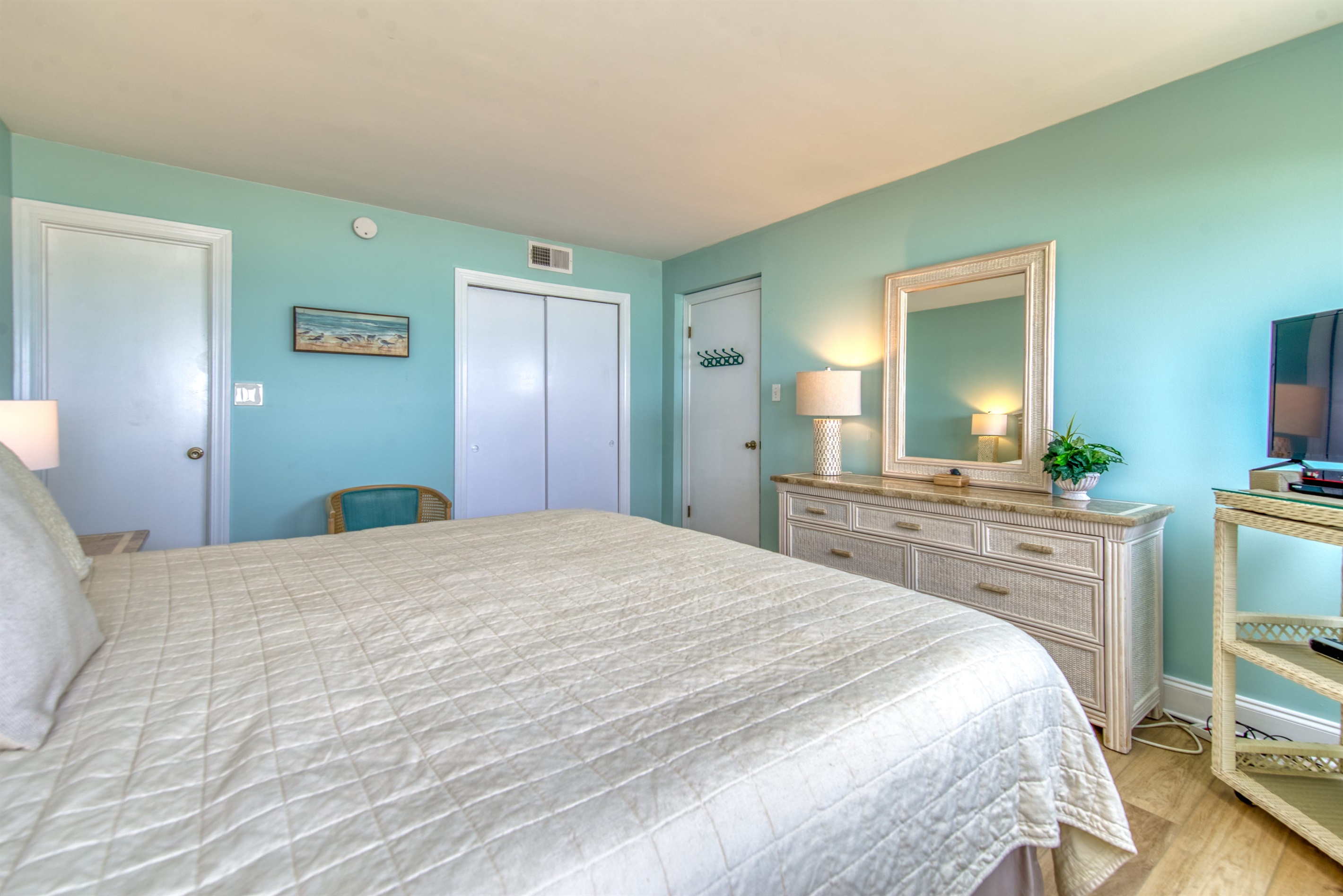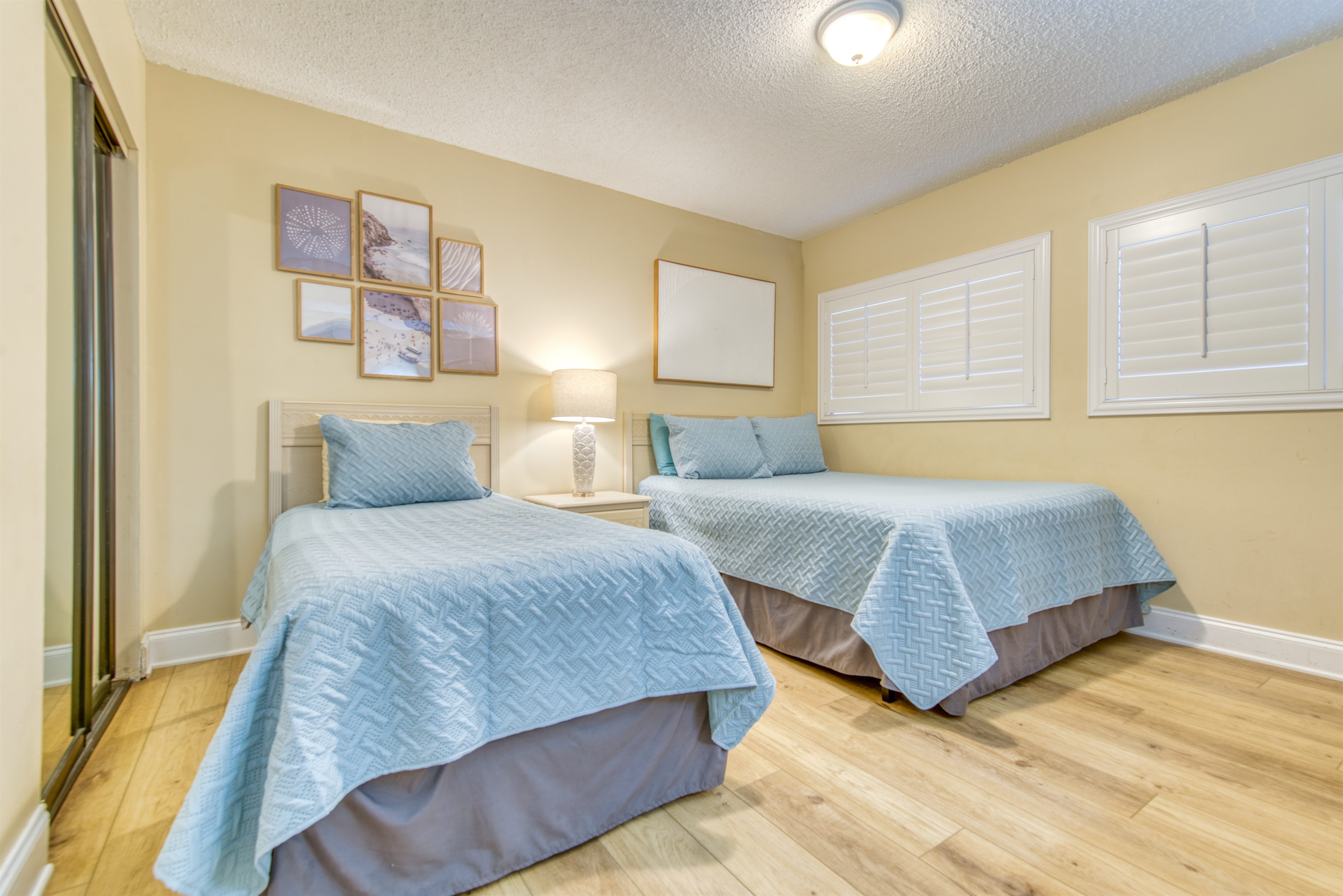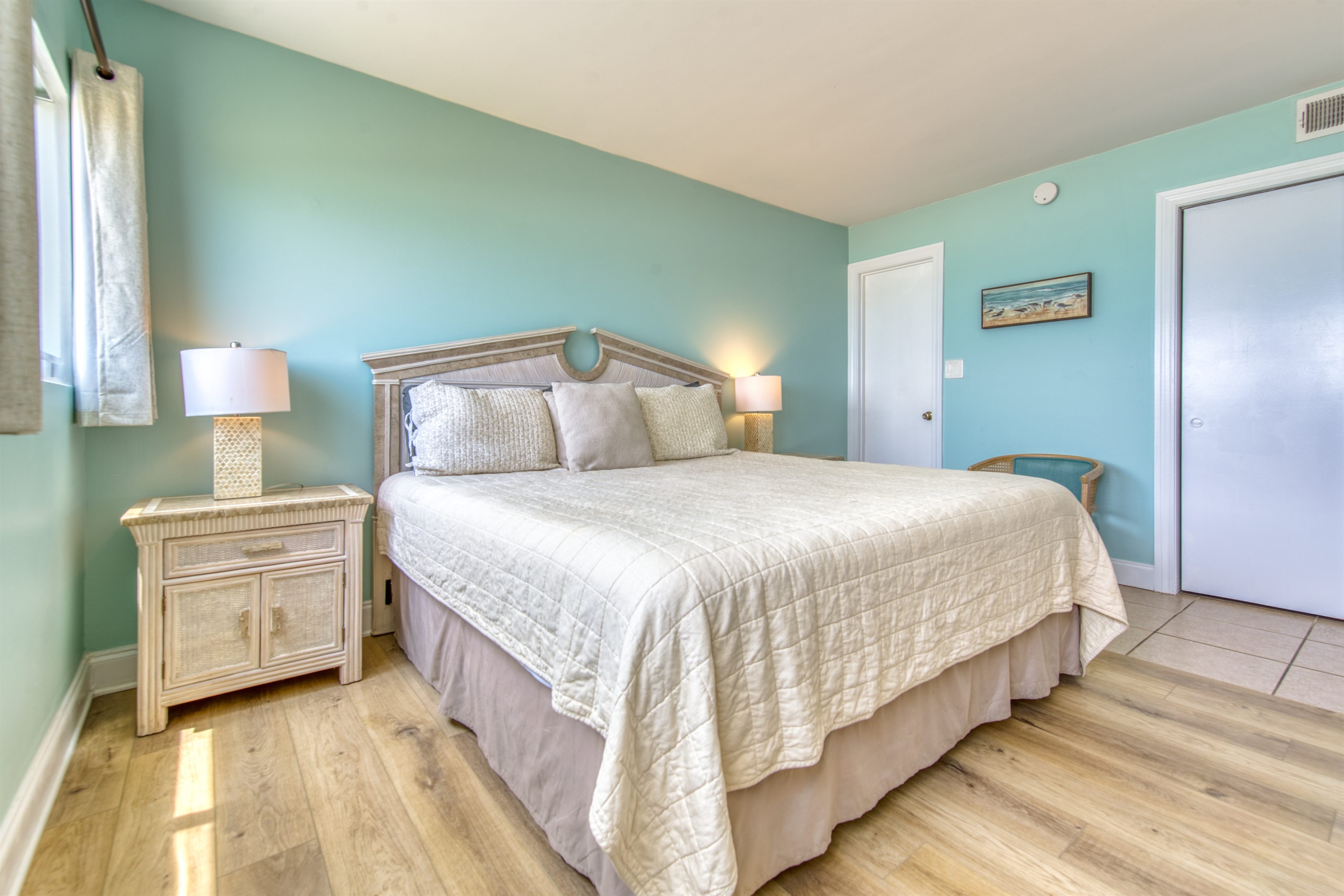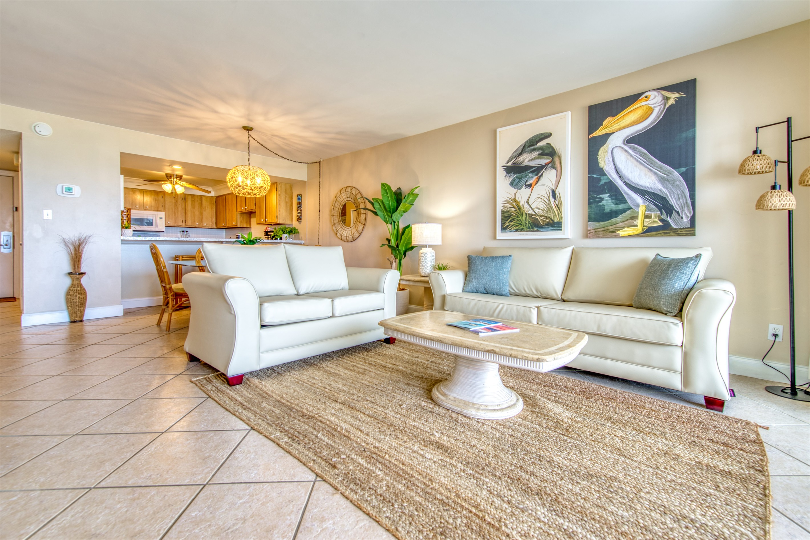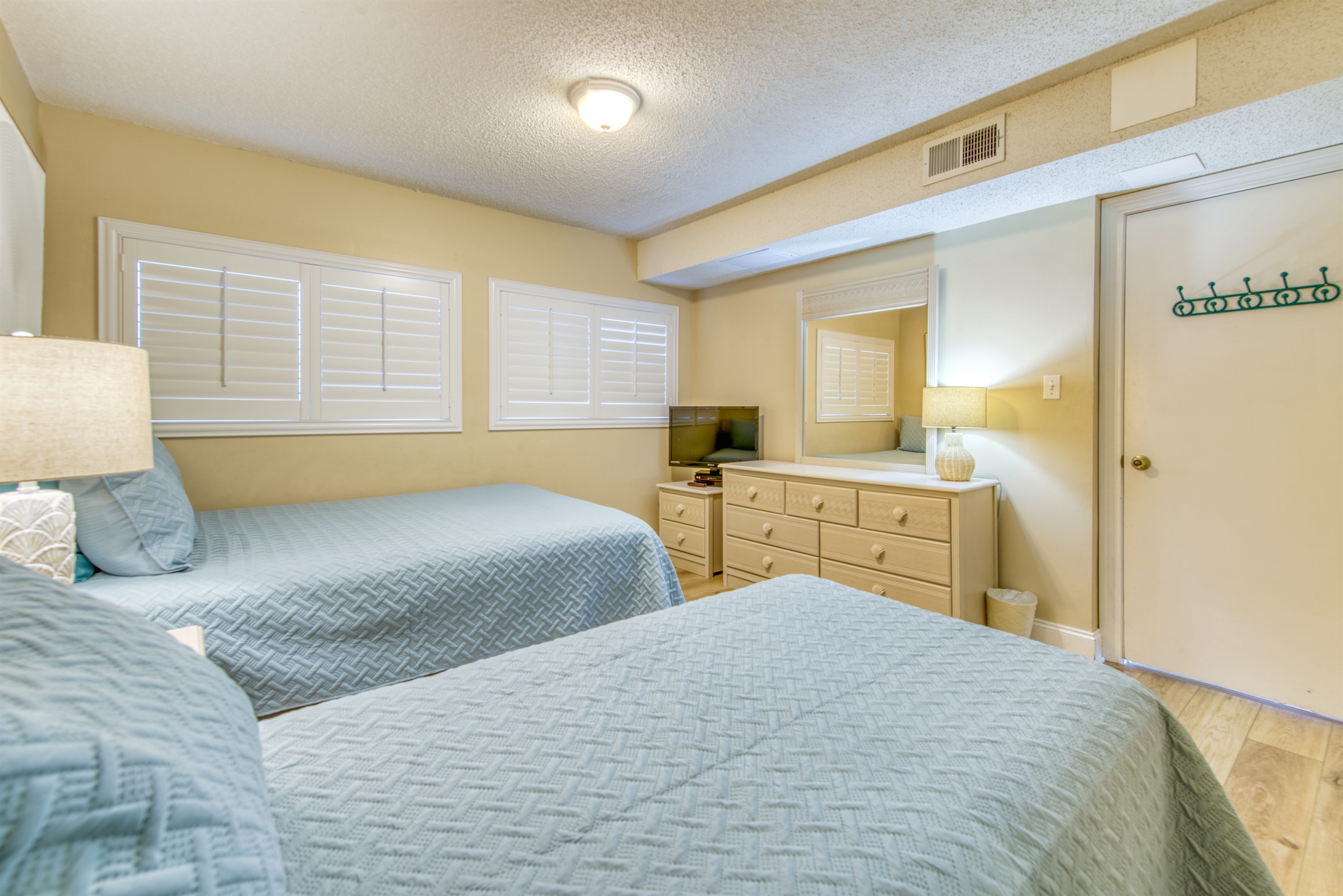 This condo can conveniently accommodate a party of 7. The master bedroom has a king-sized bed that comfortably sleeps 2, as well as a private, full bathroom attached to it. The guest bedroom has 1 queen size bed and 1 twin bed along with an attached full bathroom that is also accessible from the living room area. The living room is equipped with plenty of comfortable seating for lounging and relaxing throughout the day during your breaks from the beach, as well as a pull-out sleeper sofa bed that can comfortably sleep 2. The total sleeping accommodations for this condo is 7 guests.
