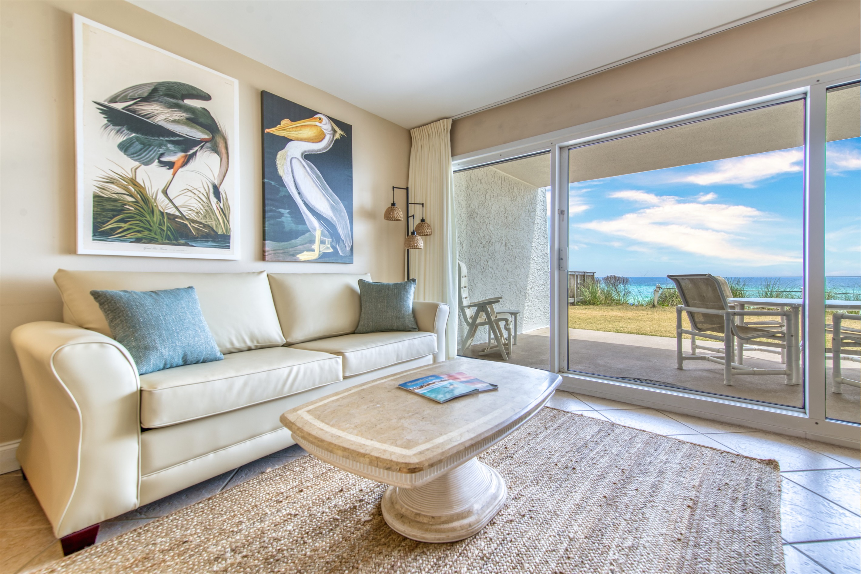 Enter condo D104 at Beach House Condominiums to an open, airy beachy welcome! This property is located directly on the beach with no streets to cross. It is a beautiful two bedroom, two bathroom condo sits on the ground floor and it is located on the west end of the property. Stepping outside onto the covered walk out patio, you are met with a gorgeous view of the Gulf of Mexico and the white sandy beaches of the Emerald Coast! You can hear the waves crashing and almost feel the surf splash right from the walk out patio!