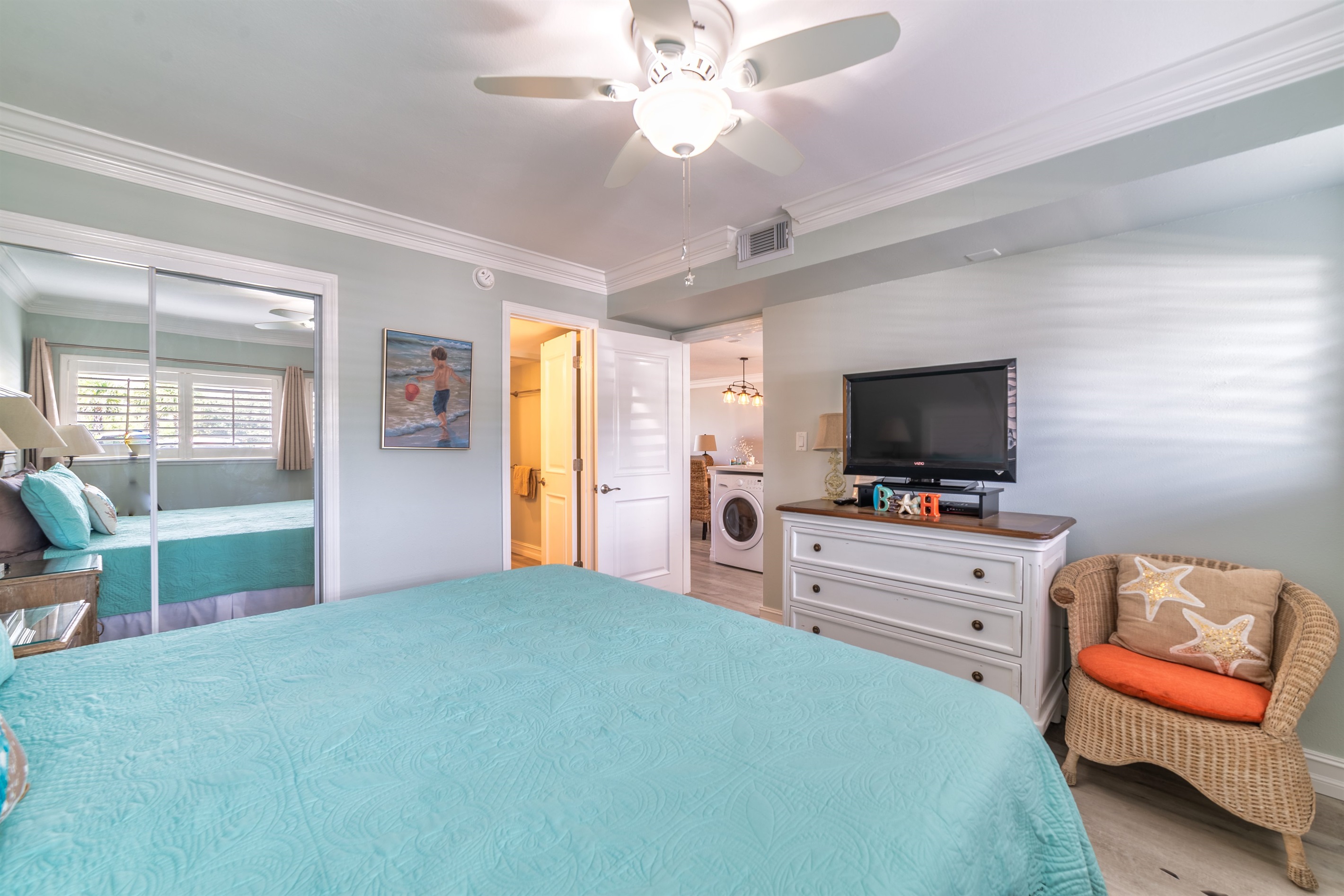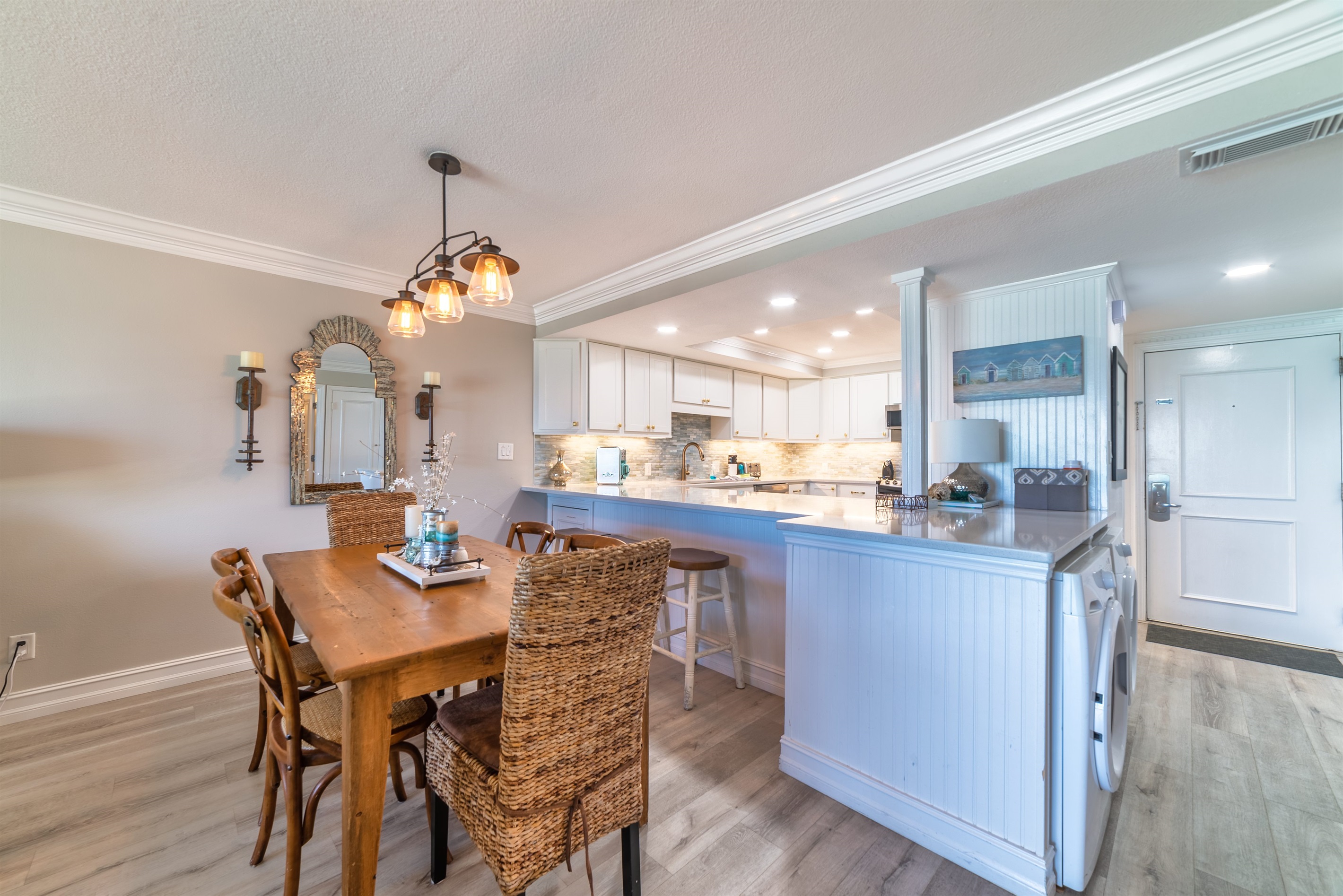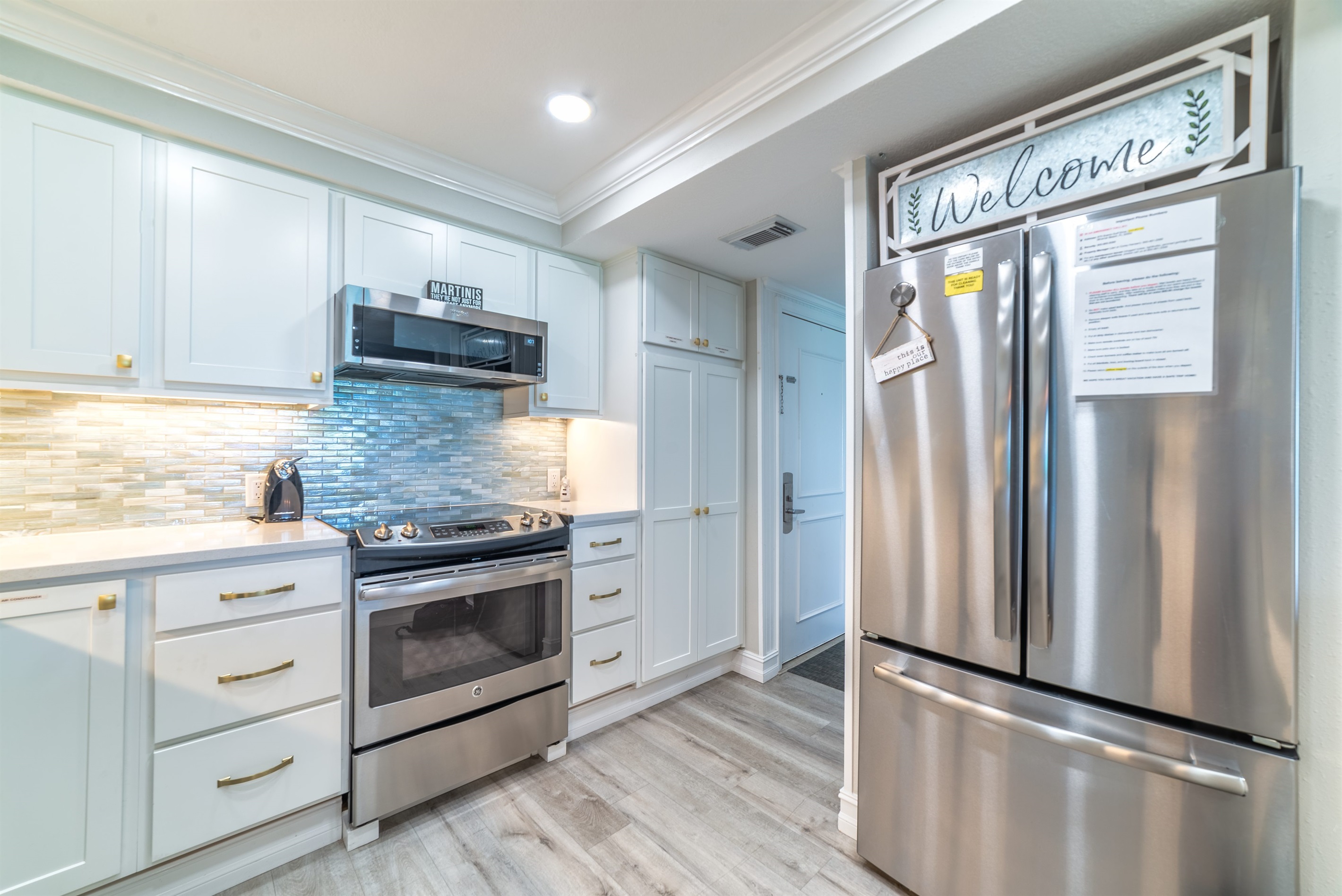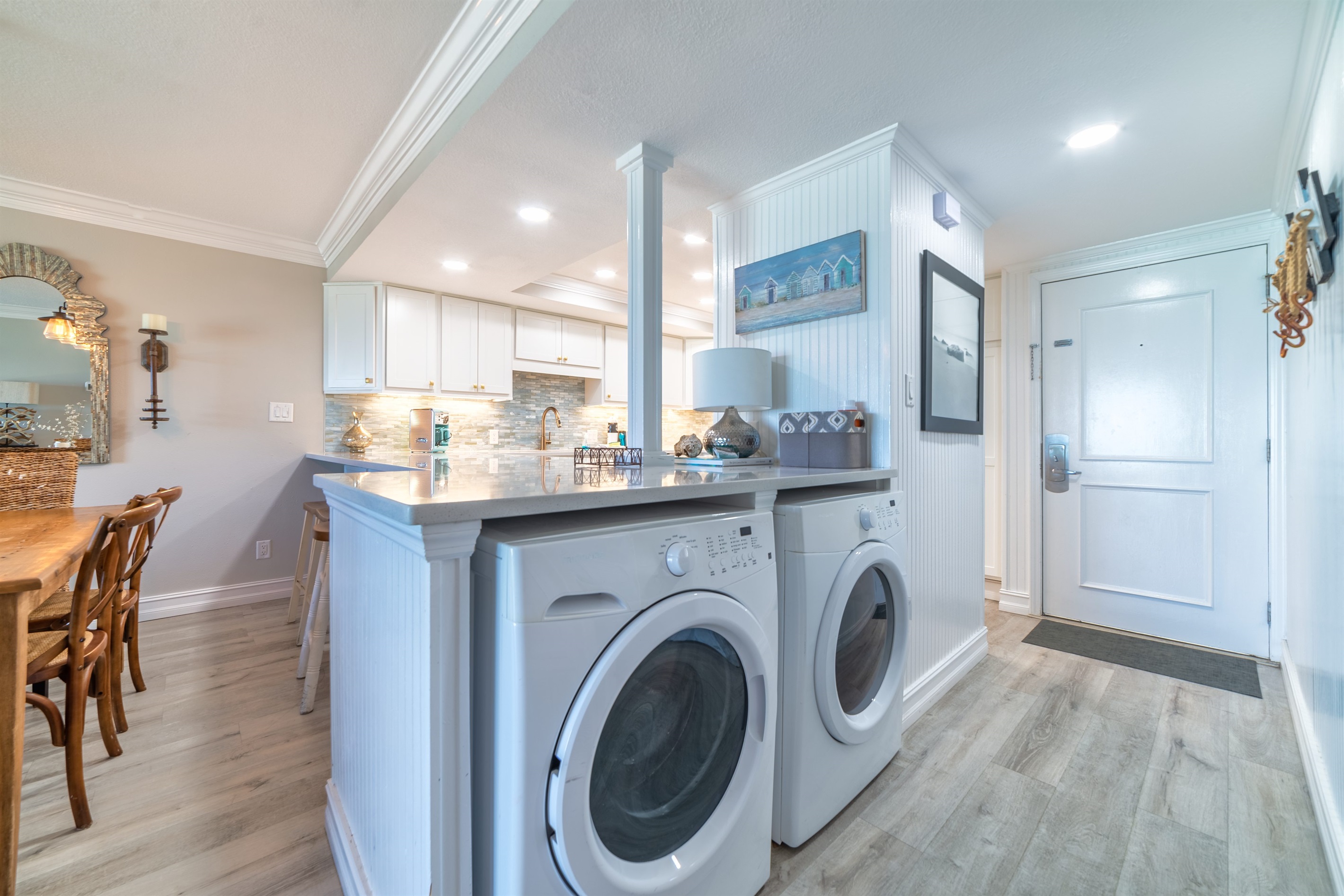 The kitchen is fully equipped with all major and small appliances including refrigerator, stove, dishwasher and microwave & more. Cookware, utensils, and table service are all included, with a private washer and dryer located conveniently inside the condo.