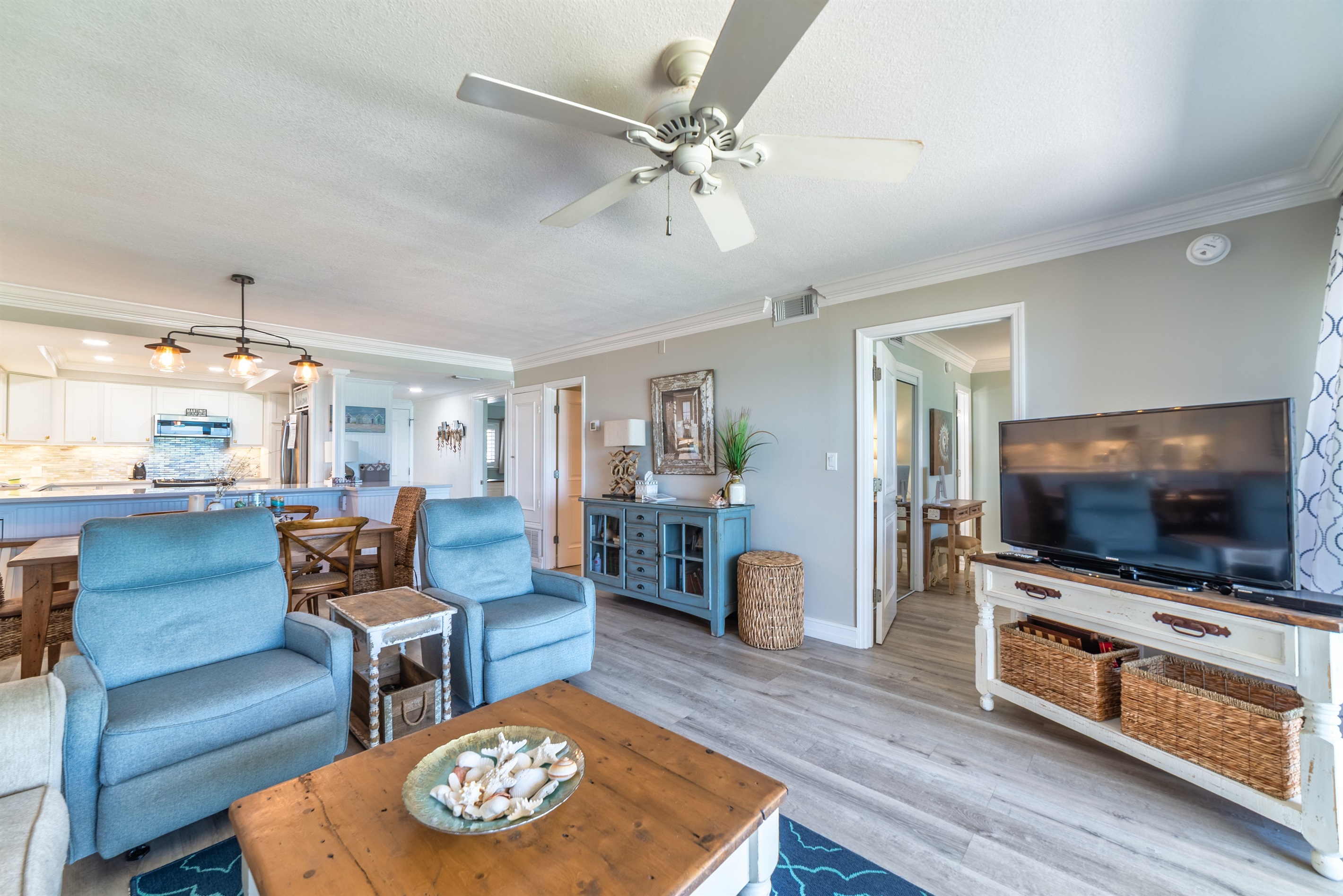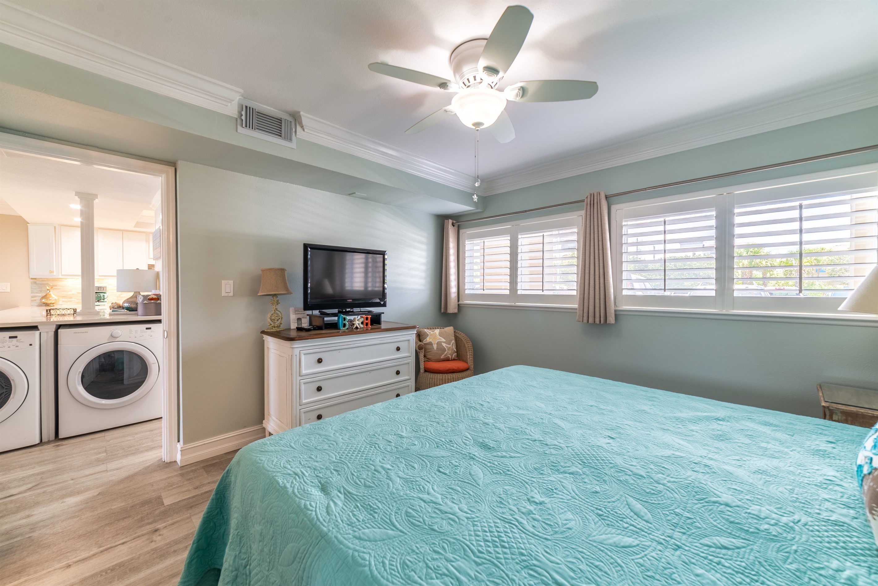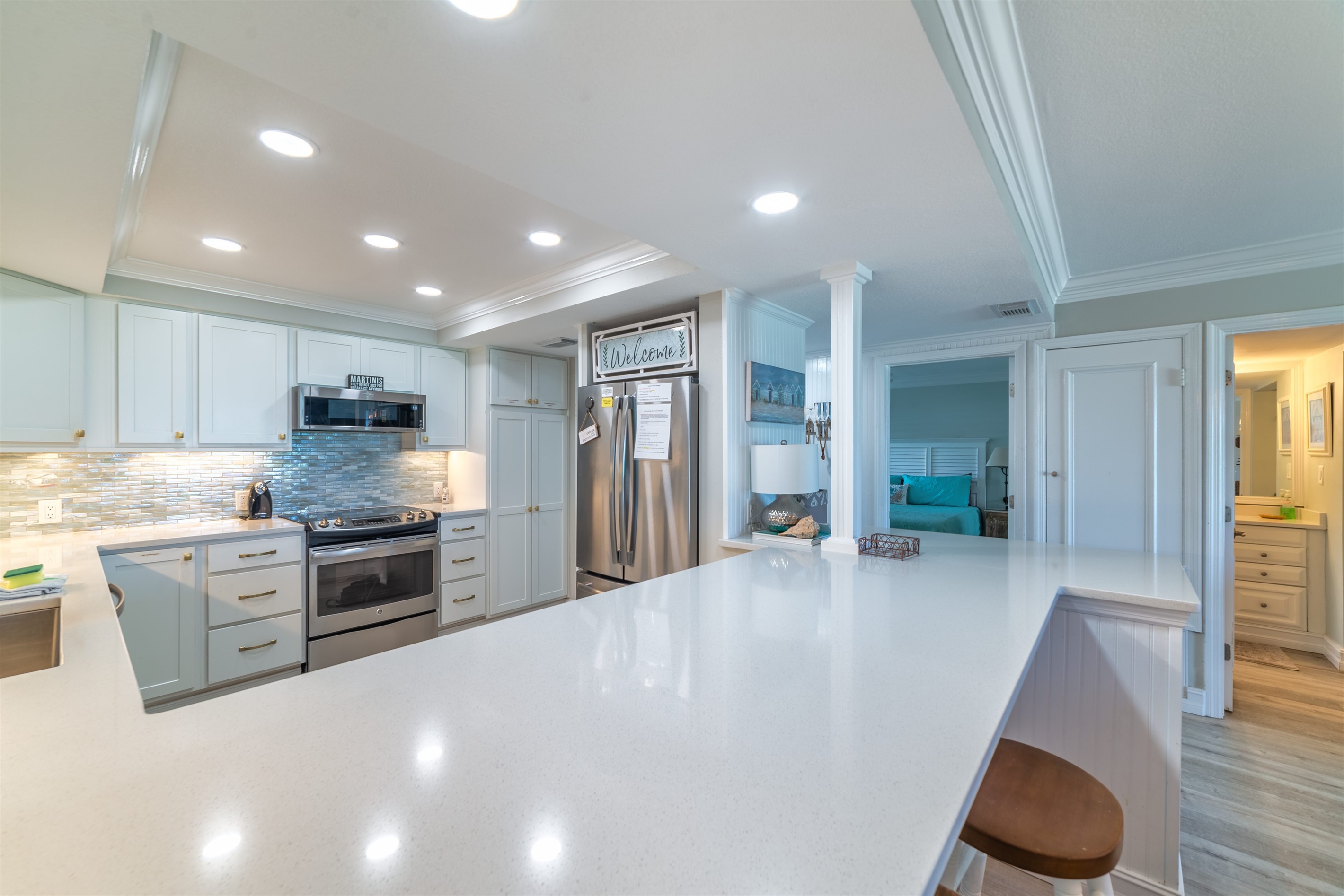The kitchen is fully equipped with all major and small appliances including refrigerator, stove, dishwasher and microwave & more. Cookware, utensils, and table service are all included, with a private washer and dryer located conveniently inside the condo.