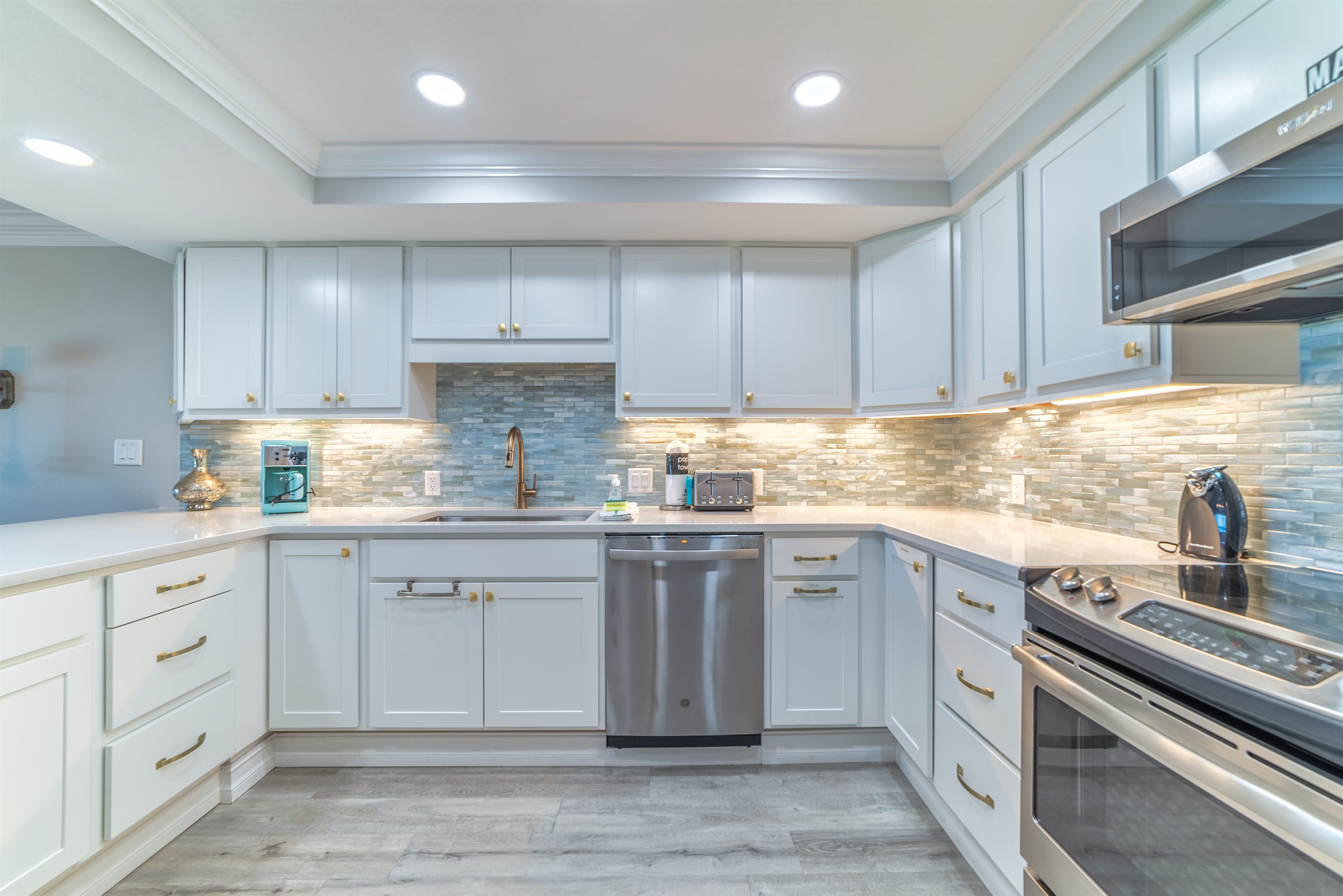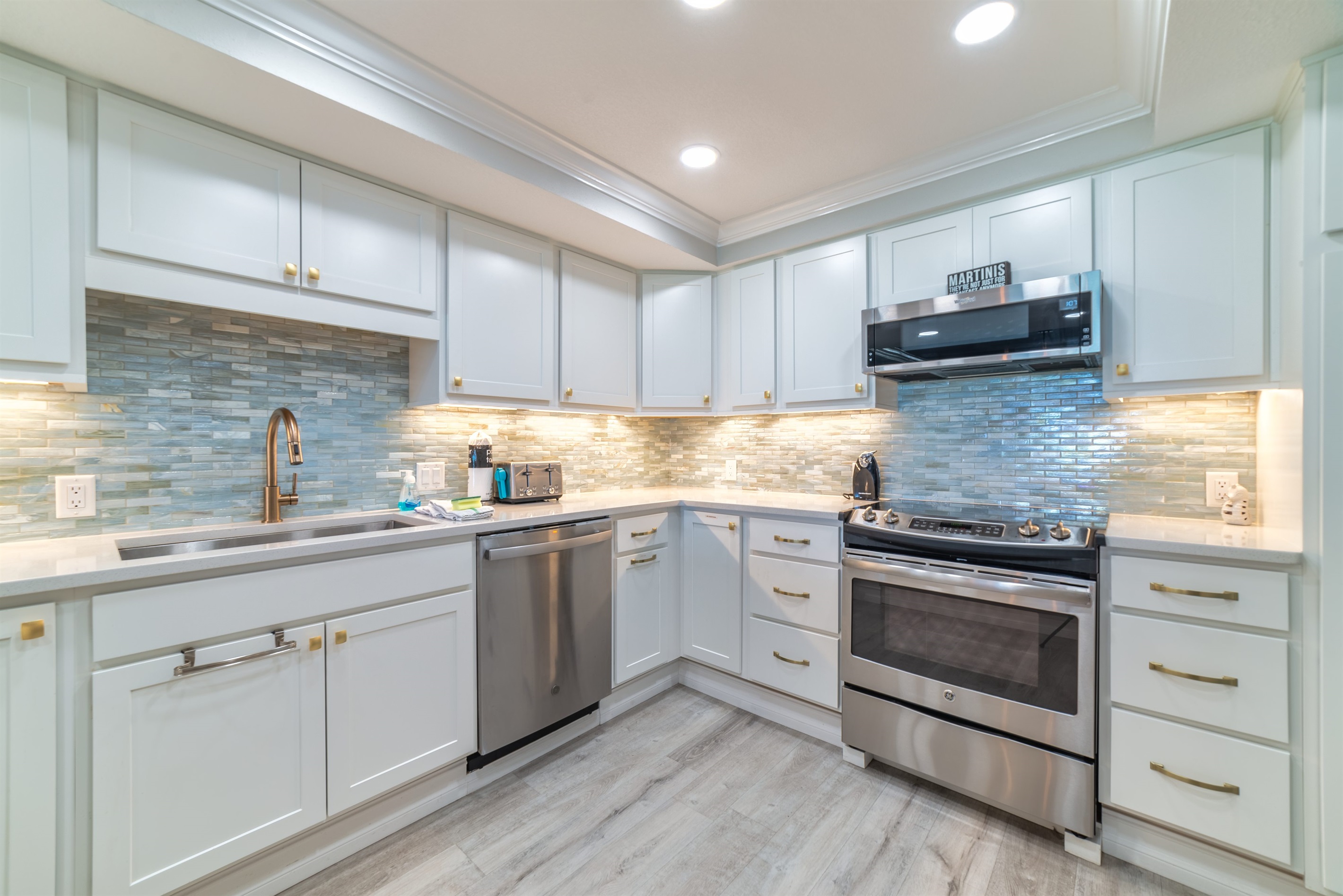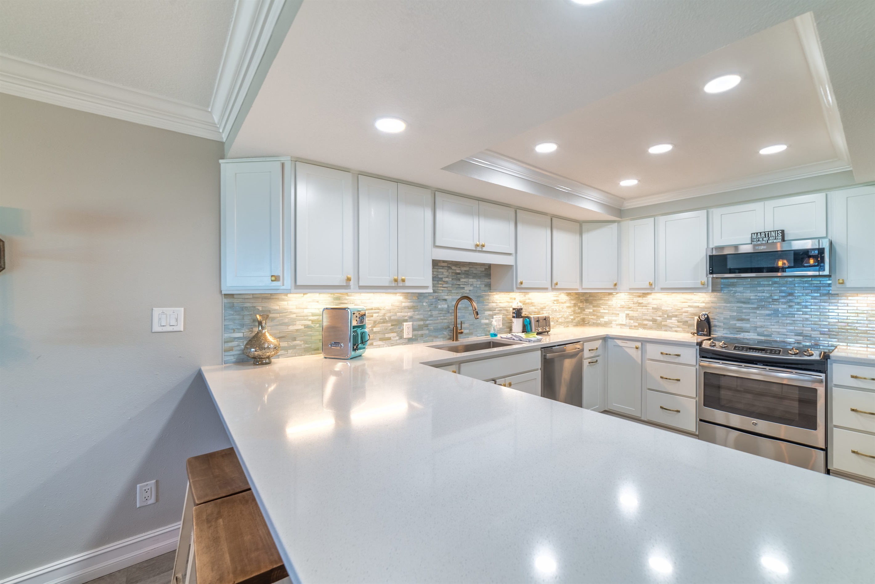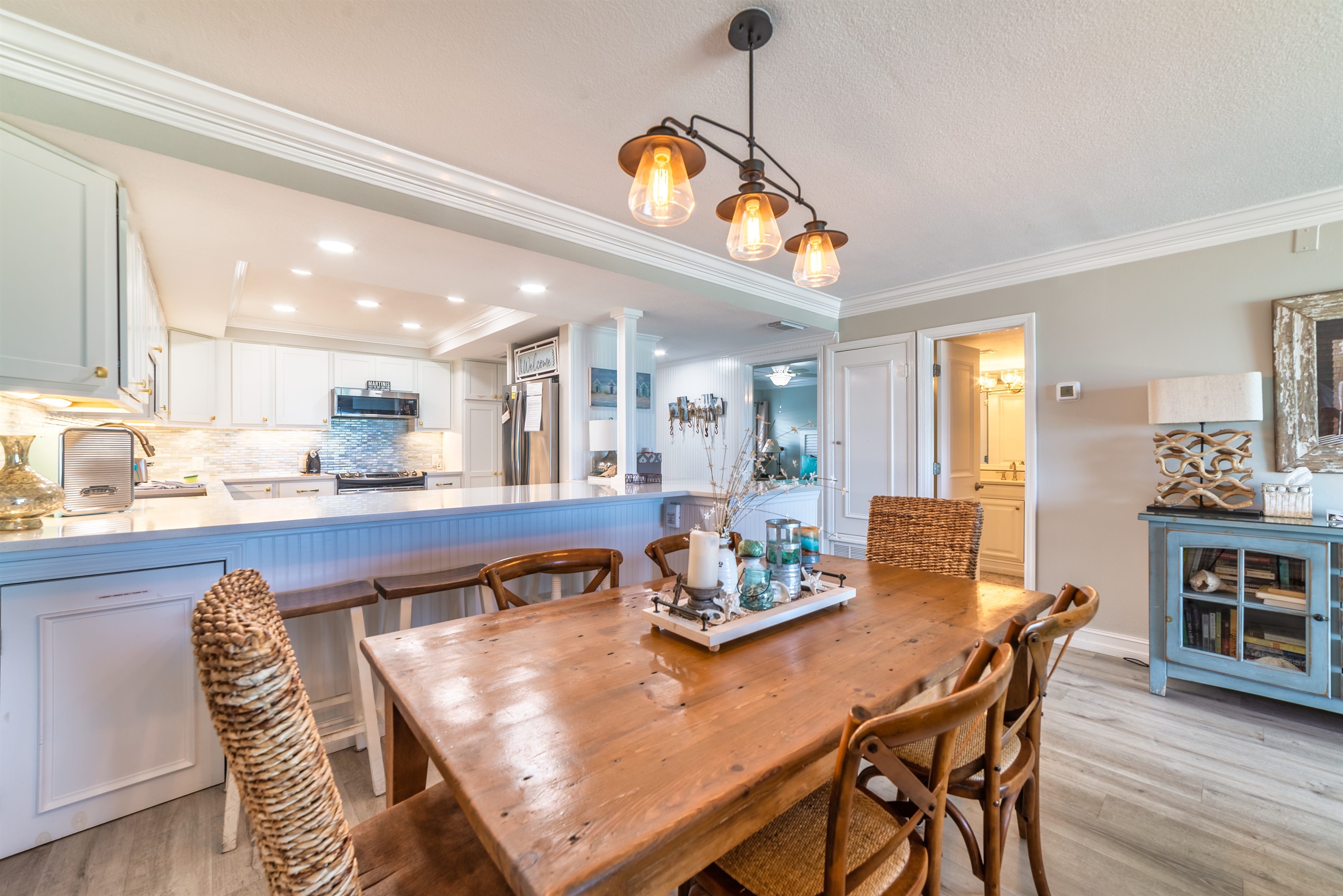 The kitchen is fully equipped with all major and small appliances including refrigerator, stove, dishwasher and microwave & more. Cookware, utensils, and table service are all included, with a private washer and dryer located conveniently inside the condo.