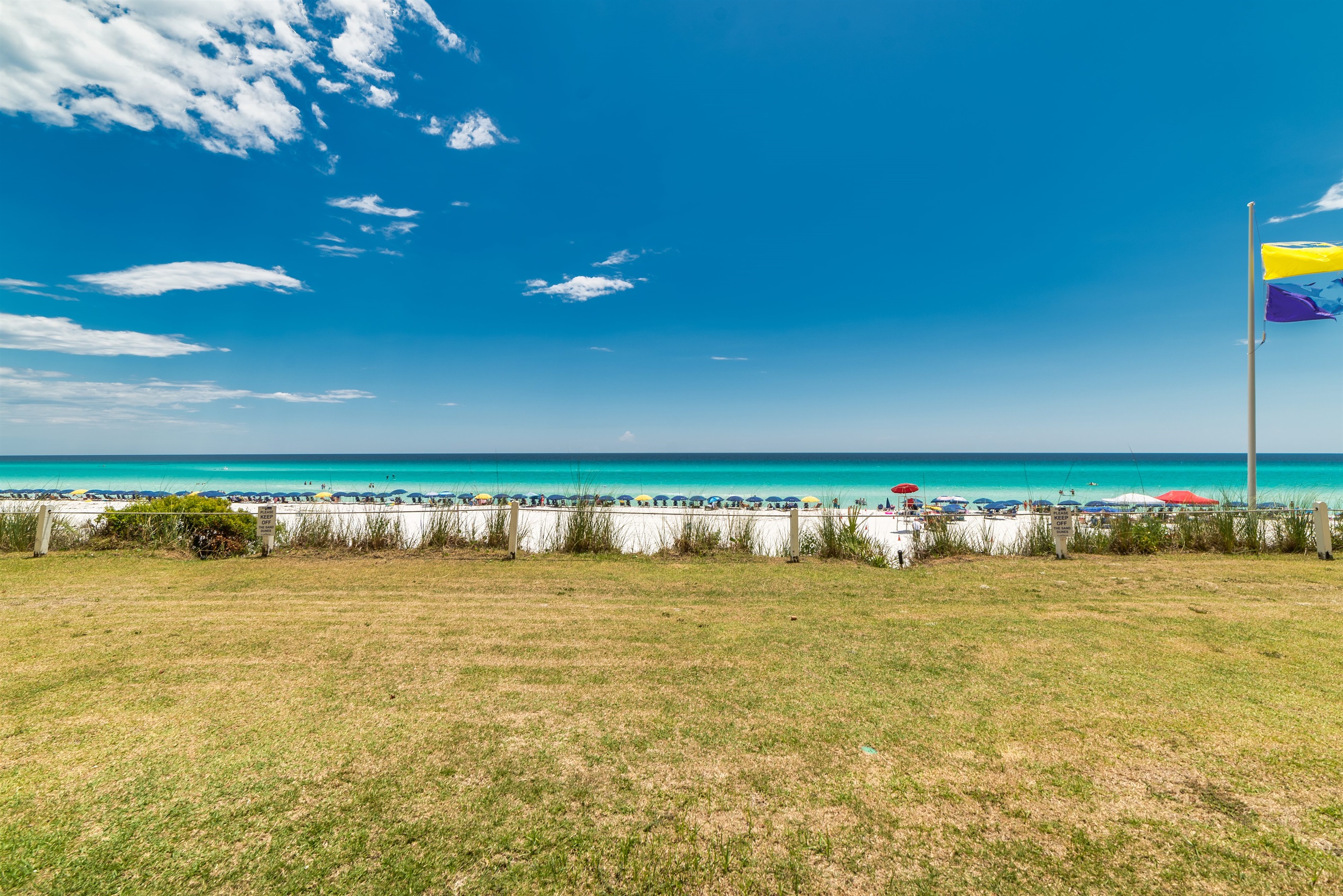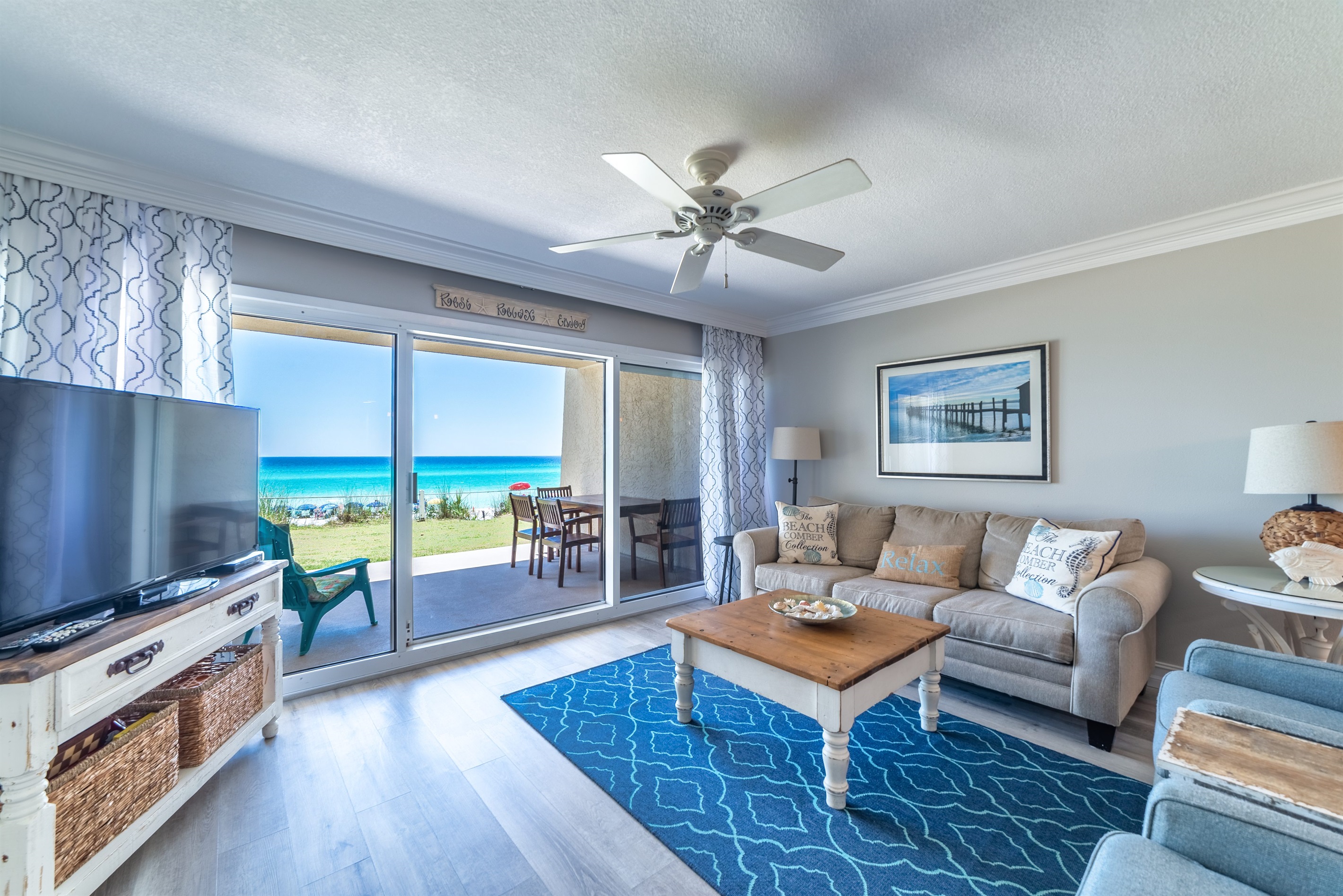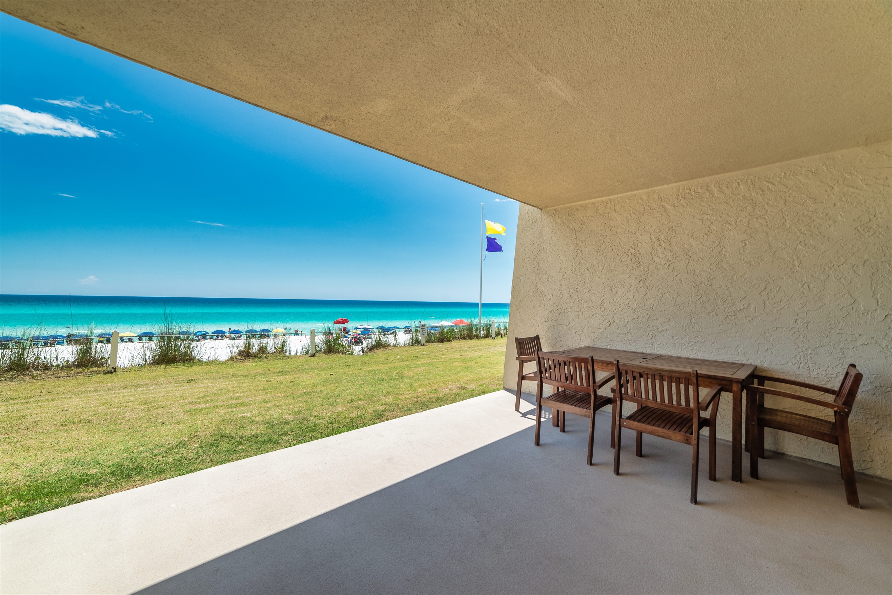 Enter condo D102 at Beach House Condominiums to an open, airy beachy welcome! This property is located directly on the beach with no streets to cross. It is a beautiful two bedroom, two bathroom condo sits on the ground floor and it is located on the west end of the property. Stepping outside onto the covered walk out patio, you are met with a gorgeous view of the Gulf of Mexico and the white sandy beaches of the Emerald Coast! You can hear the waves crashing and almost feel the surf splash right from the walk out patio!