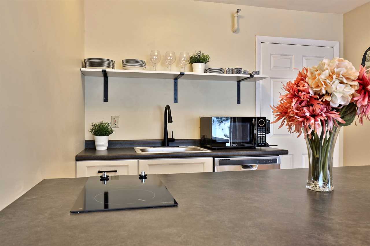 Room 5 is our only two-floor loft suite that also features a kitchenette with peninsula, two-burner electric cooktop, mini fridge, microwave, sink, dishwasher, dinnerware, glassware, cups, cookware, and utensils. This unit features a sliding door out to a private patio (summer only) as well.