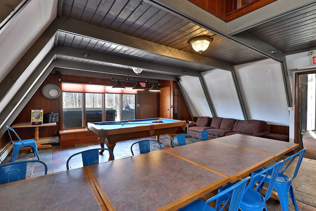 The dining room in the second A-frame structure features tables and chairs with seating for 20, plus a pool table, 75' smart TV and sofa. Head out the door to the front patio, and you'll find one of the two hot tubs along with a gas barbecue grill. The full commercial kitchen at the back of the dining room is available to guests. Due to the commercial setup of the kitchen we request that guests confirm use of that area with us before booking and sign a waiver for its use.