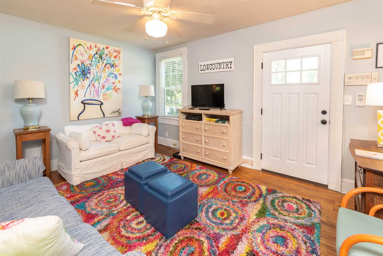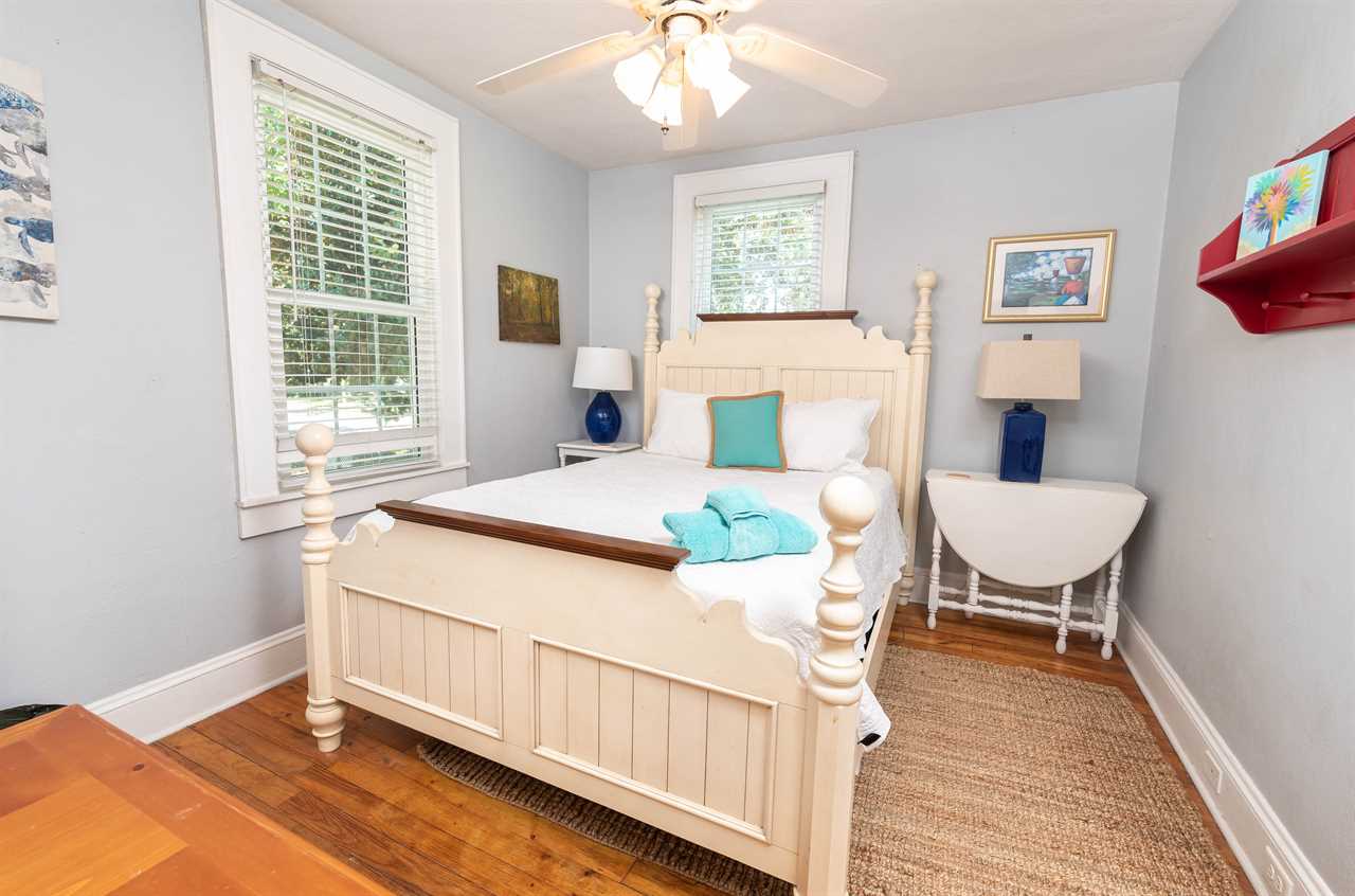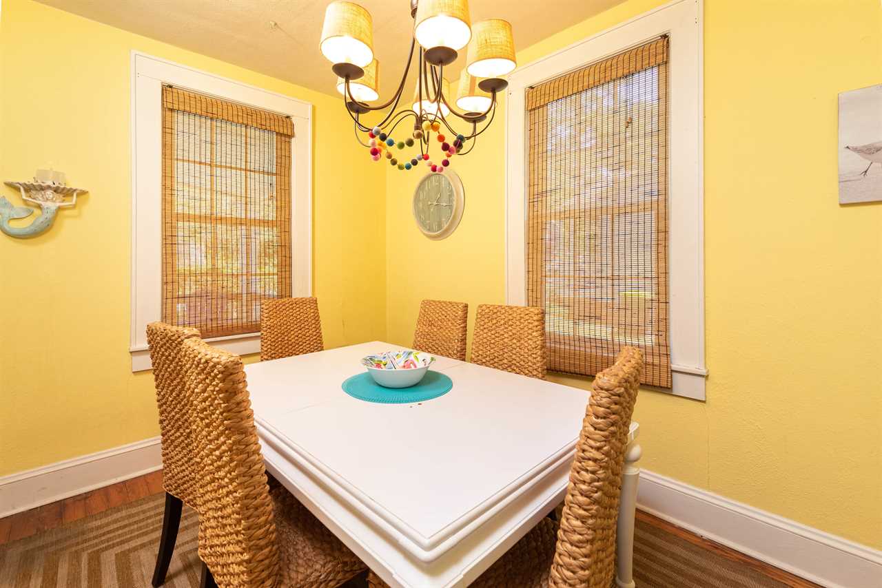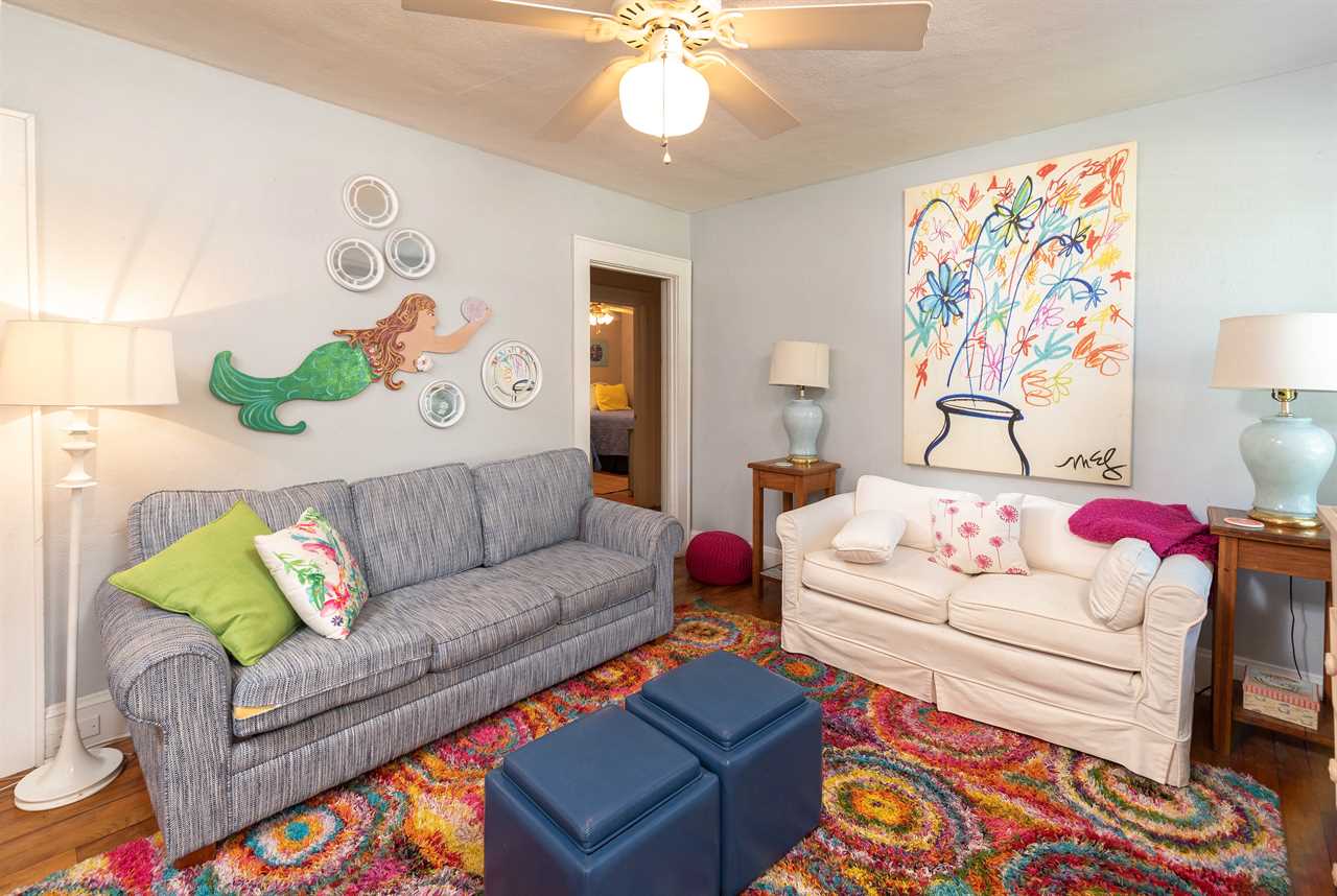 The bright and eclectic beachy furnishings will lighten your spirits and put a smile on your face as you sip coffee from the front porch swing or enjoy a drink on the private back porch.
