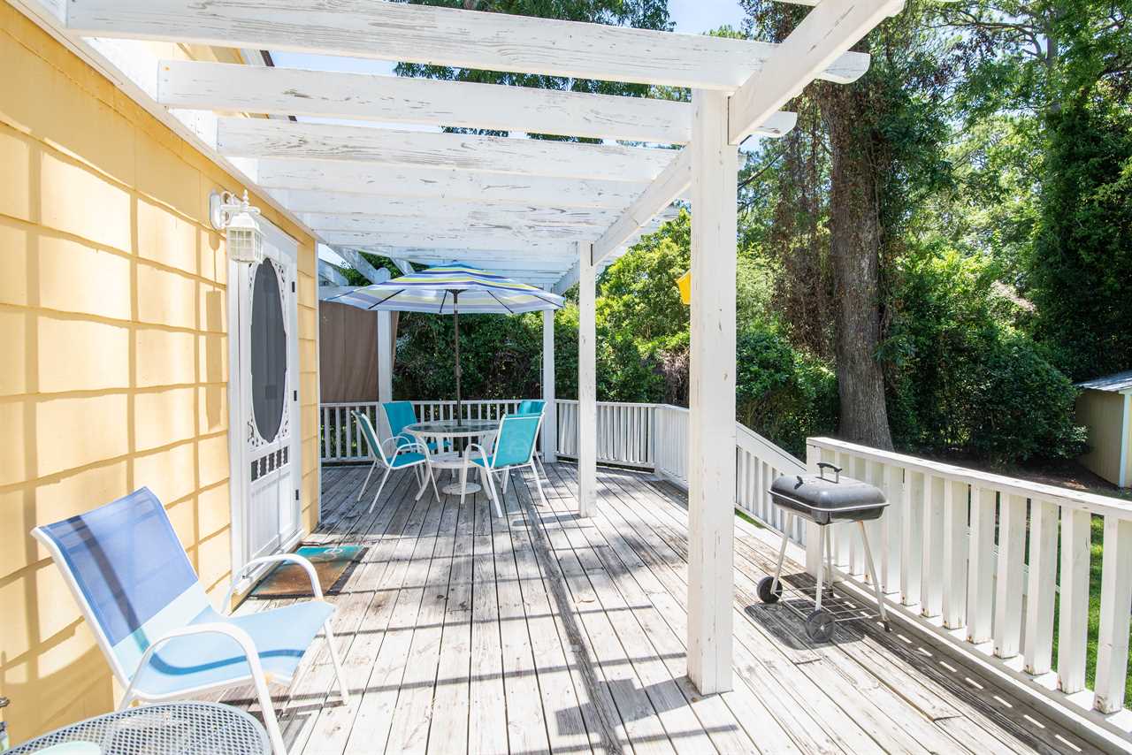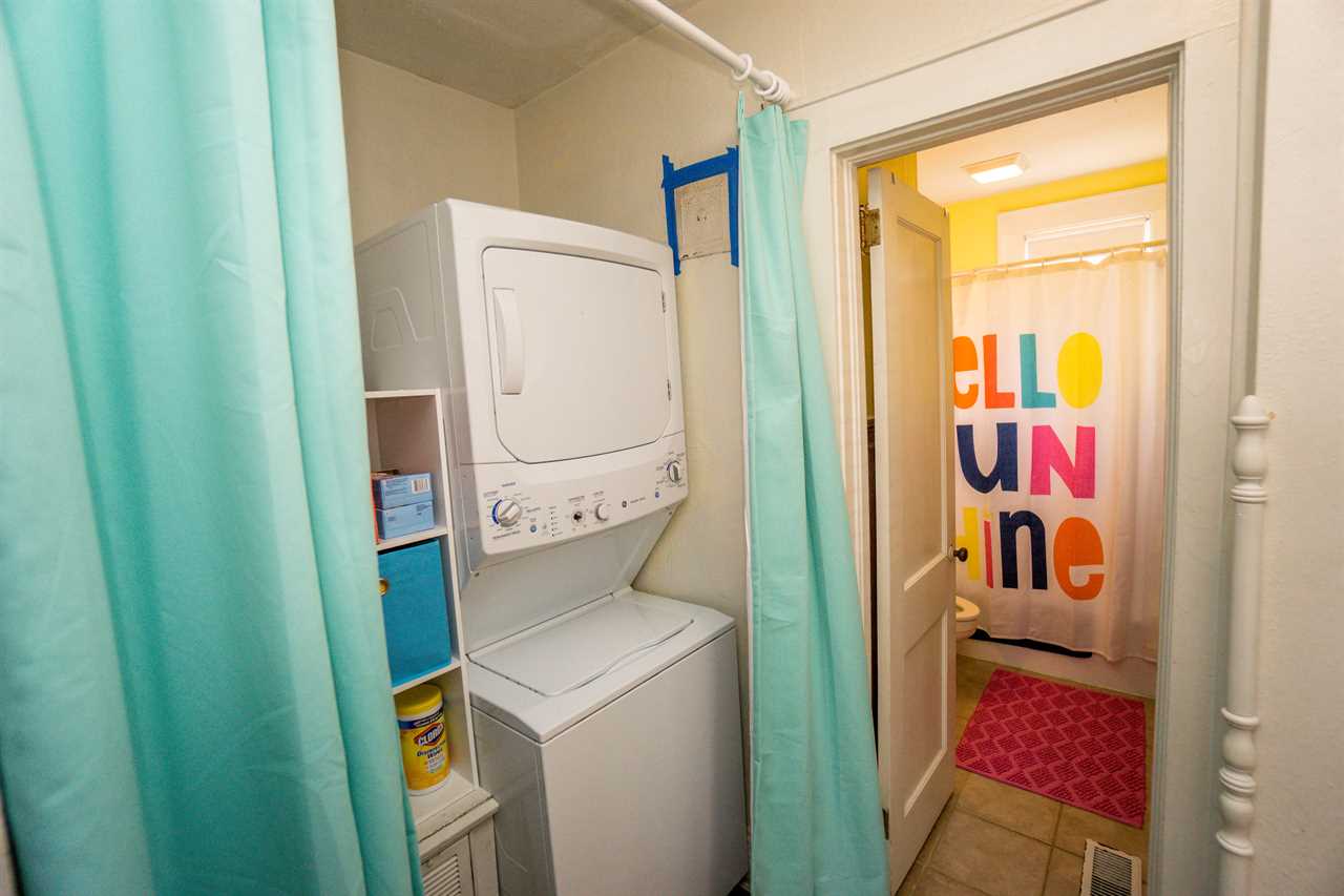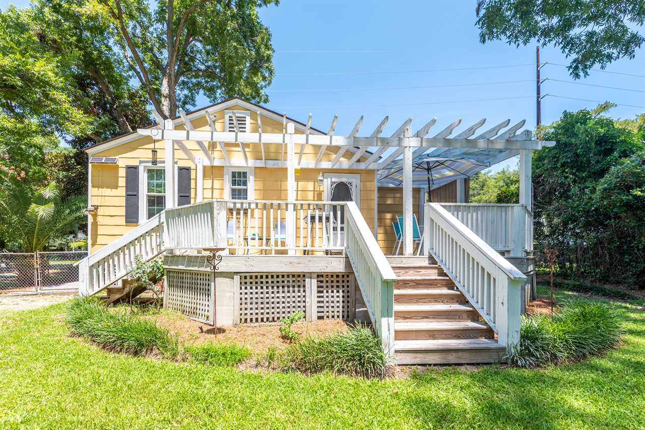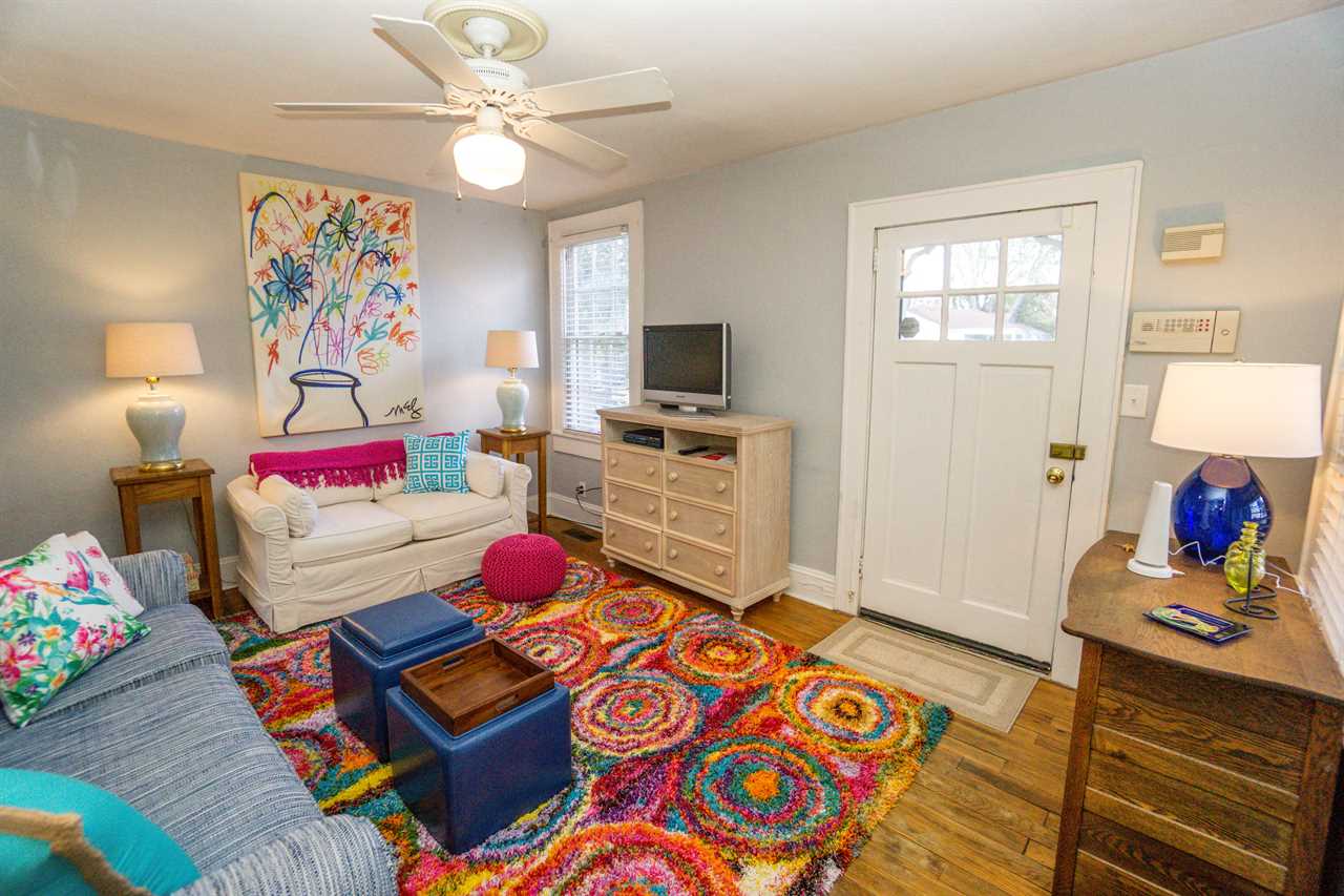 The bright and eclectic beachy furnishings will lighten your spirits and put a smile on your face as you sip coffee from the front porch swing or enjoy a drink on the private back porch.