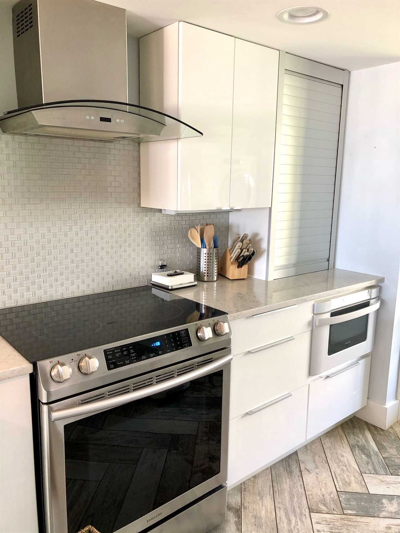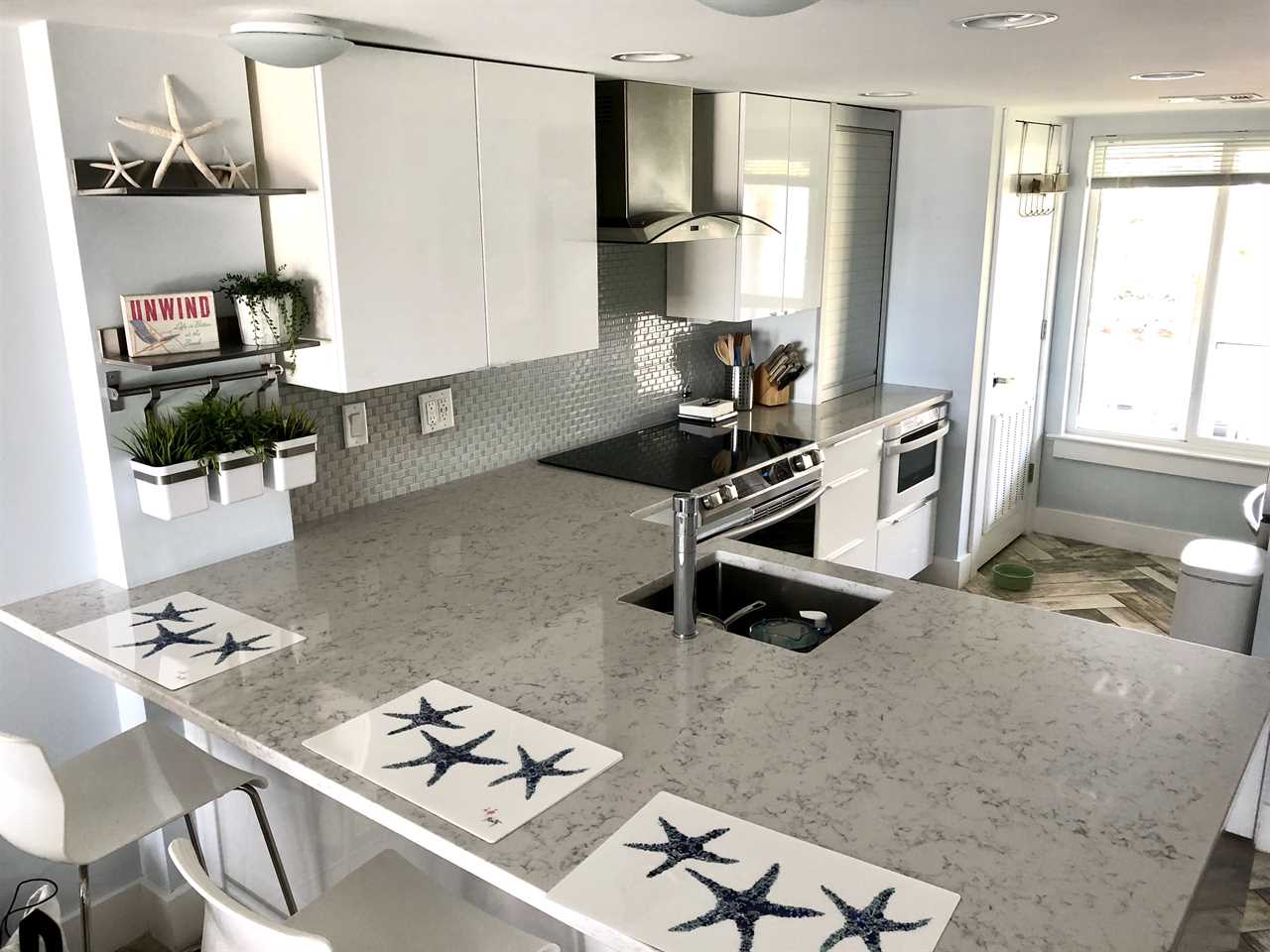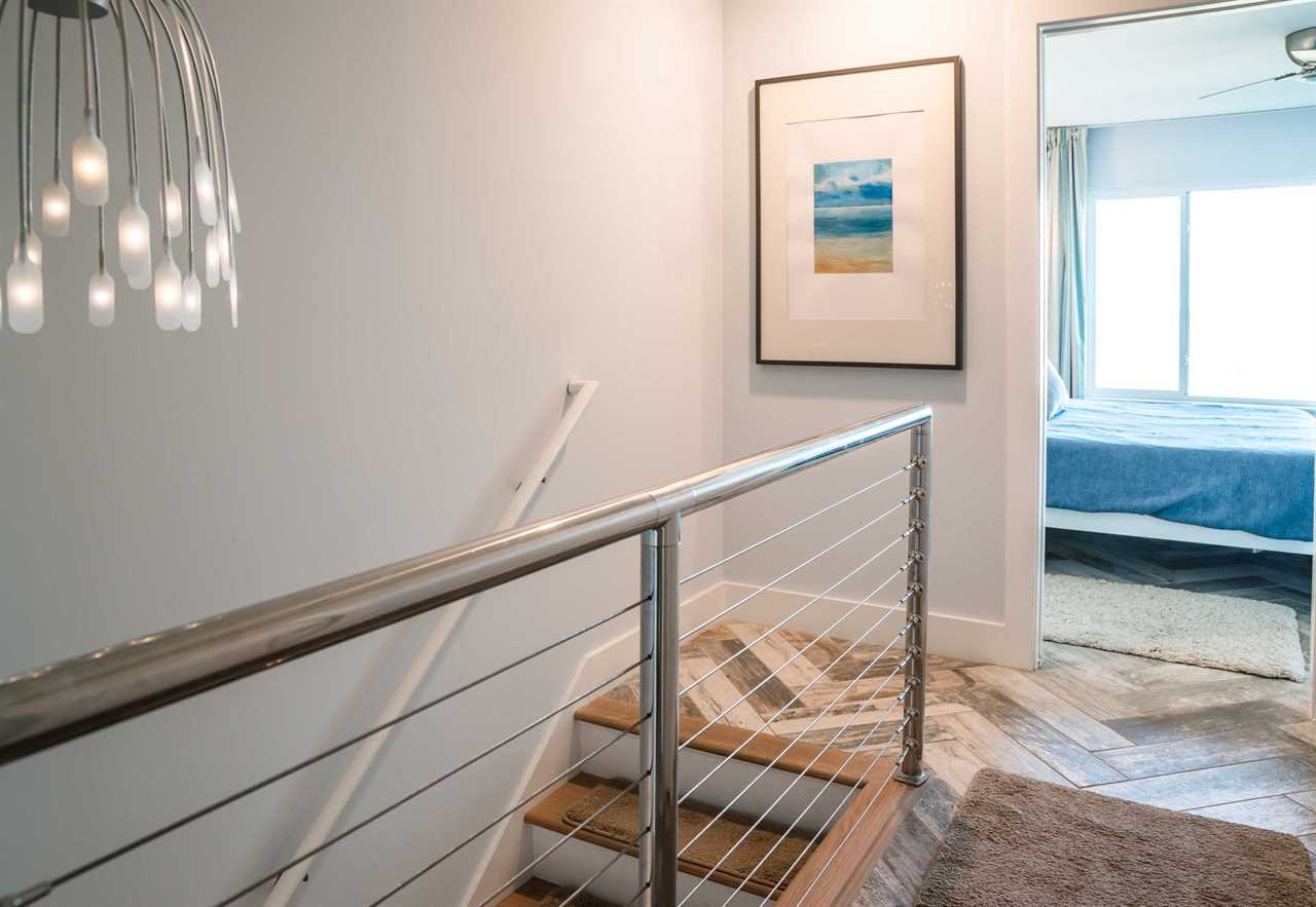 You are welcomed by an open floor plan and a stunning, unobstructed ocean view throughout the main living area. A sleek, stylish kitchen boasts gorgeous, waterfall quartz countertops and is fully equipped with everything you need to cook a gourmet meal. The dining area has both a 3 seat breakfast bar and table that comfortably seats 4 people. The living room has a flat screen TV and plenty of games to entertain family or friends and you can take in the sweeping views from the private deck morning, noon or night. There is a powder room on the first floor, a NEW(2025) stacking washer/dryer for your convenience and plank tile floors throughout.