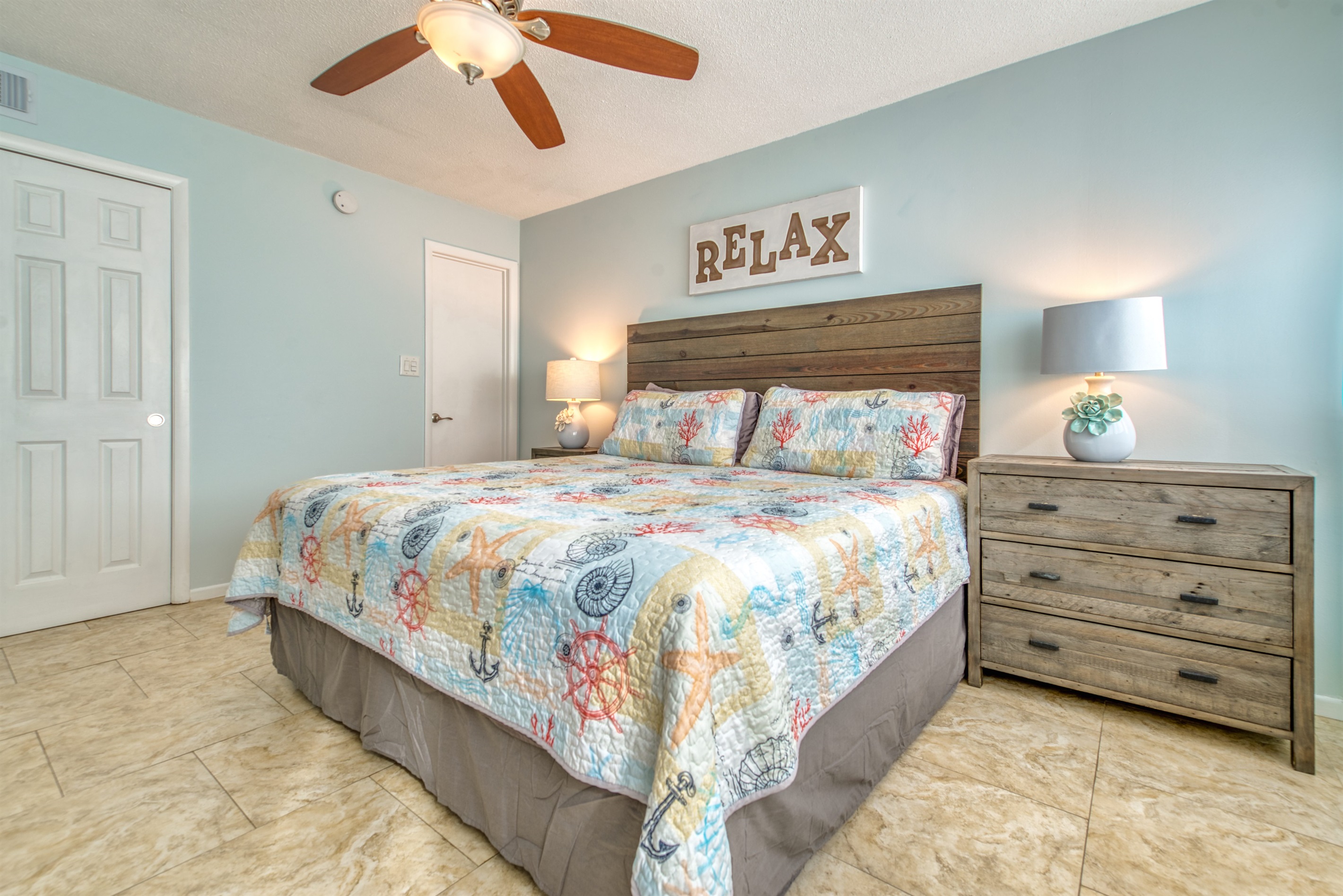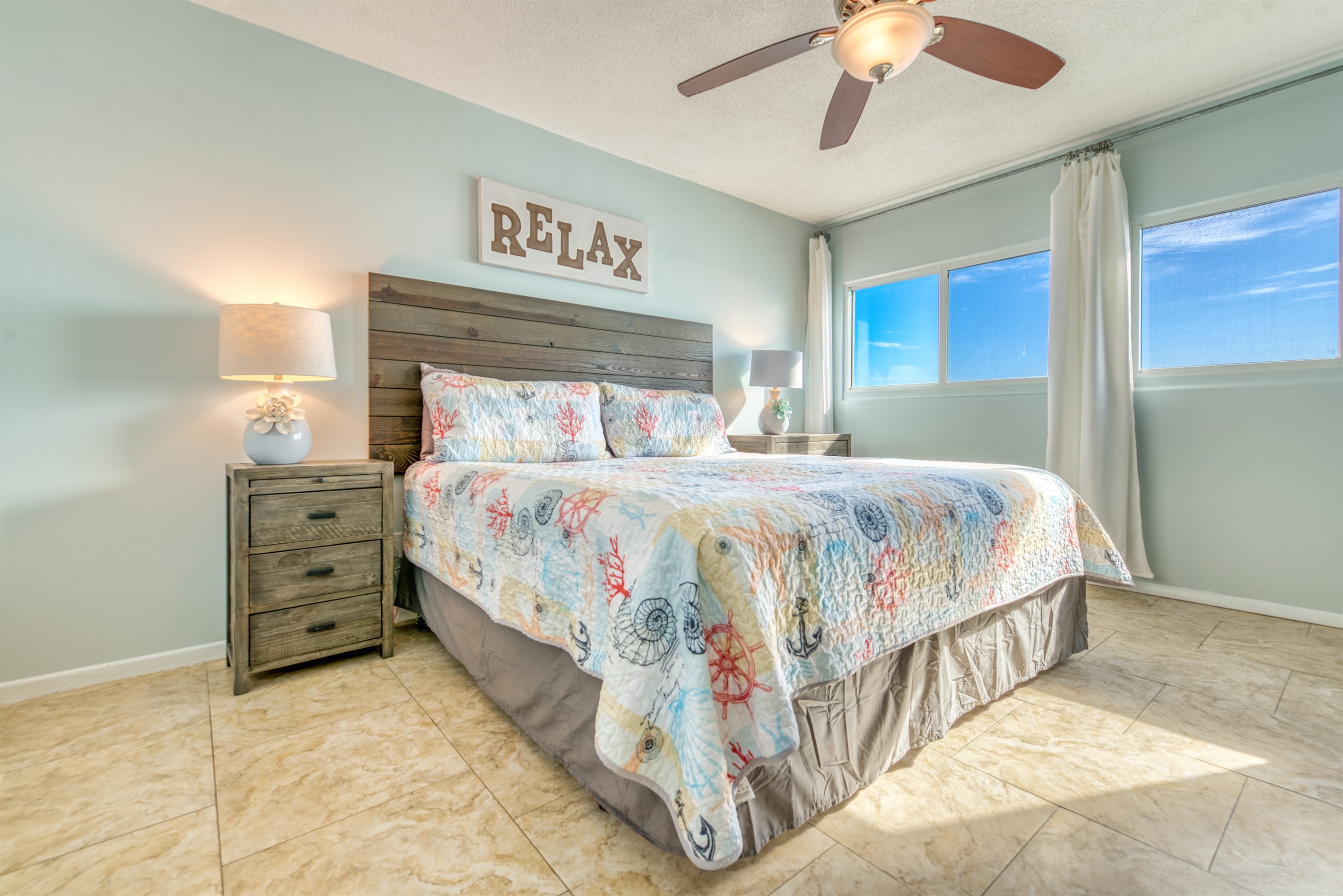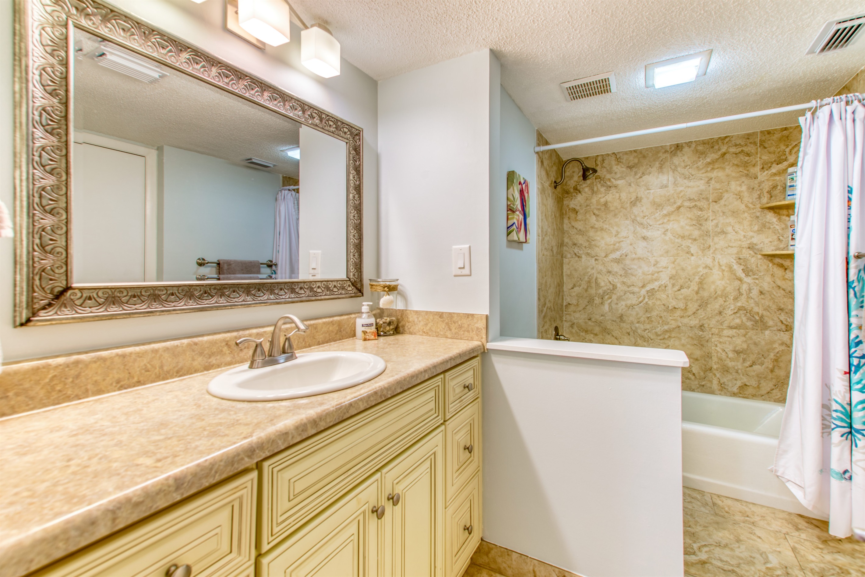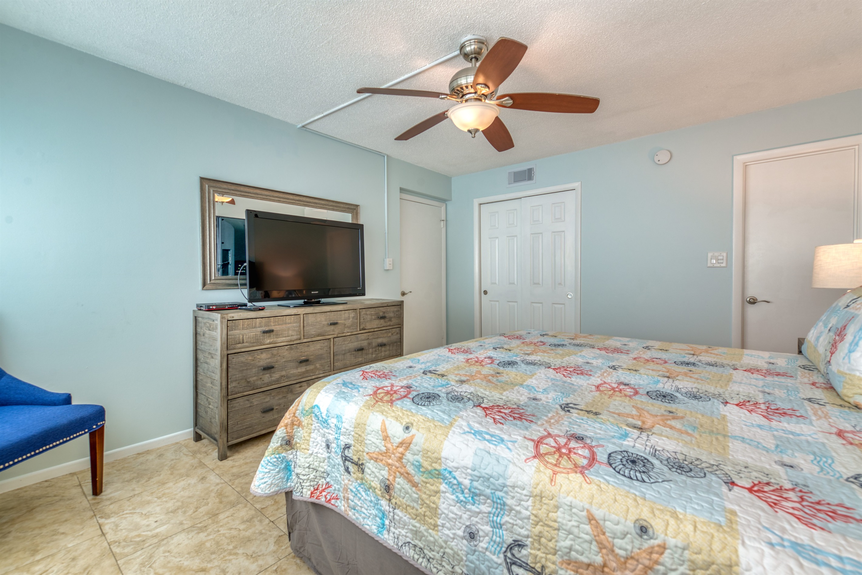 This condo can conveniently accommodate a party of 7. The master bedroom has a king-sized bed that comfortably sleeps 2, as well as a private, full bathroom attached to it. The guest bedroom has 1 queen size bed and 1 twin bed along with an attached full bathroom that is also accessible from the living room area. The living room is equipped with plenty of comfortable seating for lounging and relaxing throughout the day during your breaks from the beach, as well as a pull-out sleeper sofa bed that can comfortably sleep 2. The total sleeping accommodations for this condo are 7 guests.