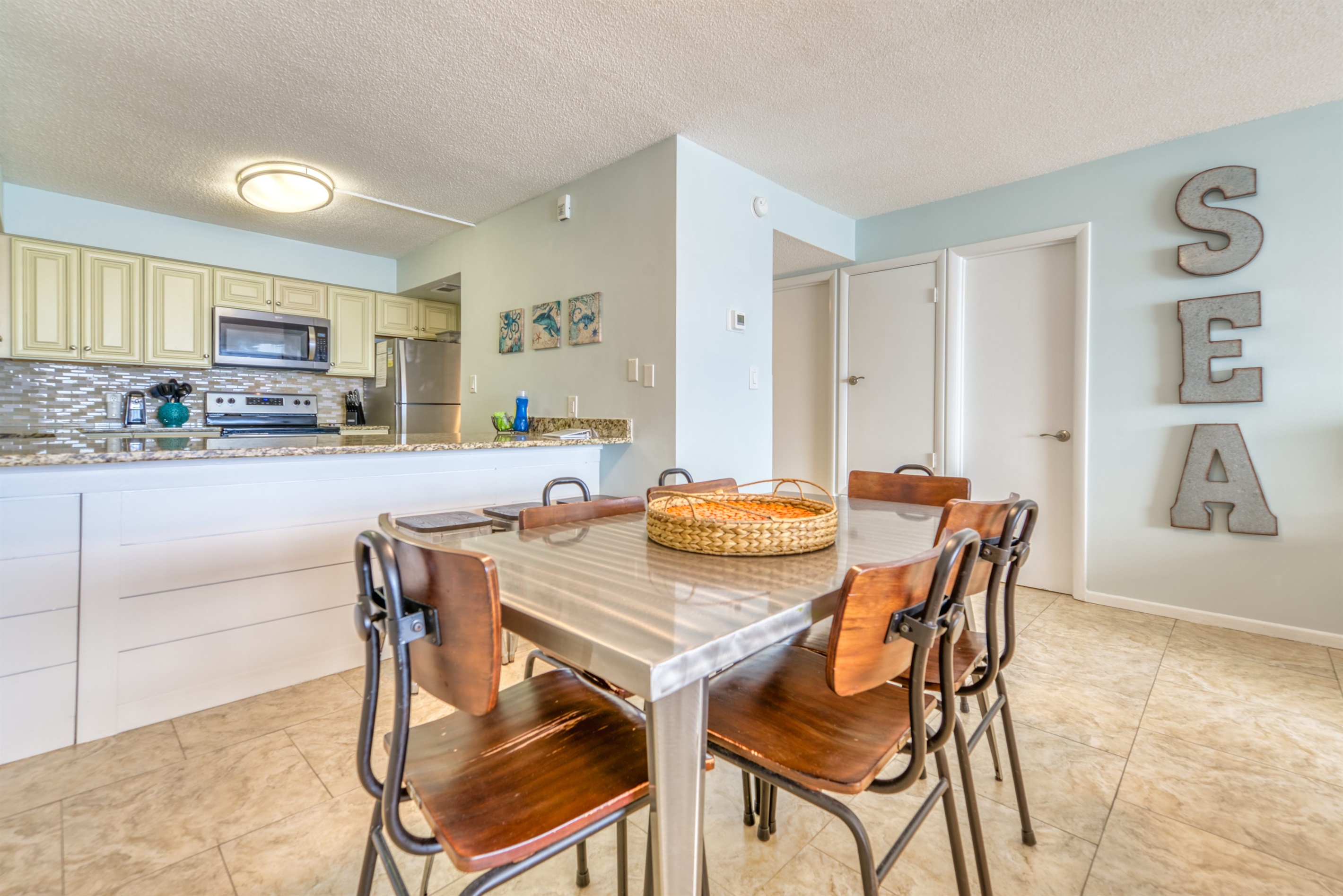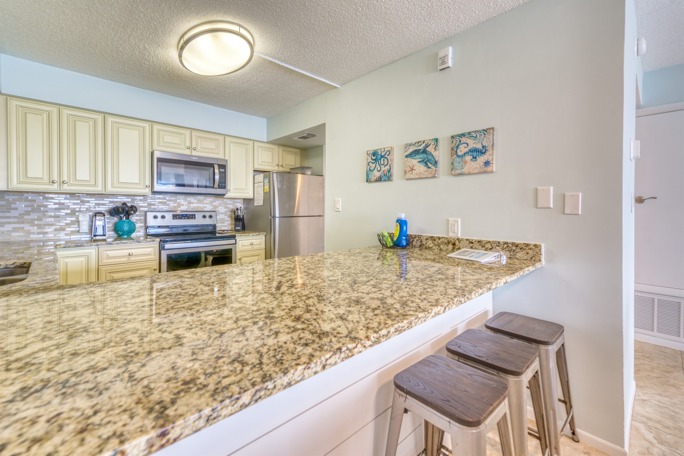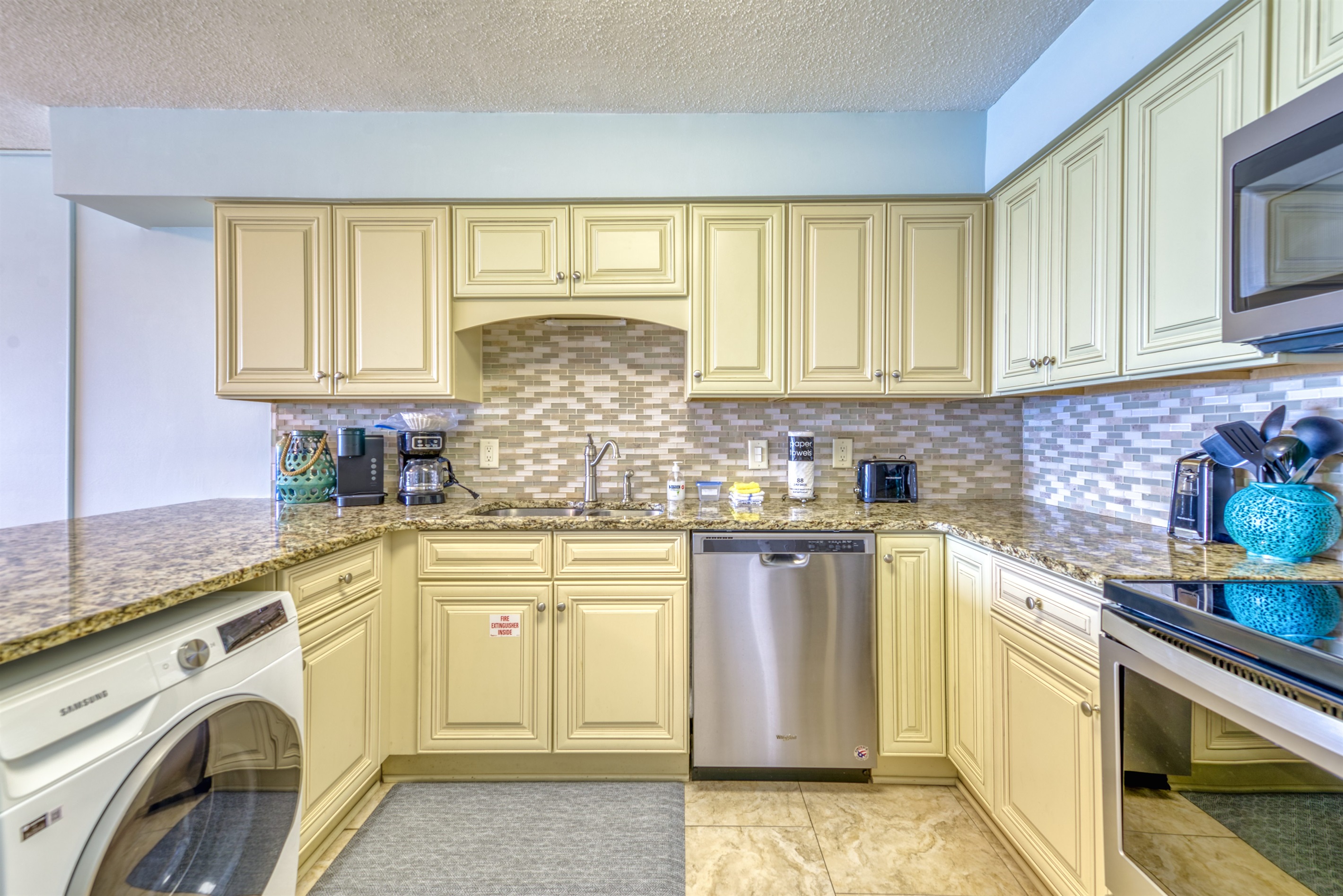 The kitchen is fully equipped with all major and small appliances including a refrigerator, stove, dishwasher, and microwave & more. Cookware, utensils, and table service are all included, with a private washer and dryer located conveniently inside the condo.