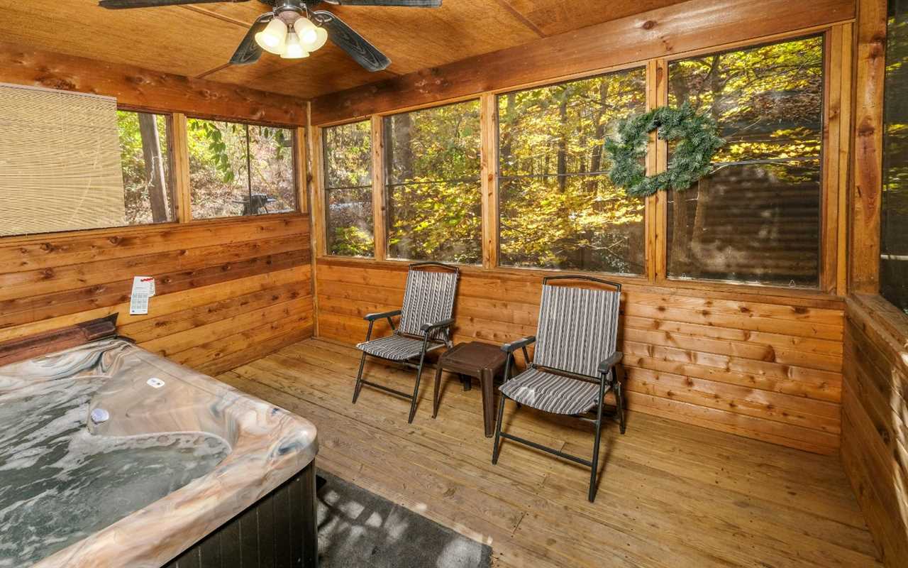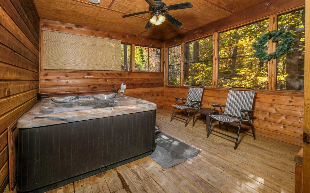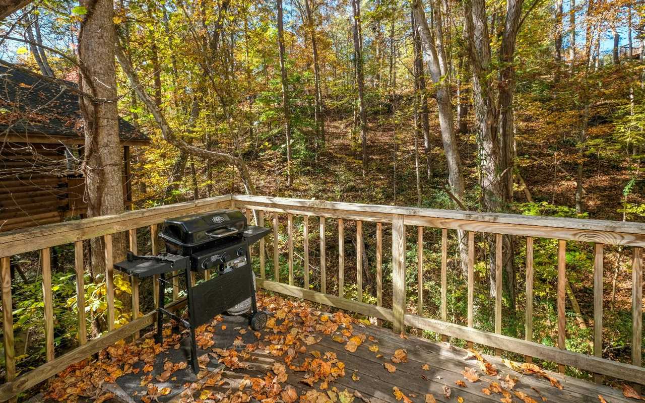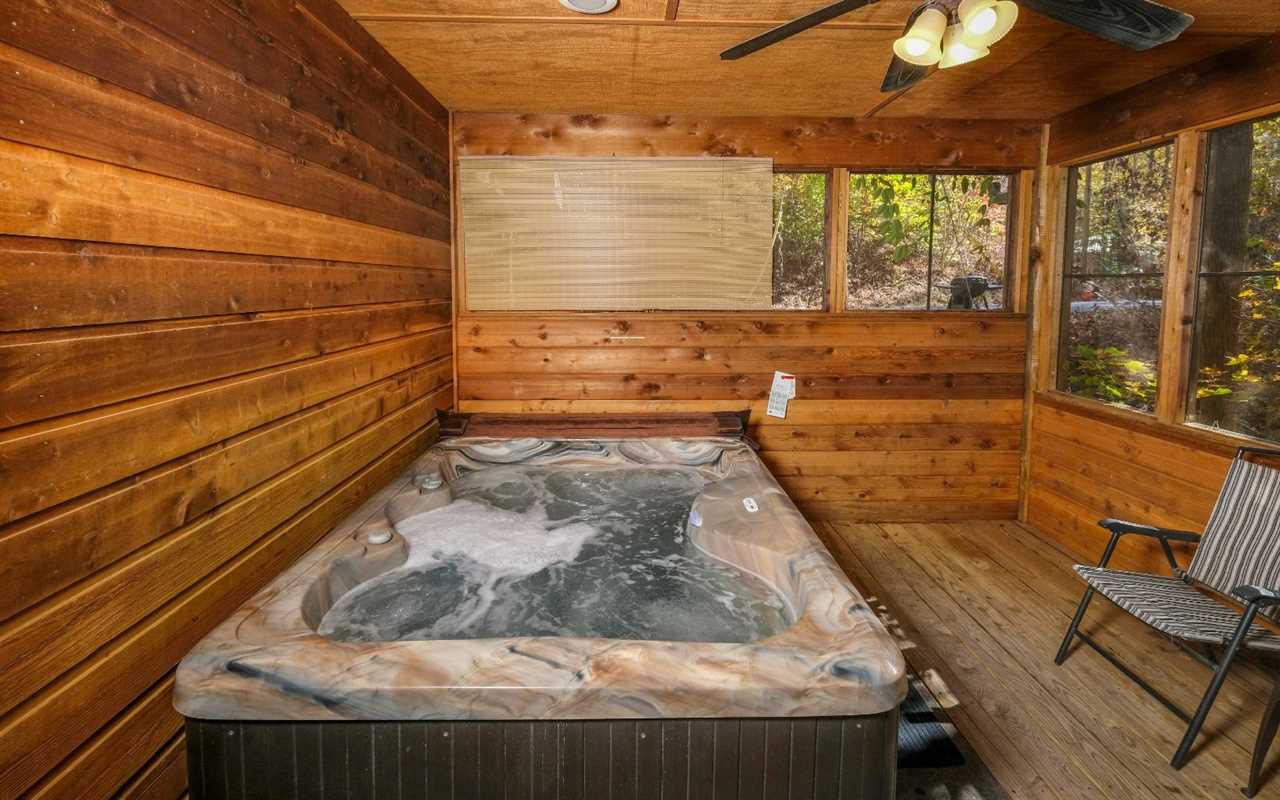 Dine together at the wooden table next to a large window framing the wooded views and clear the space for board games from home between meals. At night, draw yourself a hot bubble bath in the indoor jetted tub in your suite that features its own TV, log furnishings, and a king-size bed. In the morning, slip into the steamy hot tub on the screened deck for a soothing soak. You can fire up the gas grill for breakfast and dine at the outdoor table.