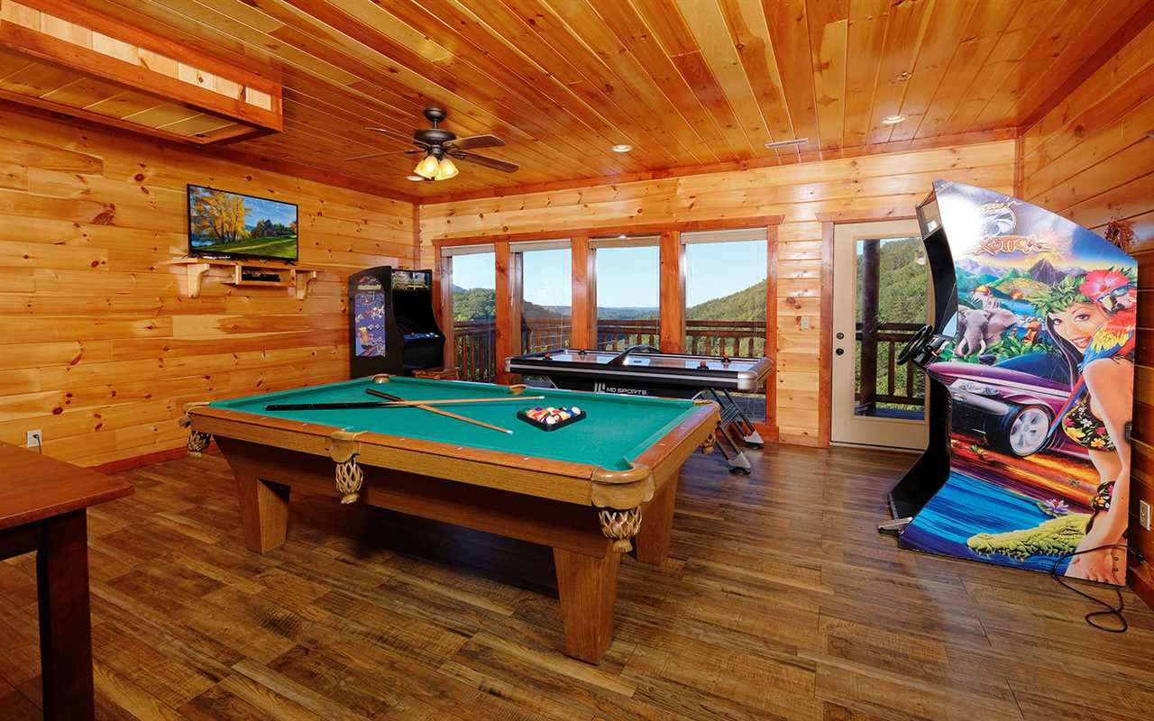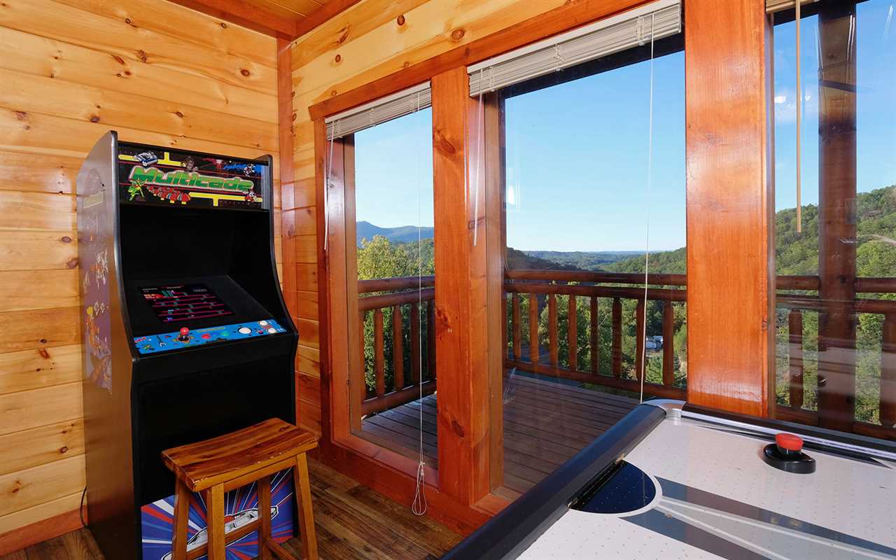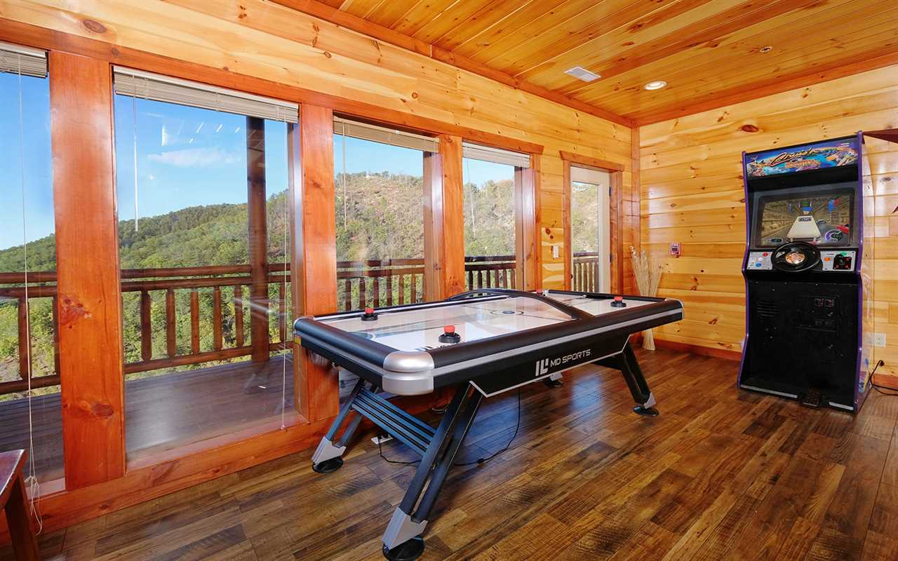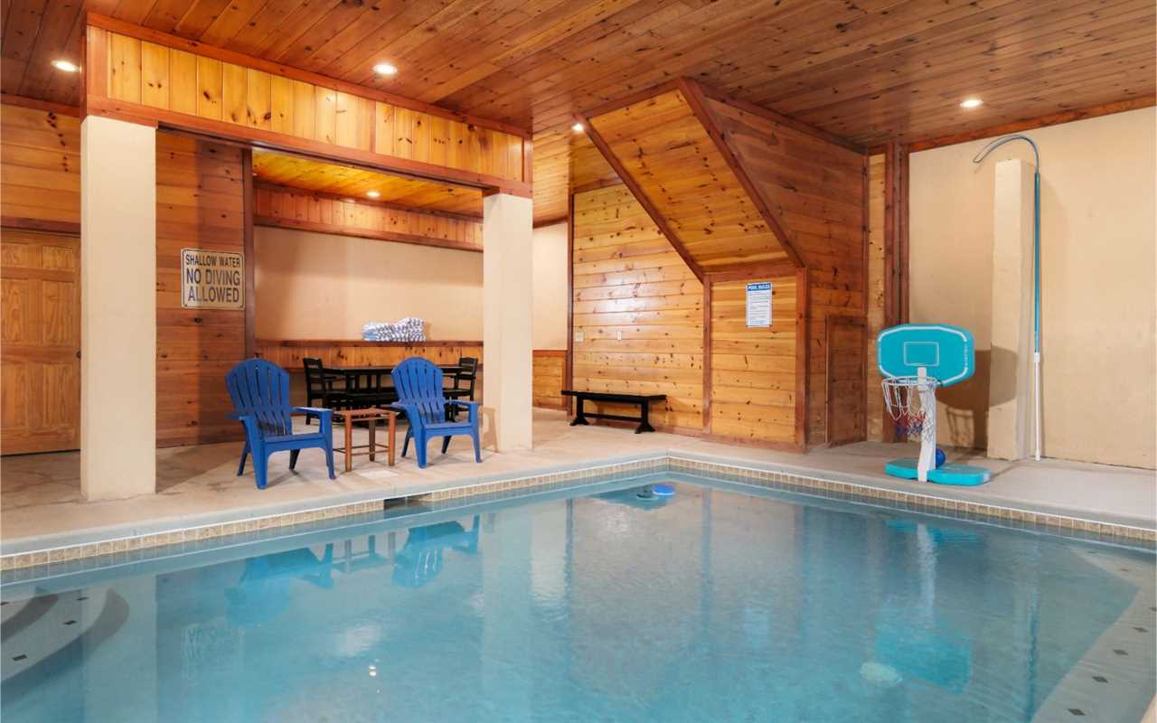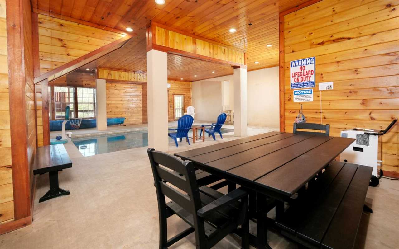 Stay entertained with a Blu-ray player in the theater room with tiered seating, a fun game room with air hockey, a pool table, and awesome arcade games, plus a private indoor pool — with poolside seating and a large table for meals, card games, or a place to chat while the kids swim and play! Then unwind in the bubbling outdoor hot tub or spread out across the decks with multiple sitting areas featuring tall chairs, tables for snacks and drinks, and rockers while enjoying peaceful mountain views.
