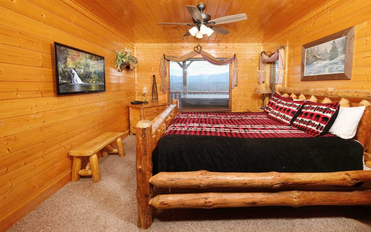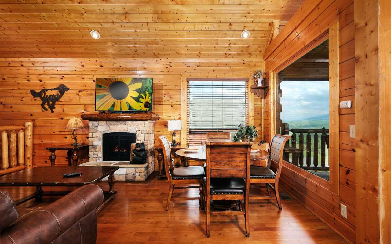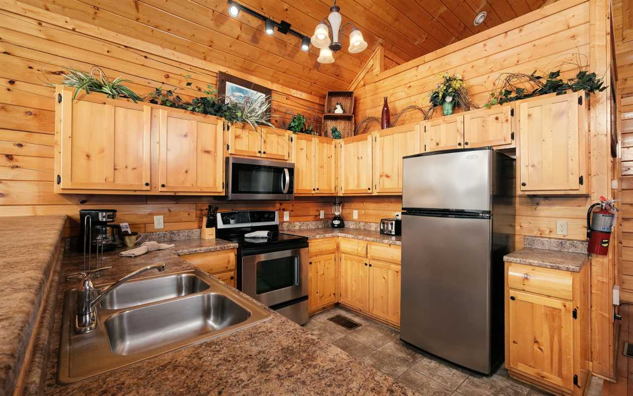With an open concept, the fully equipped kitchen and dining area are just off the living space to keep everyone connected. Whip up meals using stainless steel appliances and provided cooking tools and dishware and enjoy meals together with incredible mountain scenery all around! When you're ready to head to bed, enjoy a spa bath with bubbles or bath salts in the indoor jetted tub first. Then, retreat to your king-size log bed to cuddle, crack open a book, or watch entertainment on the bedroom TV. There's also free Wi-Fi, a washer/dryer, 2 sleeper sofas, and a motorcycle-friendly driveway for added convenience on your Pigeon Forge vacation.
