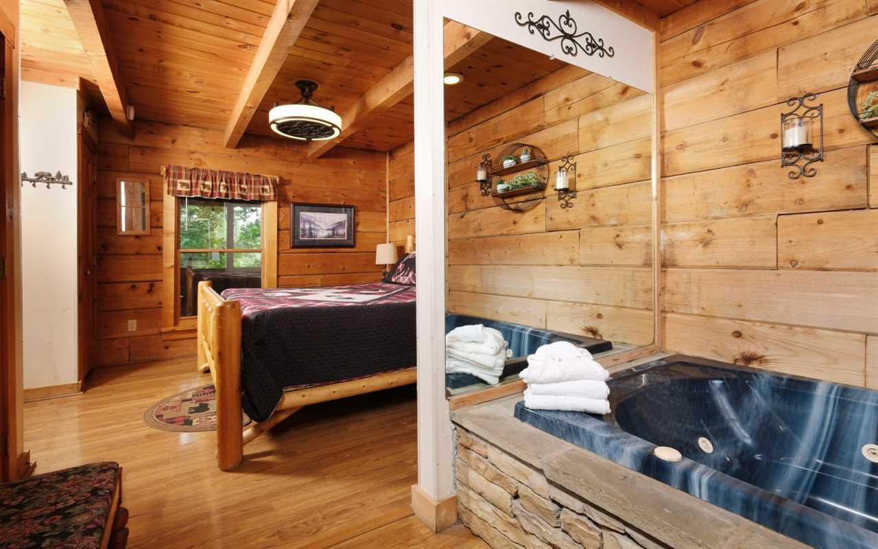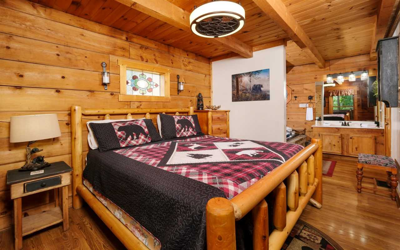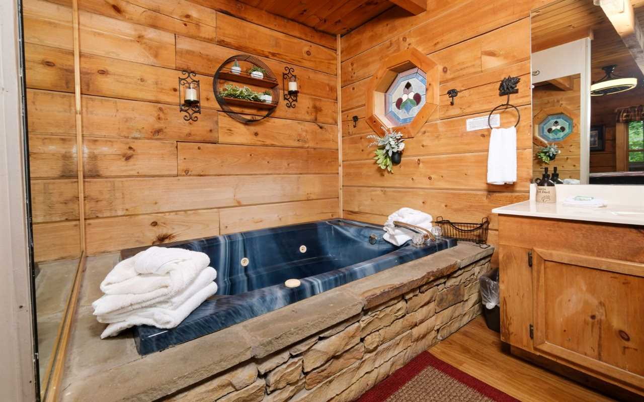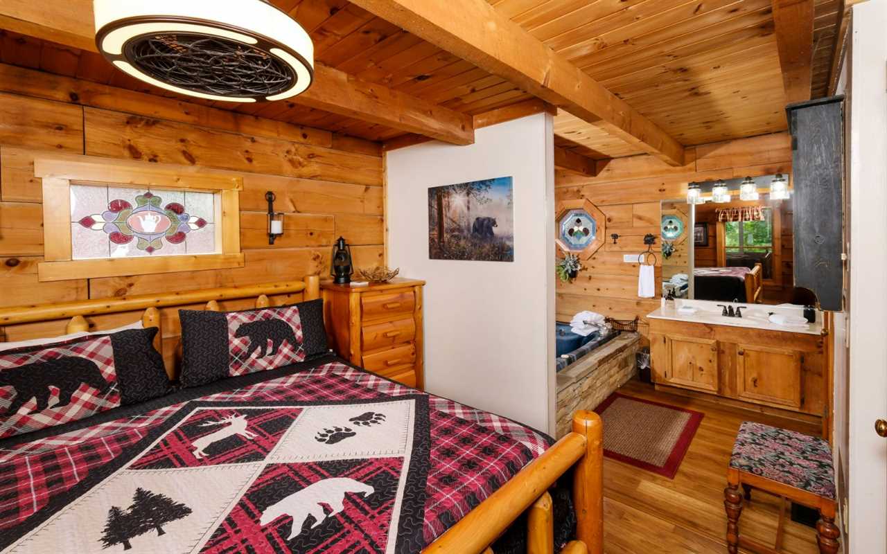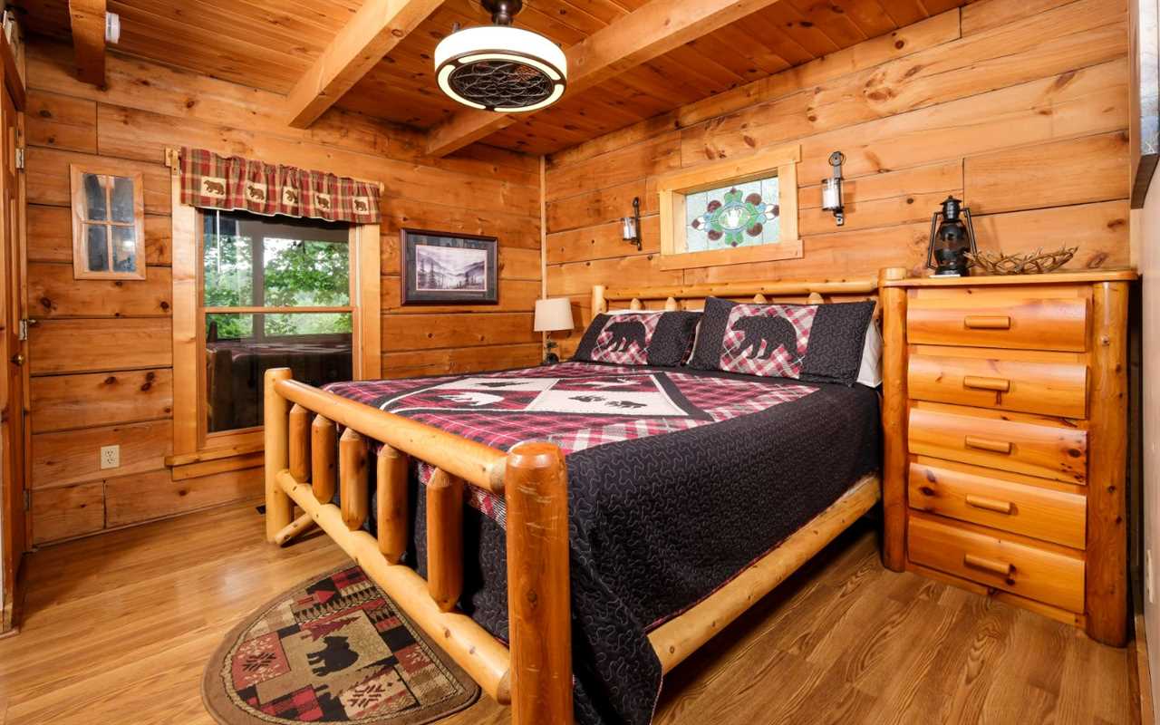 After a day of Smoky Mountain exploration, retreat to restful spaces designed for comfort. The king-size bed in the primary suite offers a cozy place to recharge, while the stained-glass accents and cabin-style furnishings add rustic charm. Guests can also enjoy a soothing soak in the indoor jetted tub or use the sleeper sofa for extra space.