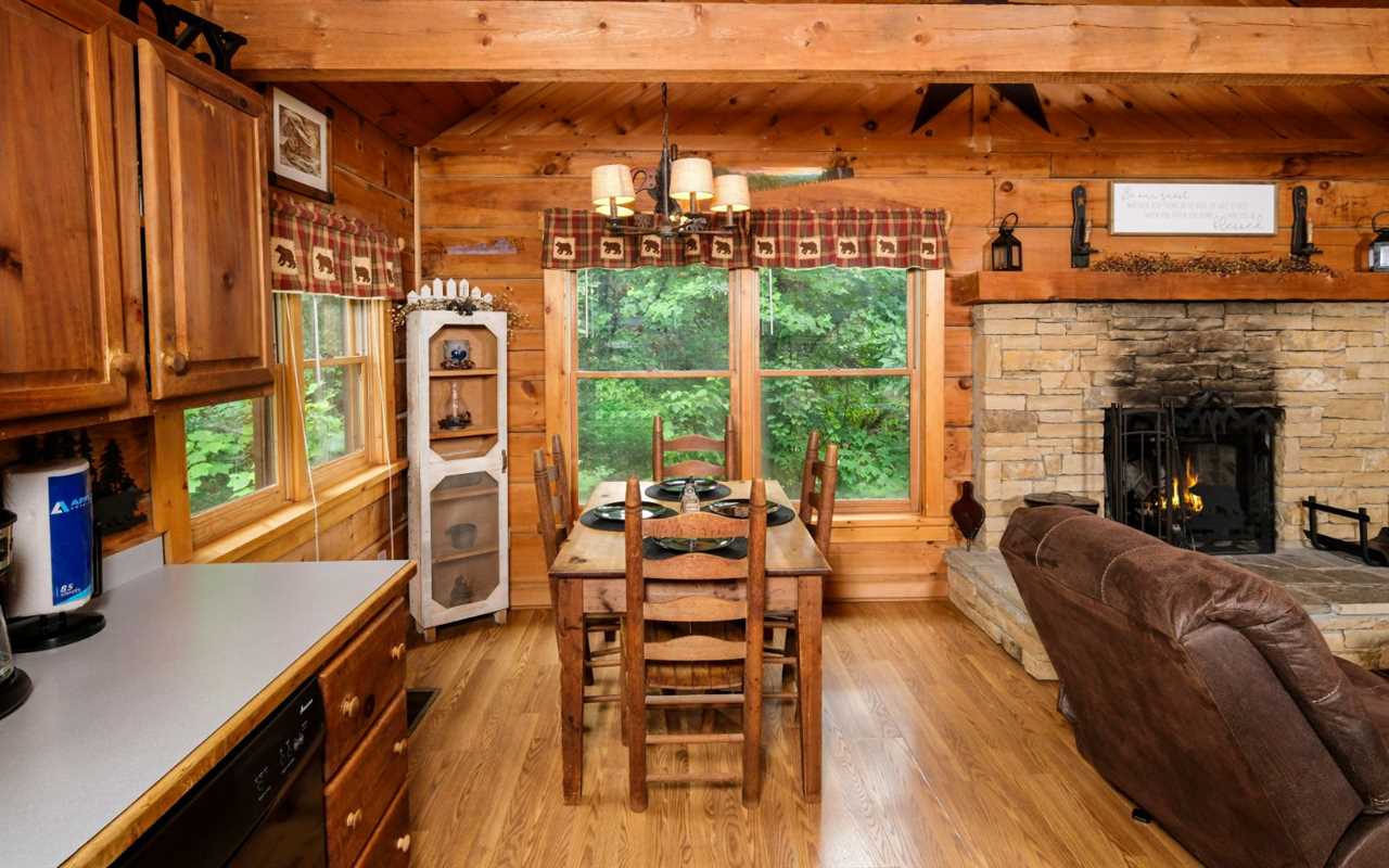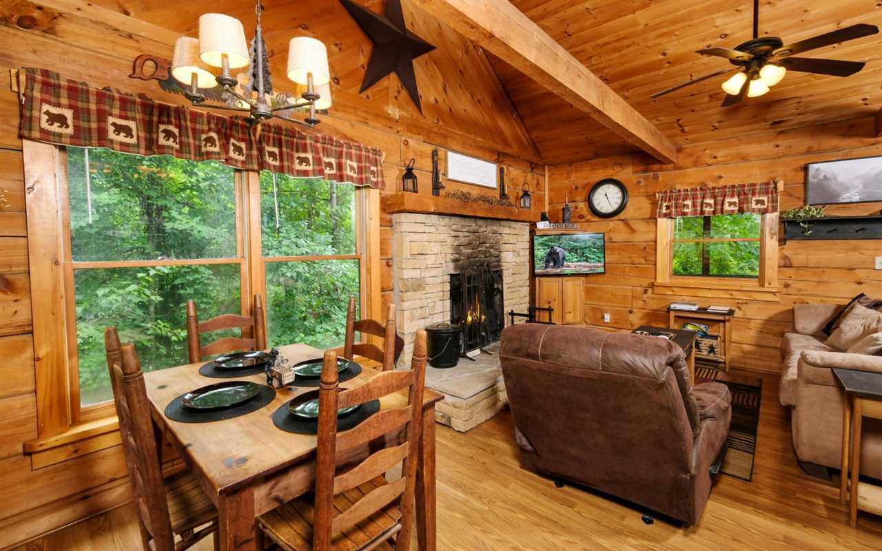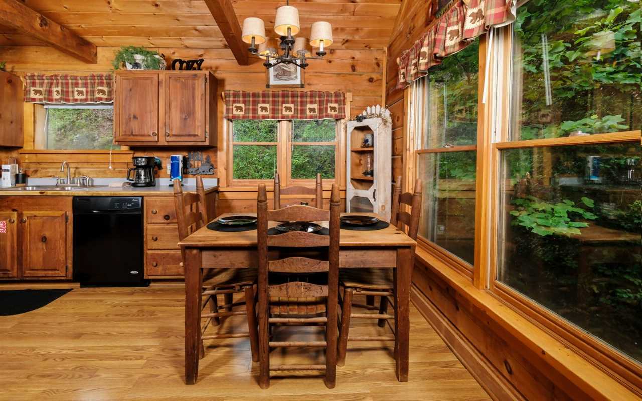 Enjoy meals or family game nights around the wooden dining table for four. A wildlife-themed chandelier and corner hutch add character and cabin charm. This space is just right for slow mornings with coffee or shared dinners after adventures in town.
