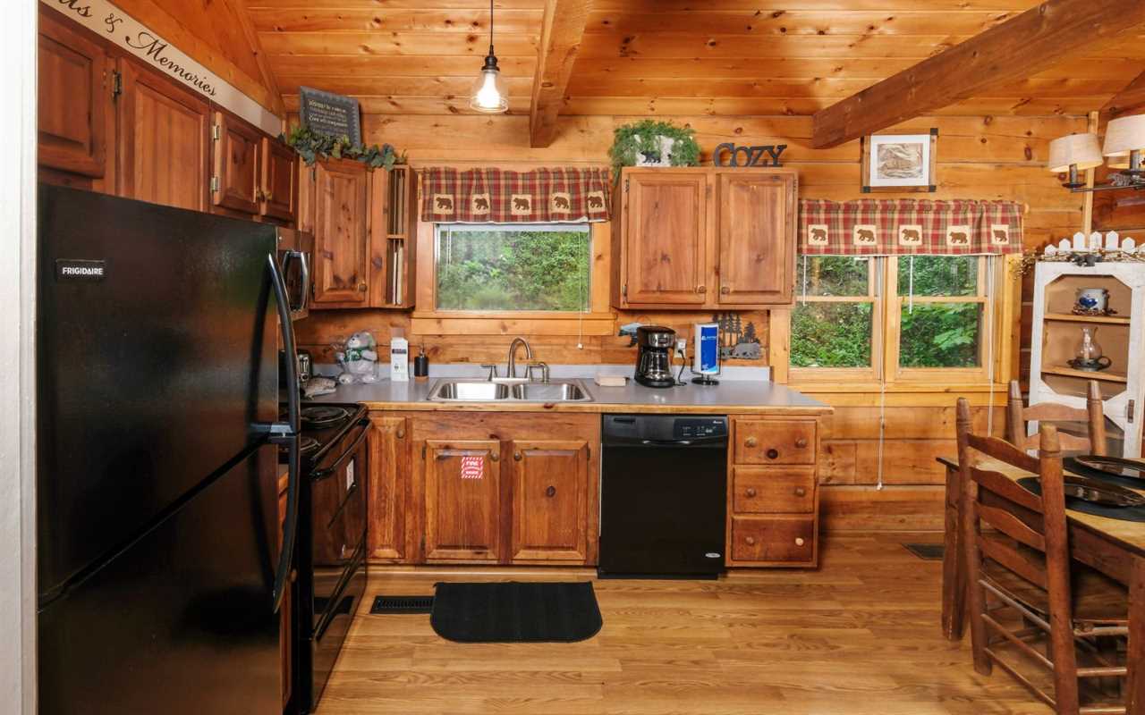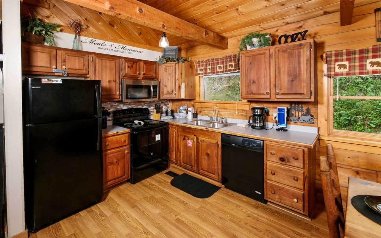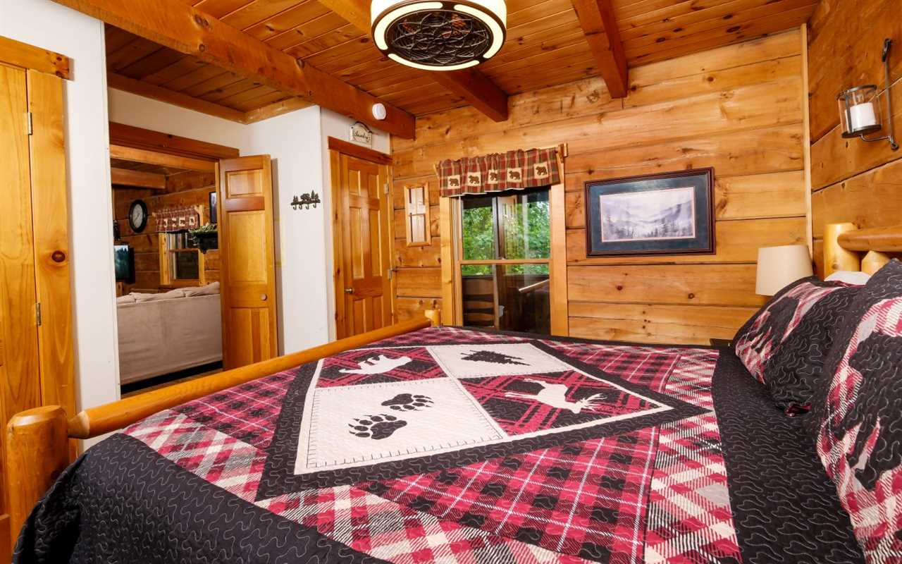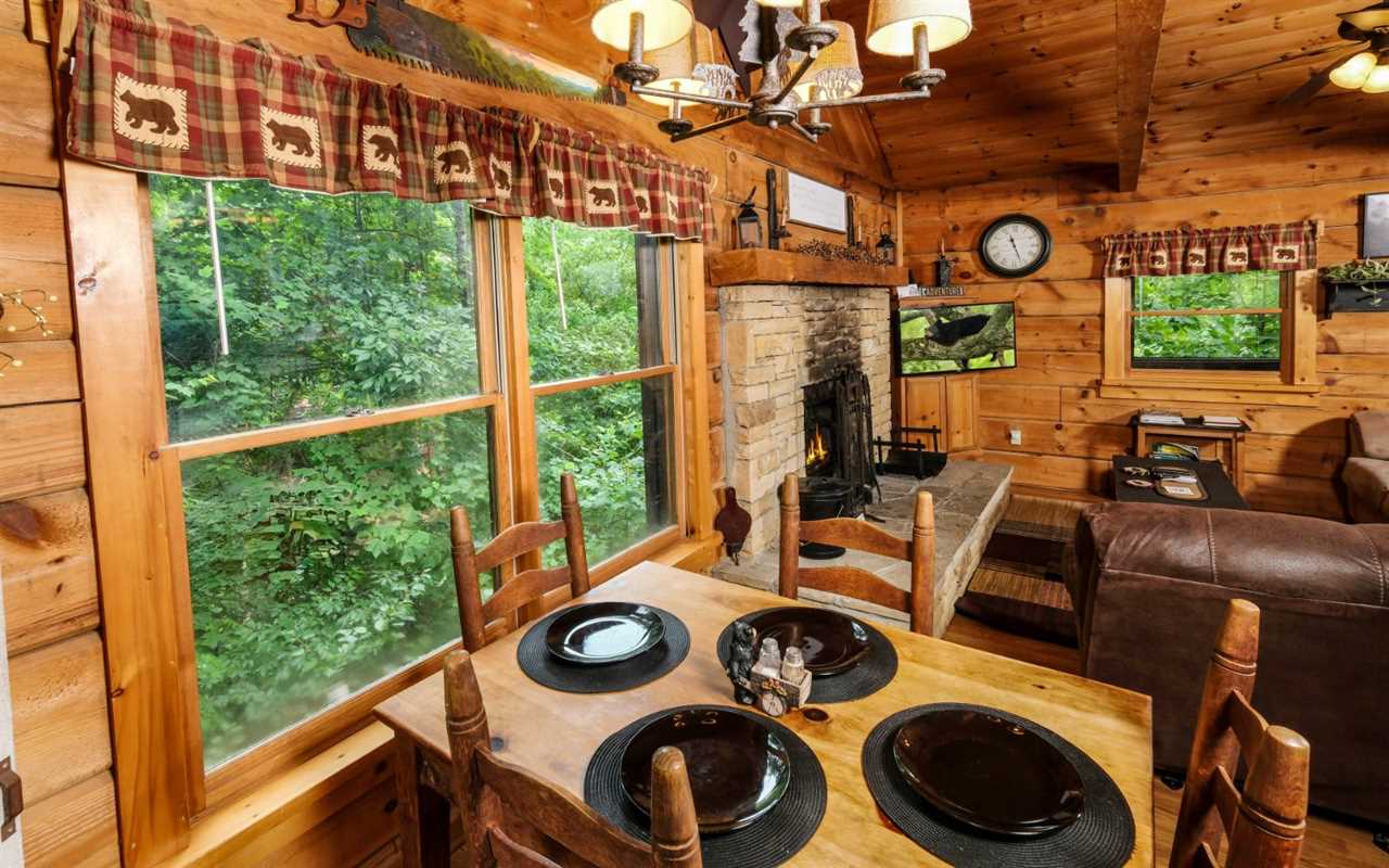 Enjoy meals or family game nights around the wooden dining table for four. A wildlife-themed chandelier and corner hutch add character and cabin charm. This space is just right for slow mornings with coffee or shared dinners after adventures in town.