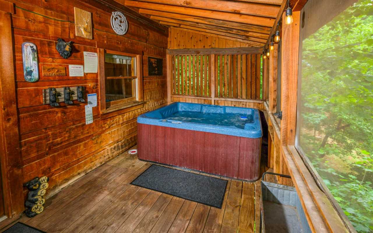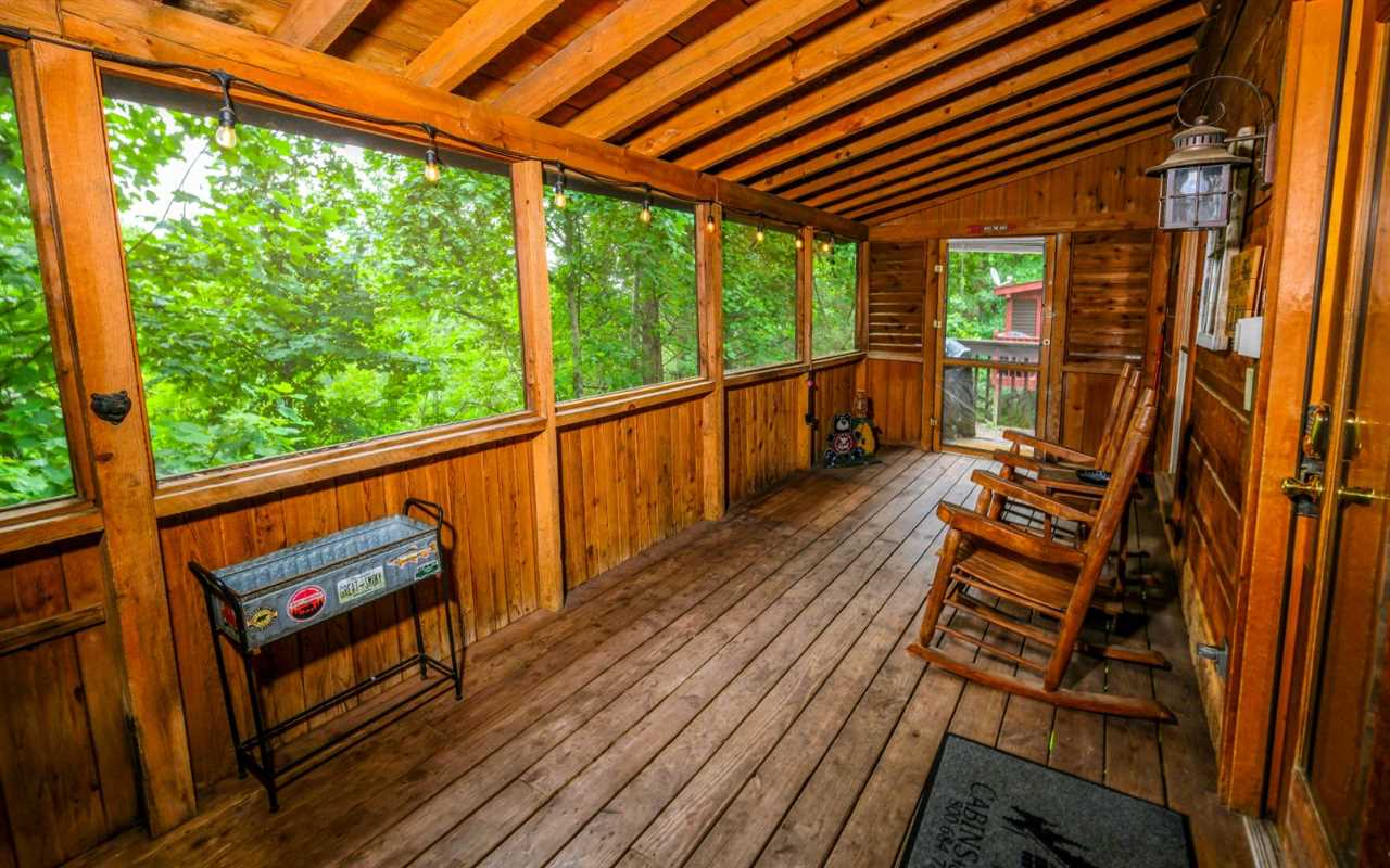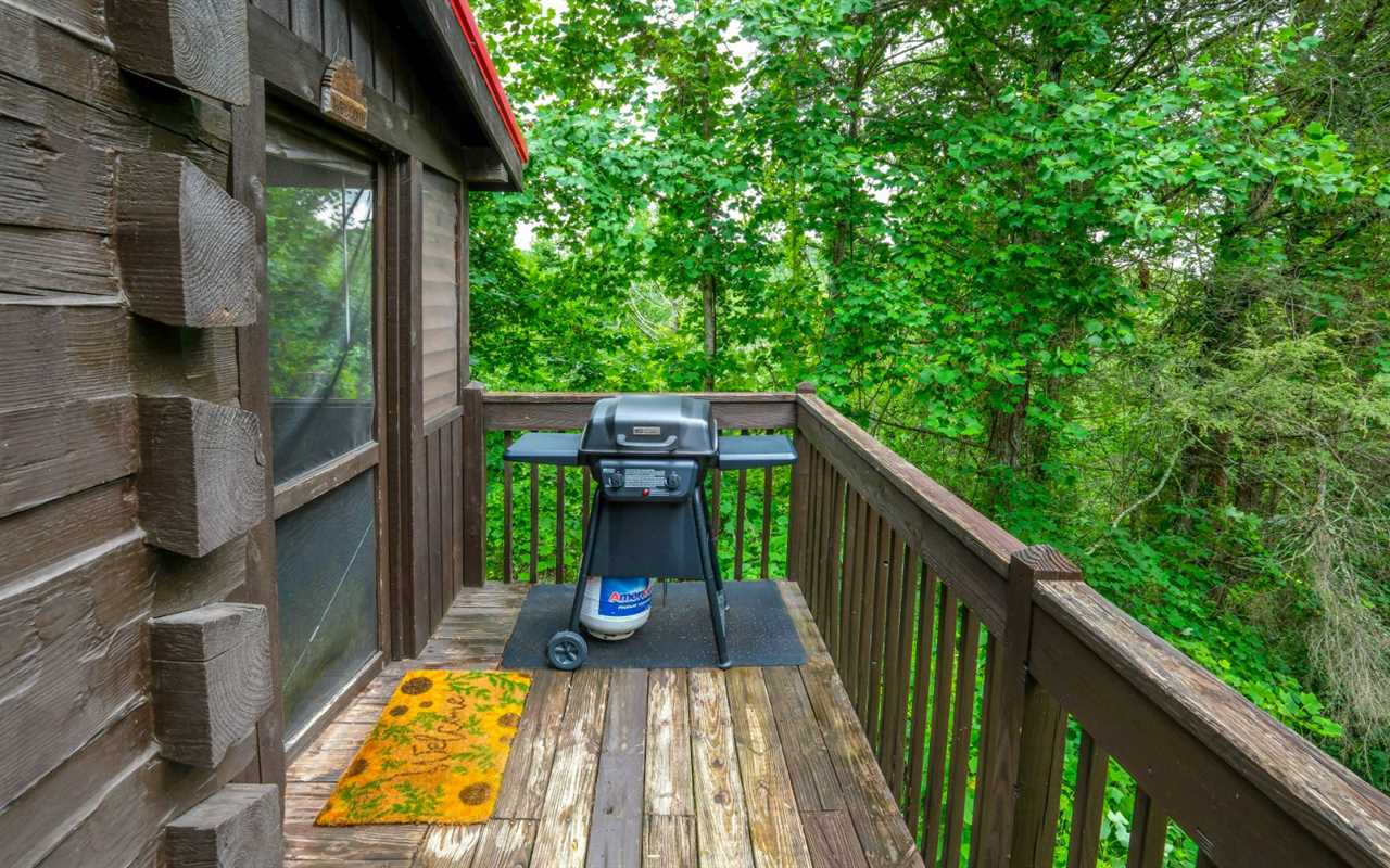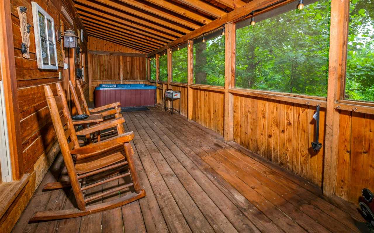 Step out to a screened-in deck surrounded by trees and peaceful woodland views. The bubbling hot tub offers a tranquil place to unwind, while rocking chairs and a side table invite you to sit back with a good book. Grill up your favorite meals on the gas grill and enjoy fresh mountain air all around.