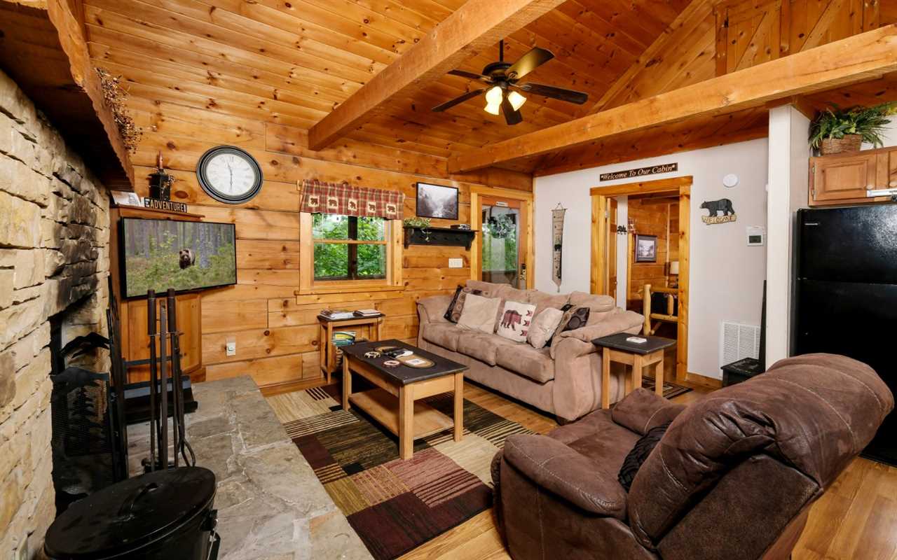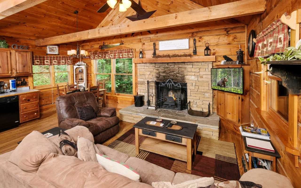 Gather in the heart of the home — a warm and welcoming living room that invites you to slow down. The stacked-stone, wood-burning fireplace adds ambiance for chilly nights, while the plush sofa and recliner offer comfortable seating. High ceilings, exposed beams, and hardwood floors complete the cozy yet open mountain lodge feel.