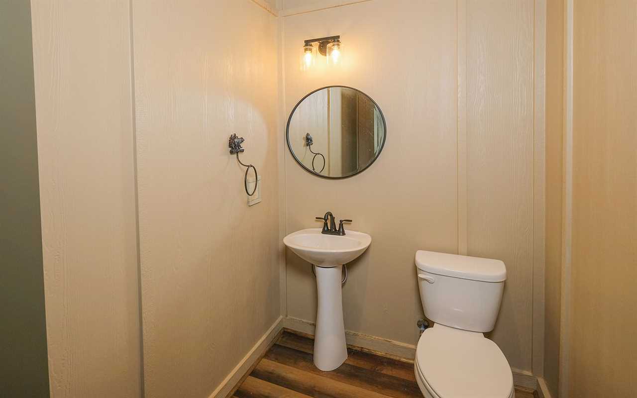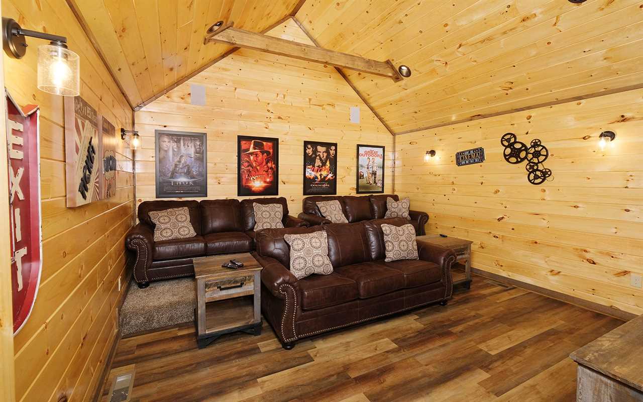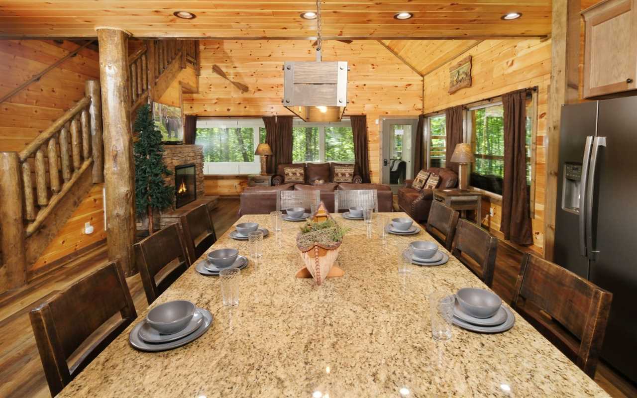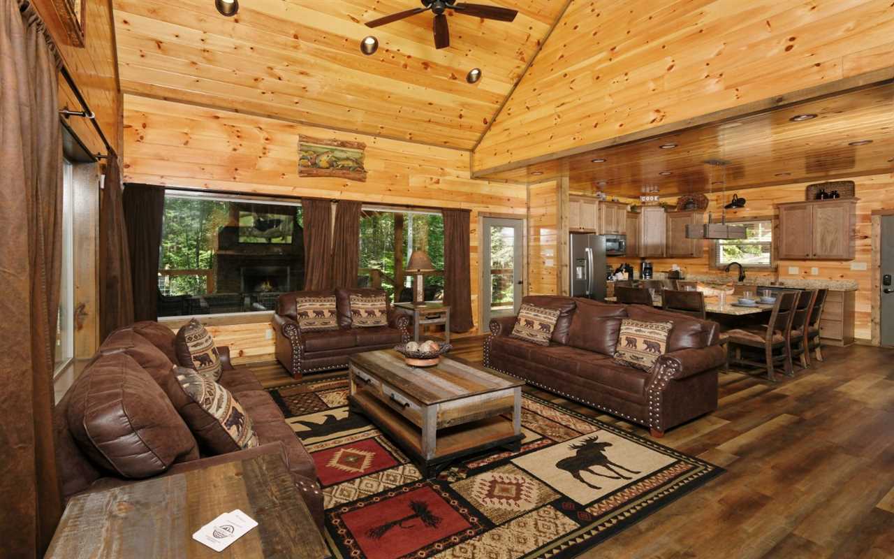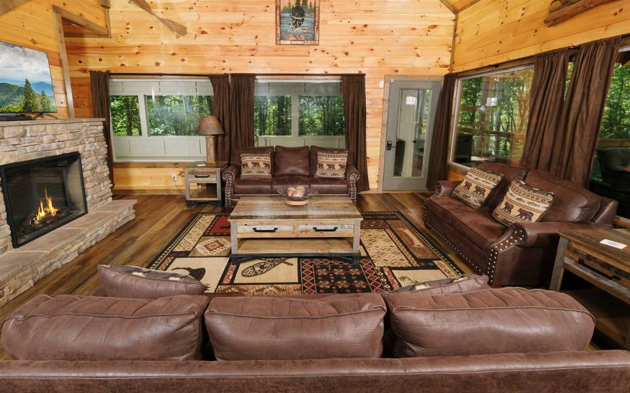 The living room is a modern mountain getaway, furnished with plush leather sofas flanking the stone fireplace. Play a board game on the coffee table, or flip on a lamp and get cozy with a good book.