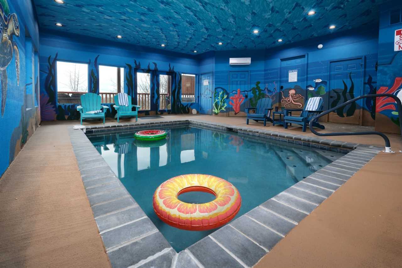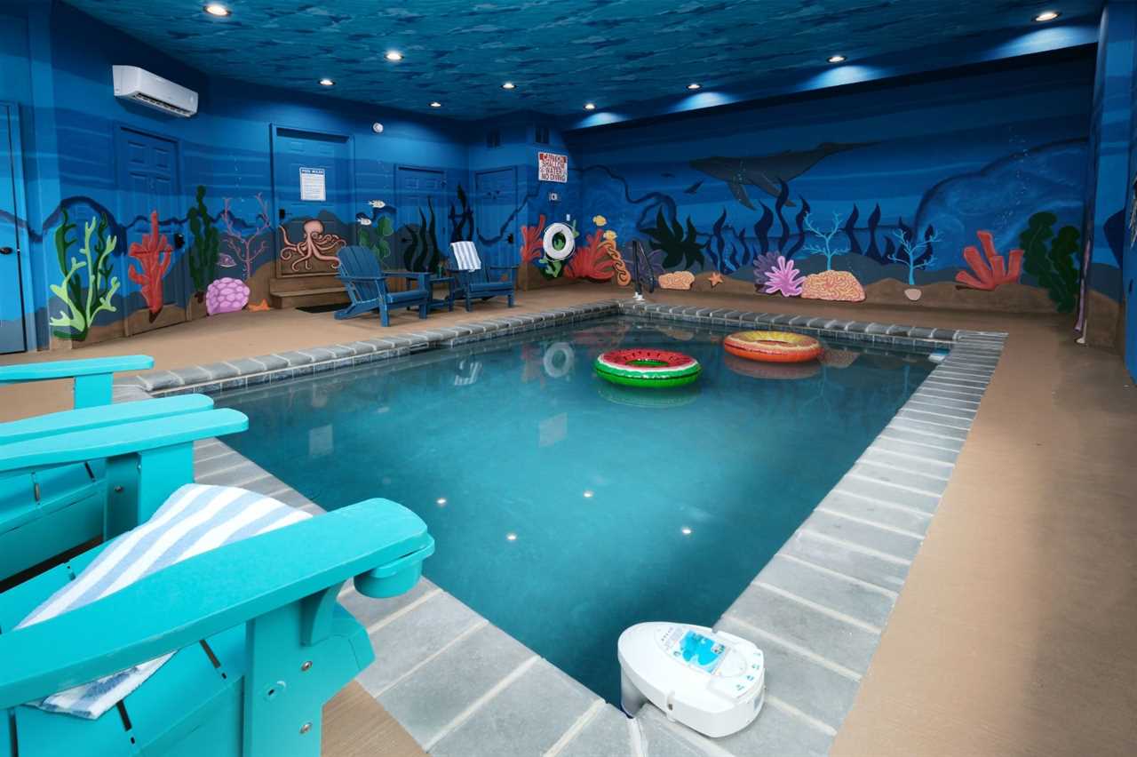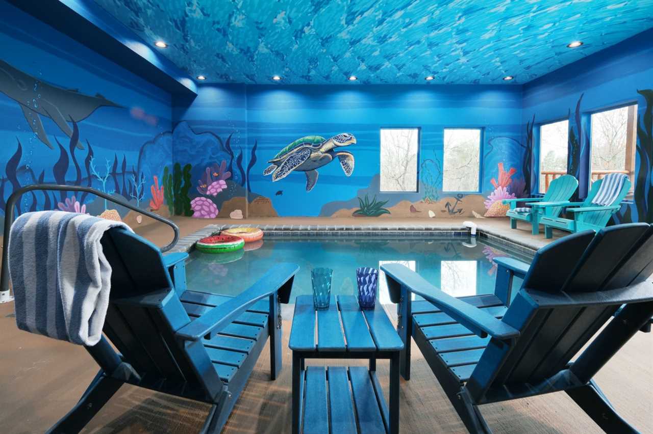 Sip your coffee in an Adirondack chair on the deck in the morning before whipping up a delicious breakfast in the fully equipped kitchen. Gather at the dining table for meals or use this space for your favorite board games and card games you brought along. For more fun, head to the rec space for game tables, arcade games, and comfortable seating as you hang out. And splash and wade all day or night in your private swimming pool with a gorgeous mural of sea life on all 4 walls and even the ceiling — a unique Smoky Mountain experience!
