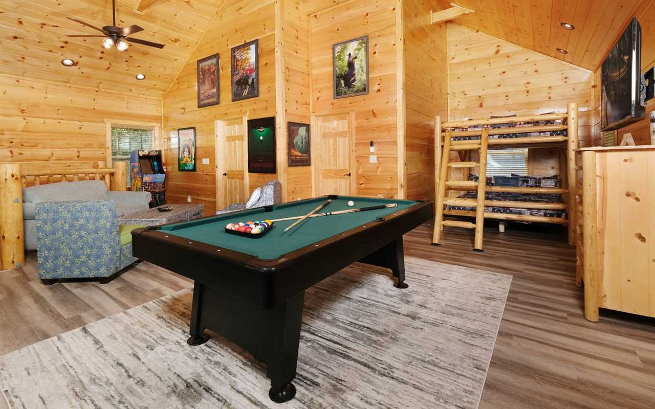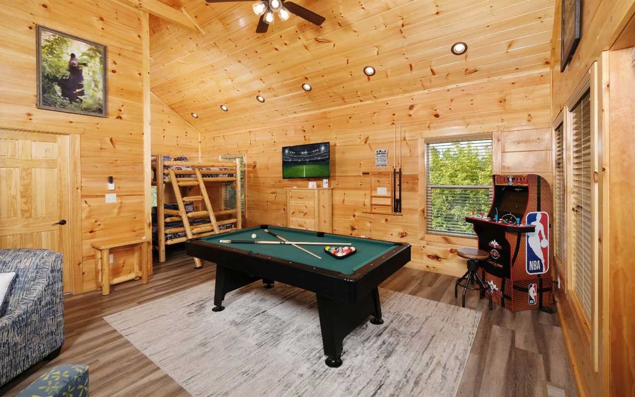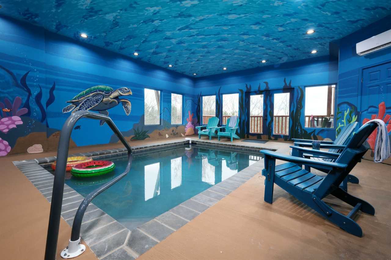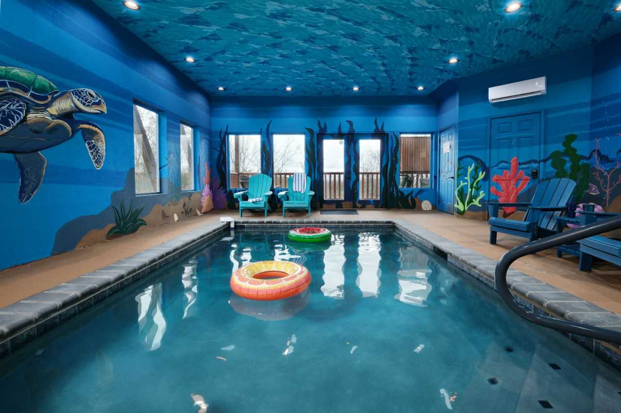 Sip your coffee in an Adirondack chair on the deck in the morning before whipping up a delicious breakfast in the fully equipped kitchen. Gather at the dining table for meals or use this space for your favorite board games and card games you brought along. For more fun, head to the rec space for game tables, arcade games, and comfortable seating as you hang out. And splash and wade all day or night in your private swimming pool with a gorgeous mural of sea life on all 4 walls and even the ceiling — a unique Smoky Mountain experience!