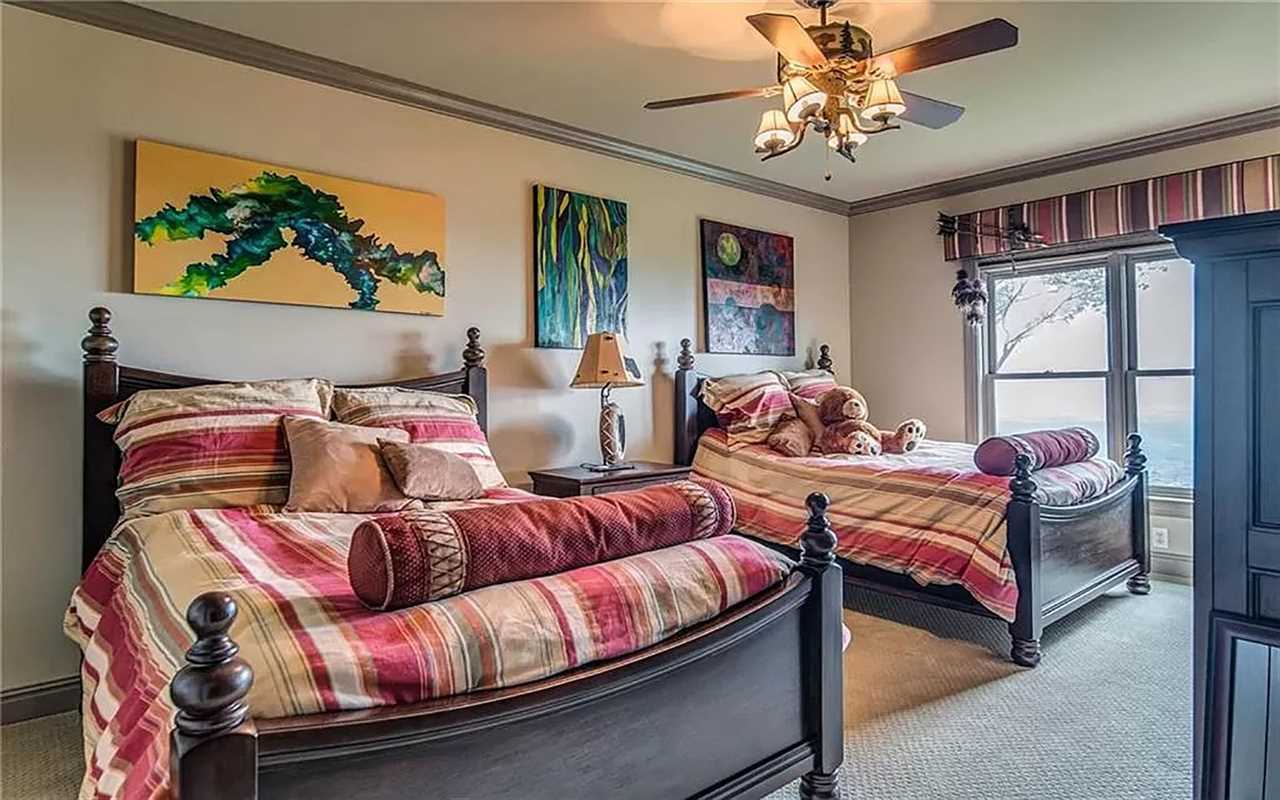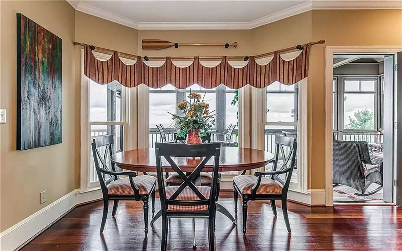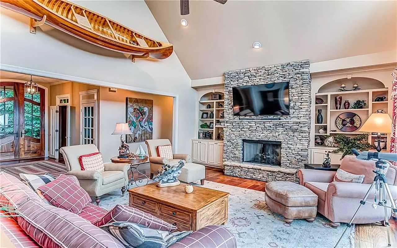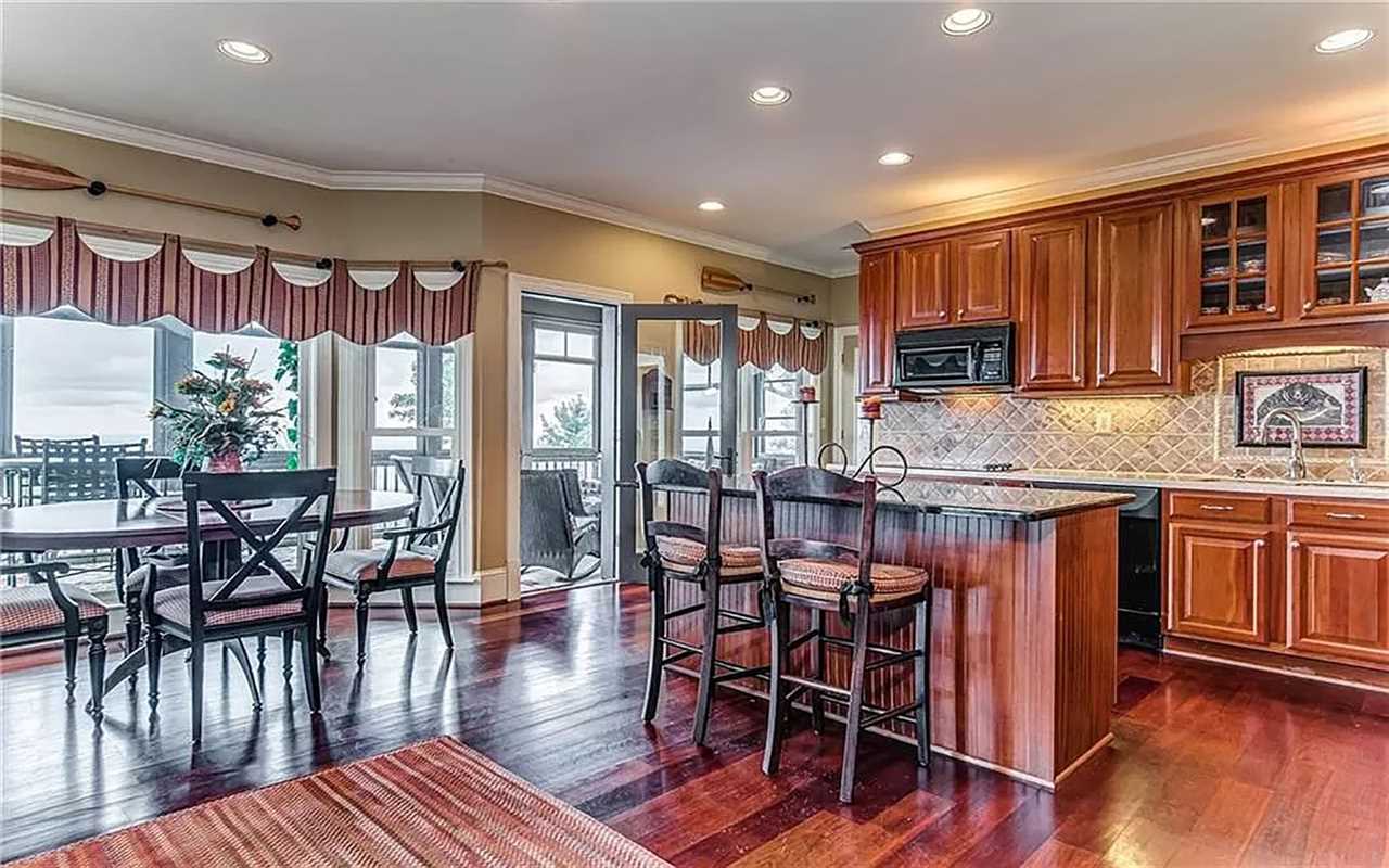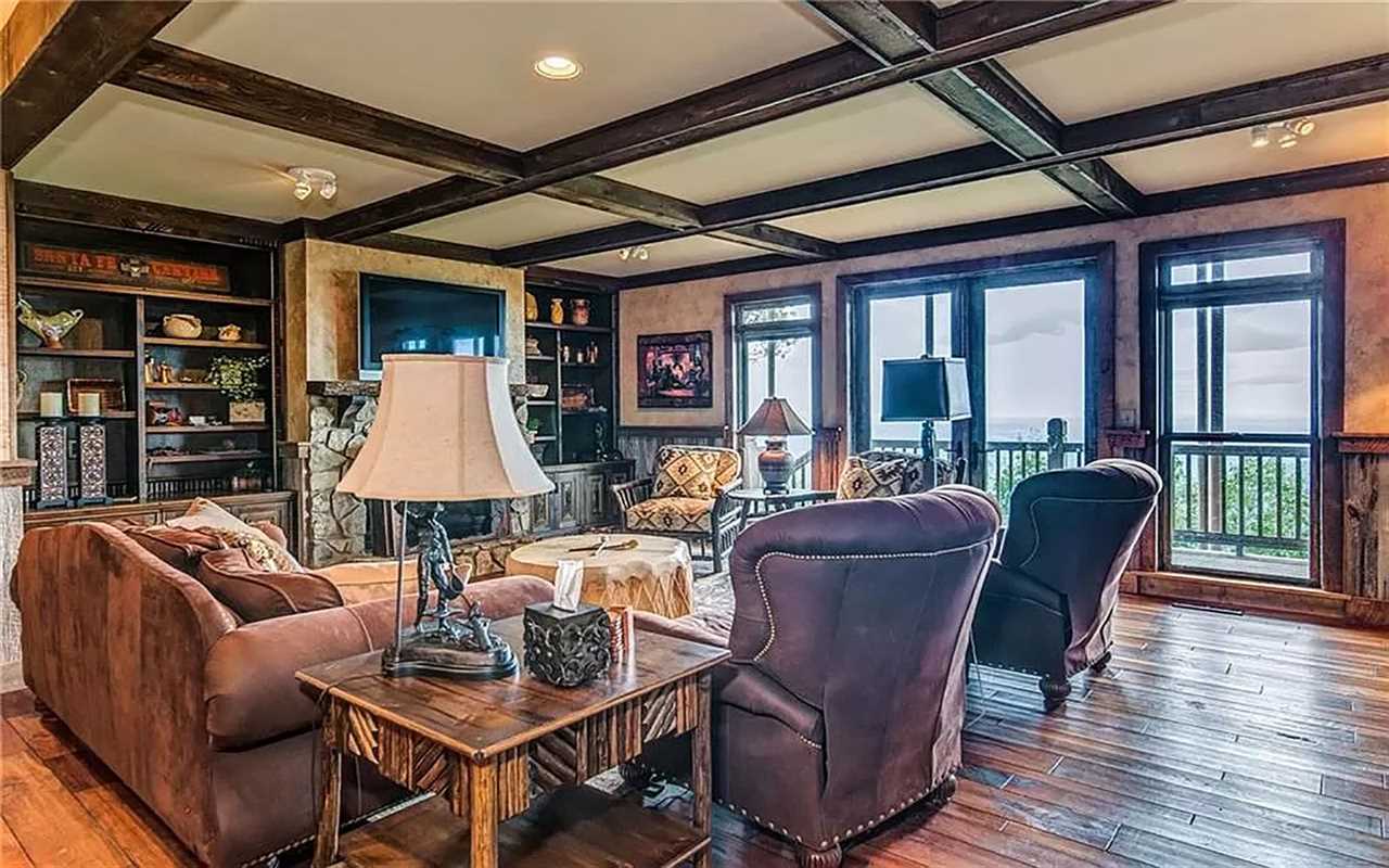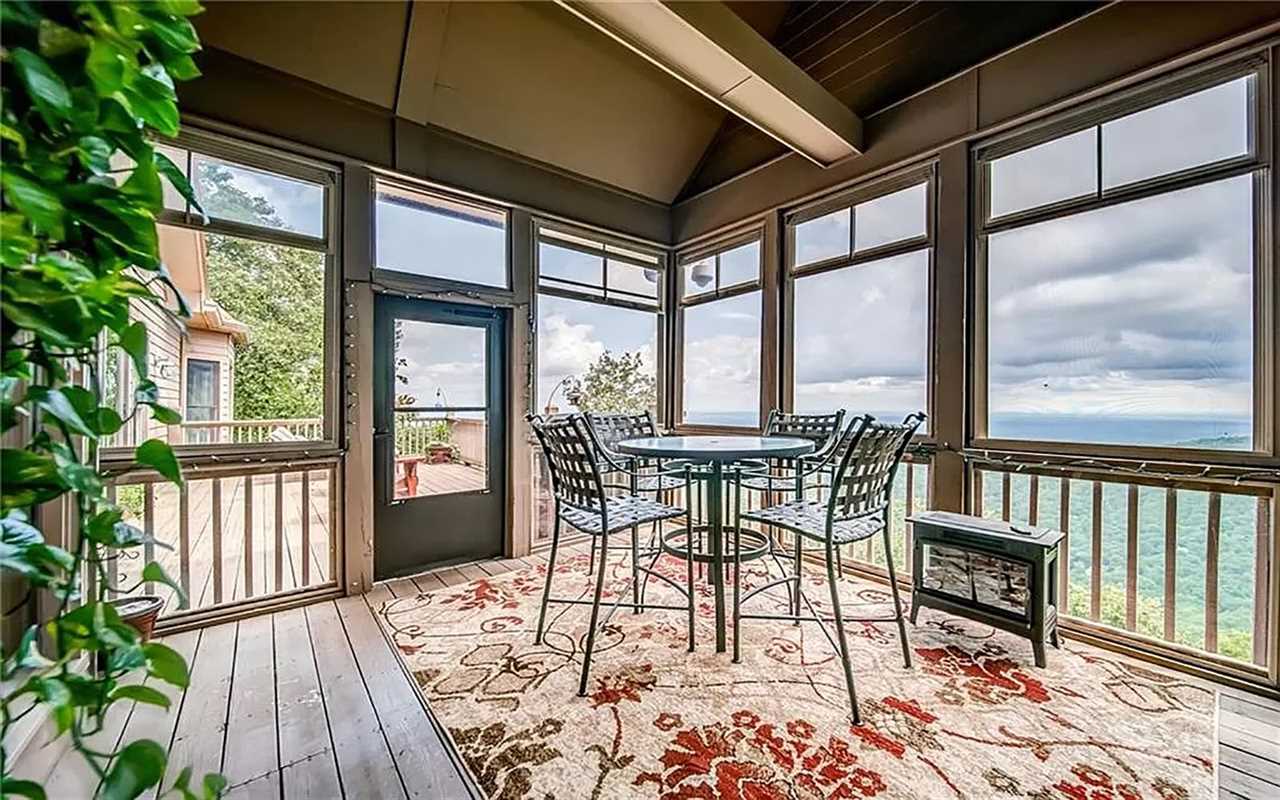 A second living area at this Big Canoe rental has another fireplace, luxe seating, and another big screen TV. Bedrooms include king and queen beds, along with convenient bathrooms for guests. The gourmet kitchen boasts dishes, appliances, and plenty of cooking tools, and there are 2 great dining spaces inside. This North Georgia mountain lodge also has a washer/dryer and Wi-Fi.