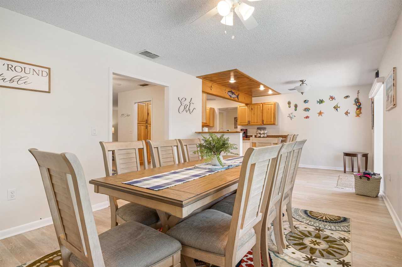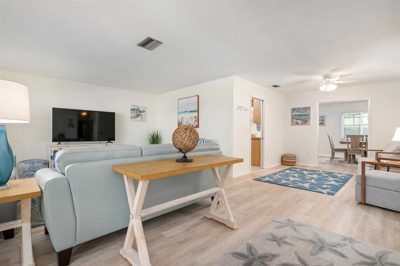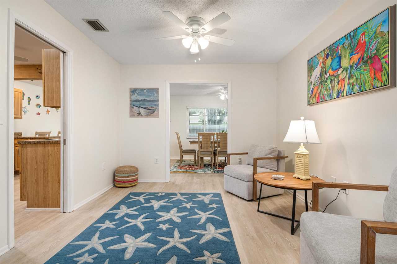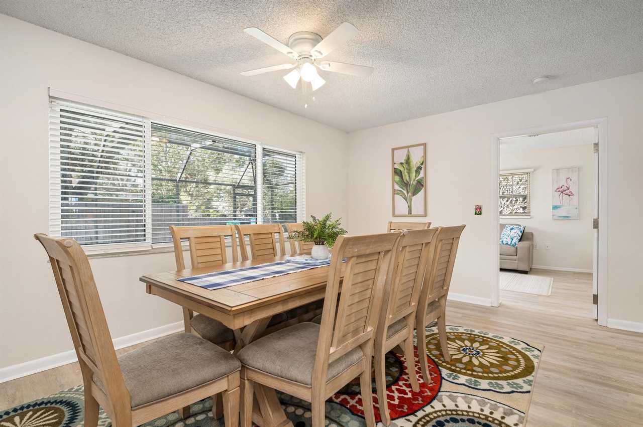 Pulling up to the property, you will be greeted by lush tropical flora and well-maintained landscaping that will make you feel like you are in paradise. When entering the home you will be greeted by a cozy living room with plenty of seating, including 2 leather couches, and a large smart TV. From here you can walk straight through to another seating area that leads to the kitchen and dining rooms. The kitchen offers stainless steel appliances for your use and also includes all the dishes, utensils, and cookware you would need to make all of your favorite meals from home. The dining room has a table that comfortably sits 8 and has plenty of natural light coming through the window behind it.